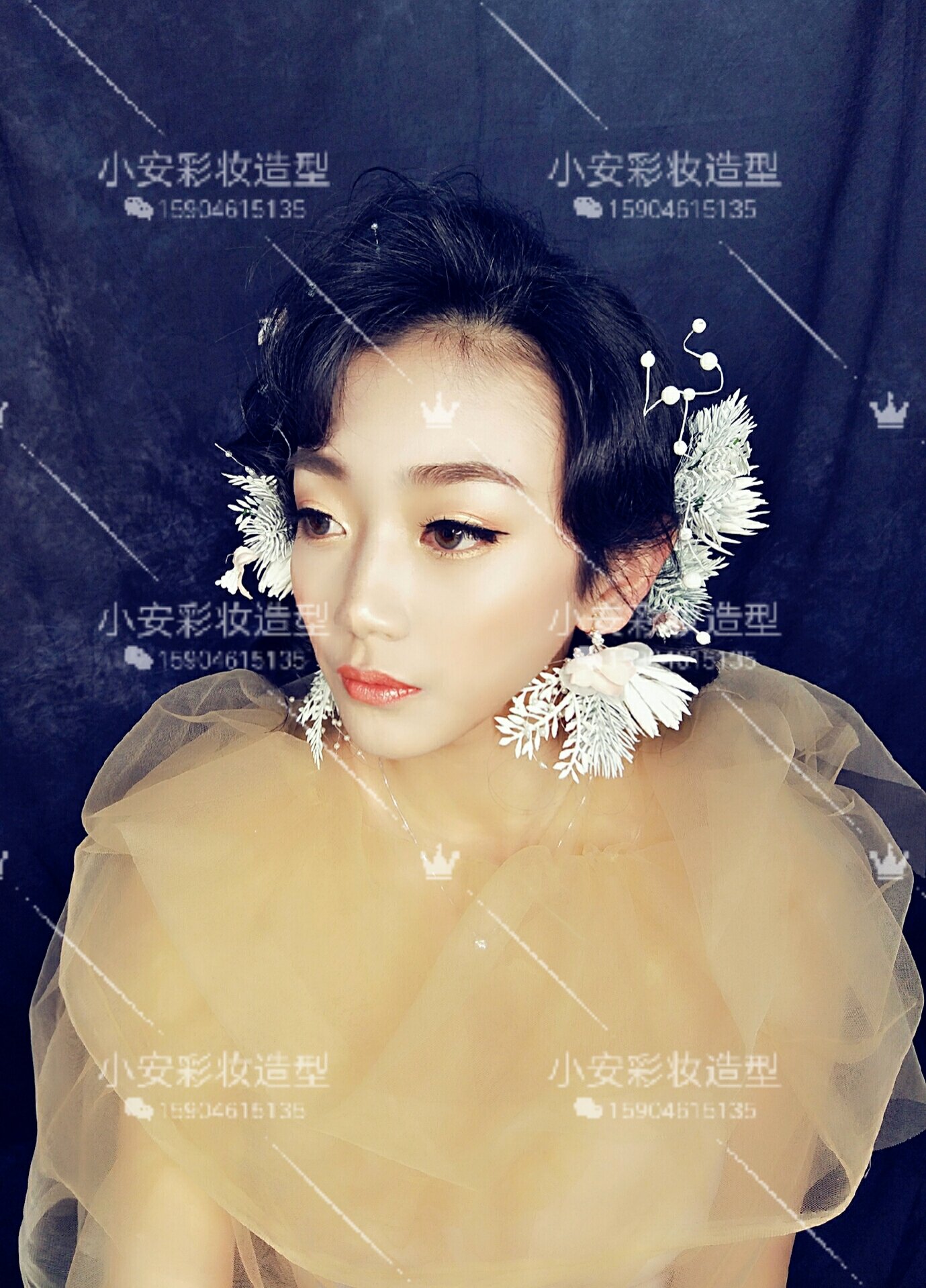 再就是根据新娘的自身条件,身材比例,做好造型设计。
