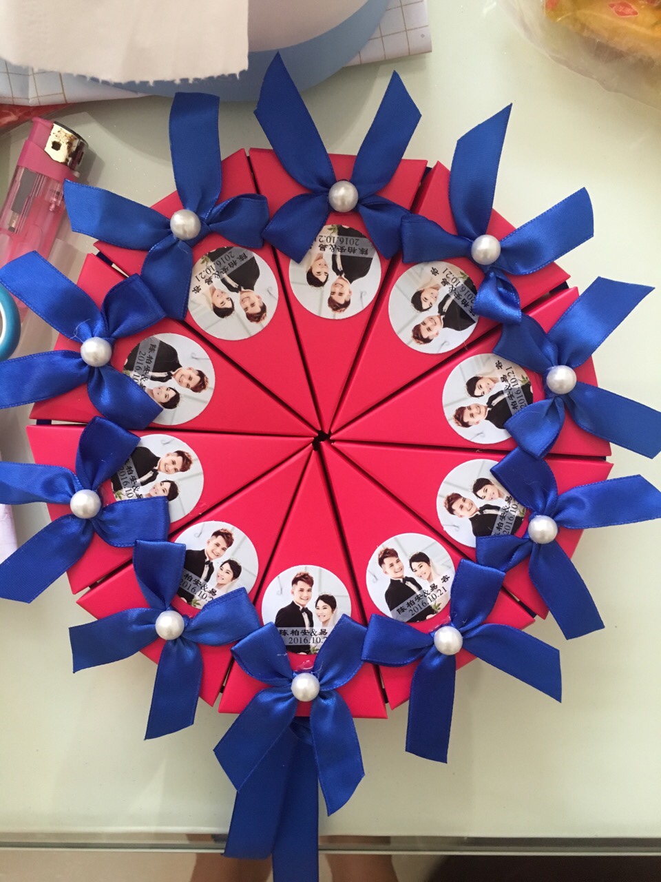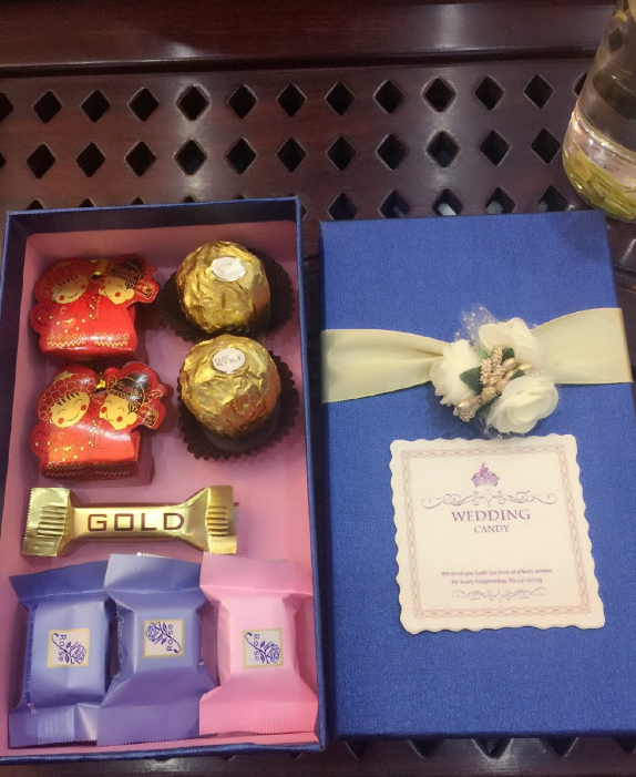 喜糖盒放了8颗糖,里面放的都是我喜欢的巧克力和糖果,在超市买的