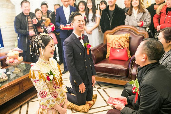 8、婚礼仪式新人走上舞台站定后,新郎应该握住新娘的手。