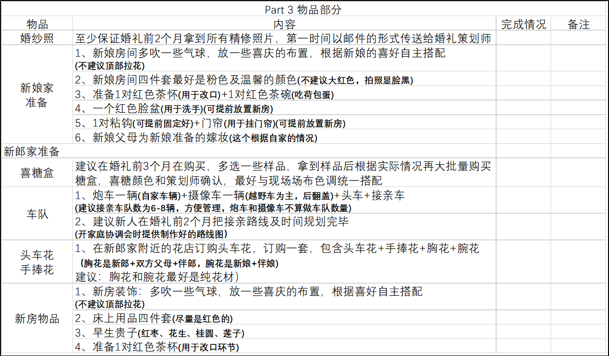 5、婚品小物  女方还要购买一些结婚要用到的小物品,比如请柬、喜糖盒、红包、堵门道具、手捧花、胸花、对联等。还要准备婚礼急救包,里面一般有充电宝、吸管、别针、针线等。