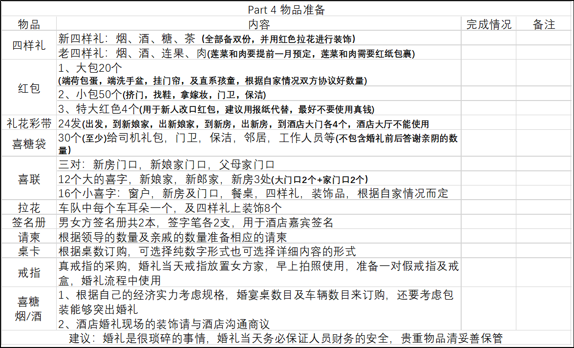 5、婚品小物 女方还要购买一些结婚要用到的小物品,比如请柬、喜糖盒、红包、堵门道具、手捧花、胸花、对联等。还要准备婚礼急救包,里面一般有充电宝、吸管、别针、针线等。