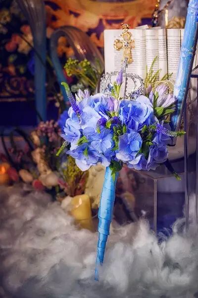 纯净的蓝色通常可以让我们联想到天空、海洋、宇宙,蓝色代表的是冷静、理智、勇气和永不放弃。蓝色的手捧花比较适合在夏天使用,它能够给婚礼带来一丝清凉感。新娘选择蓝色的手捧花可以混入一些纯洁的白色或者亮眼的黄色,这样的色彩搭配与新娘的白色婚纱相互映衬,美丽妙不可言。