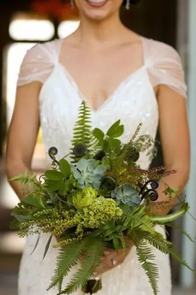 嫌那些大红大绿的花朵太艳俗?品种太单一?如果普通的花朵已经不能满足你的对个性婚礼的追求,那么你可以大胆地选取其他绿色植物来制作手捧花,如这一束由象征着至死不渝的爱荚莲、花毛茛、斗篷草和绿兰,组成的浓淡相间、层次分明的纯绿色植被捧花,个性鲜明,绝不雷同。
