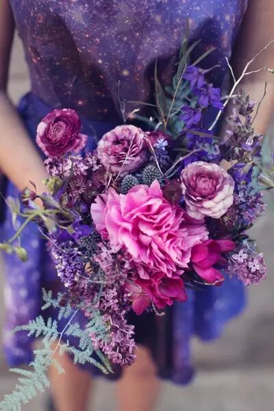 紫色是一个神秘的富贵的色彩,有一种"紫气东来"的感觉,只看紫色手捧就能知道一场浪漫到极致的婚礼即将举行。如果你是一位干练直率,透露着某种霸气的新娘,那么紫气逼人的手捧花绝对适合你。