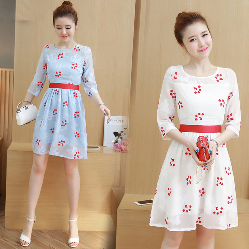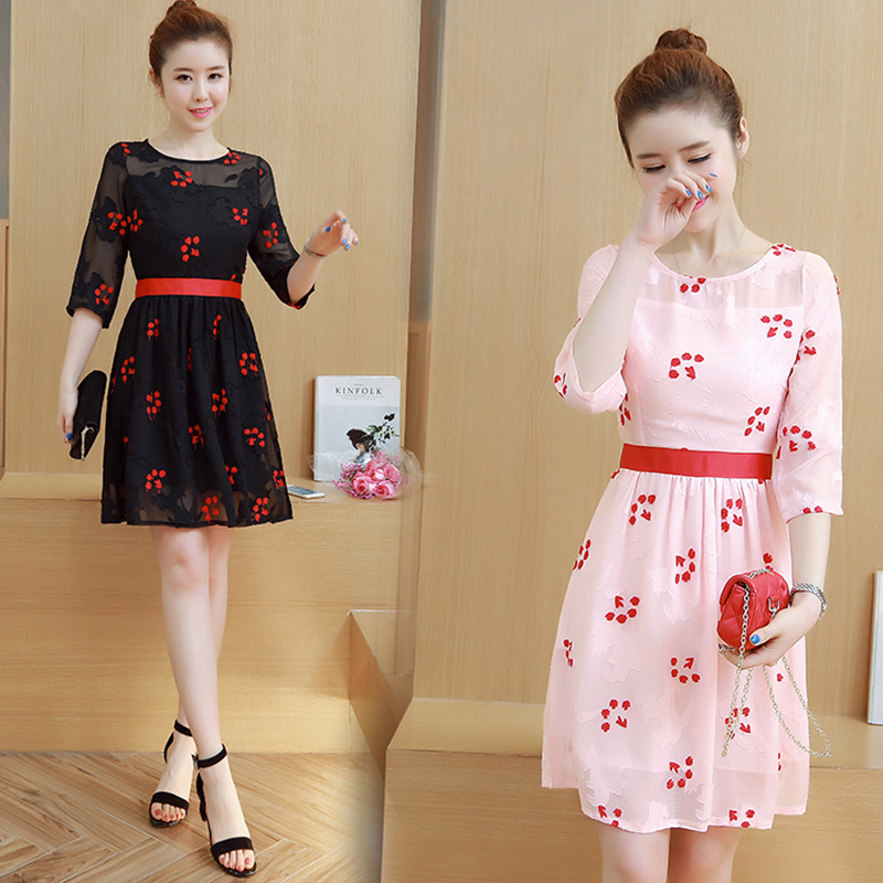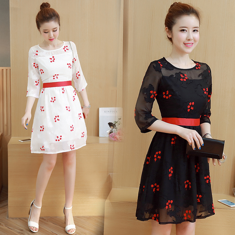• 2017新款中袖裙子百搭中裙韩版花朵刺绣网纱修身显瘦连衣裙女