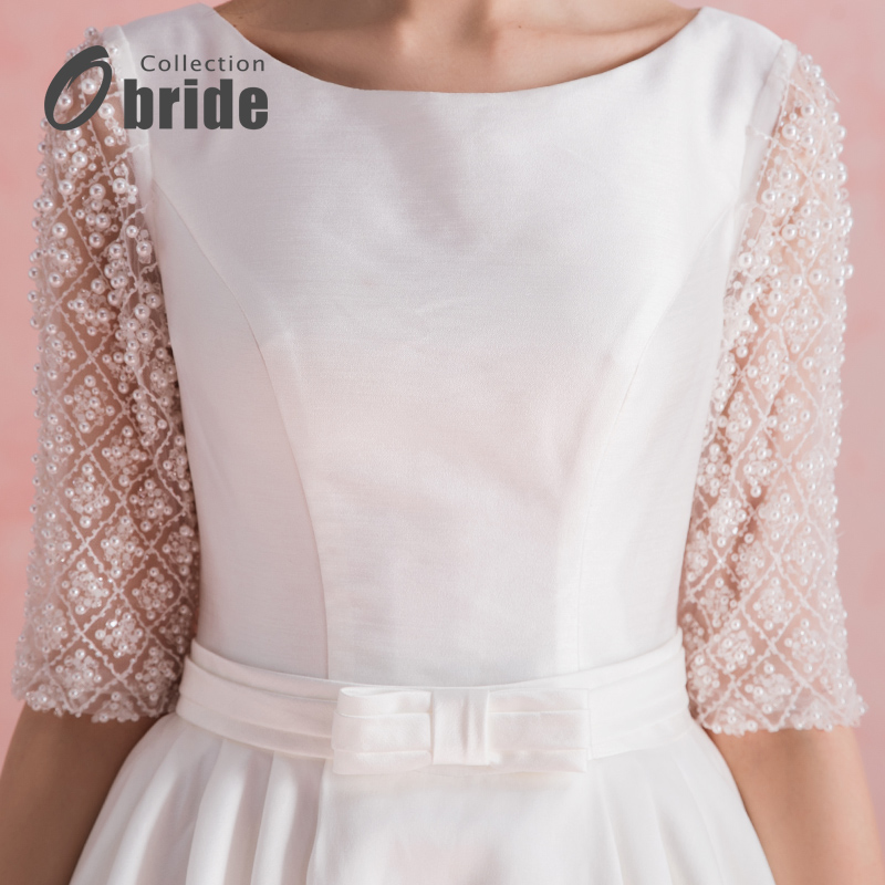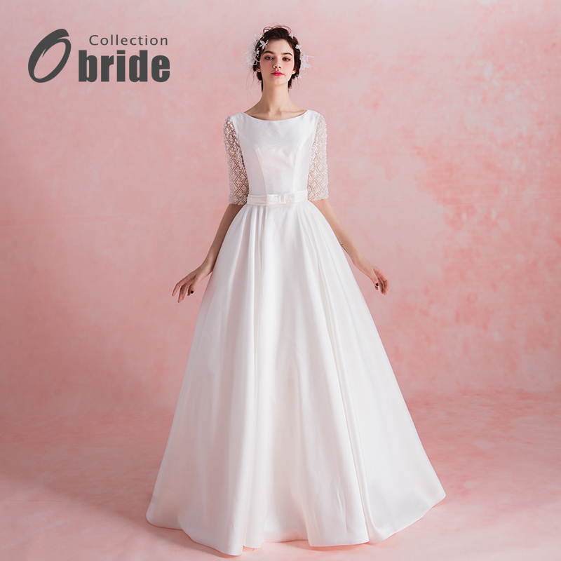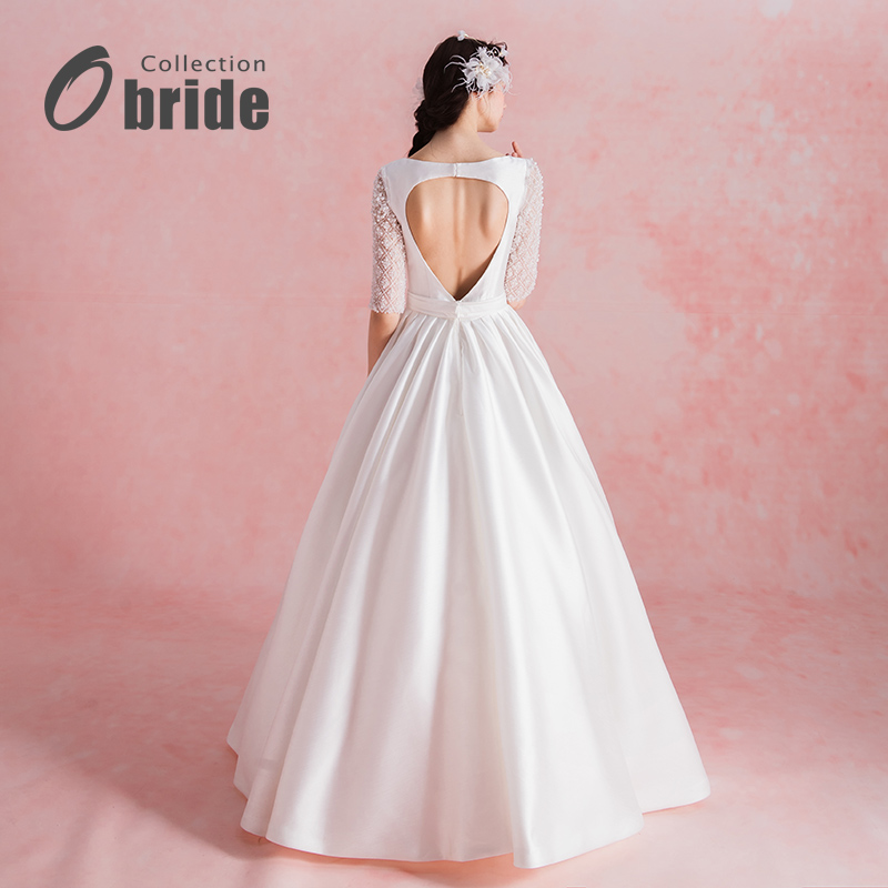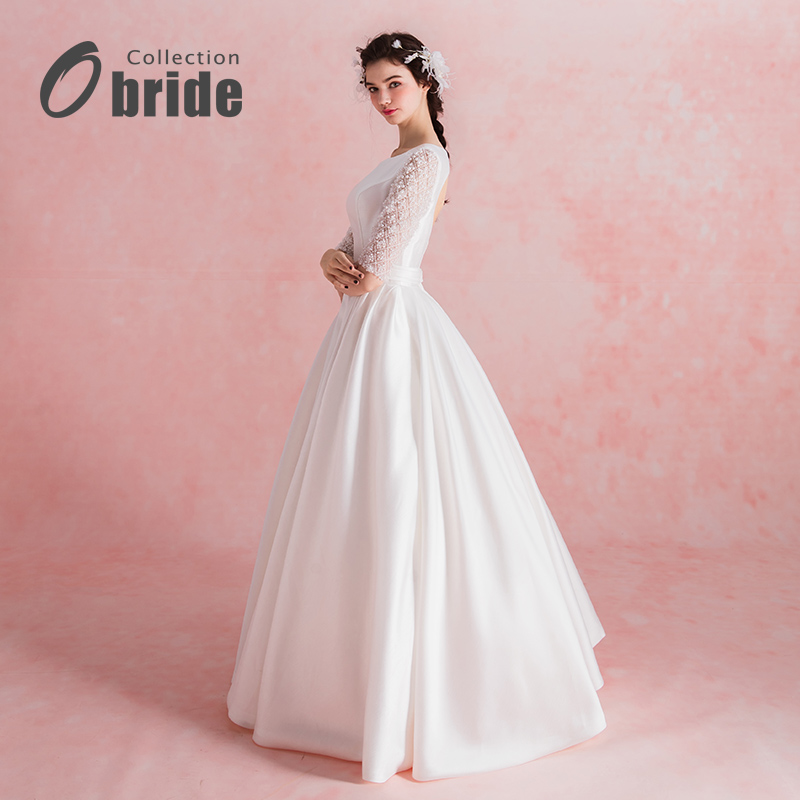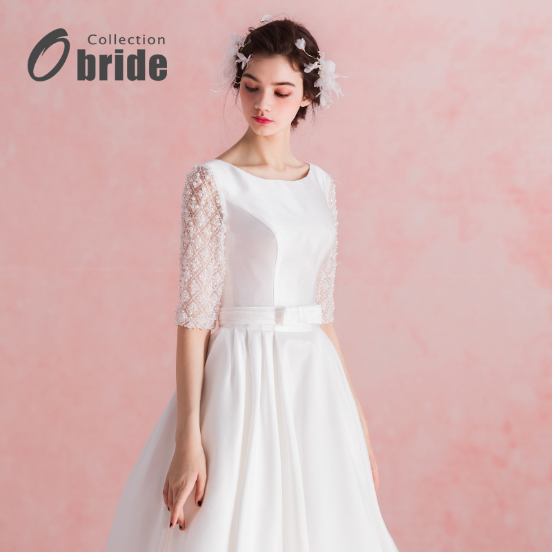 Obride17年新款婚纱礼服中袖高档缎面简约齐地婚纱新娘结