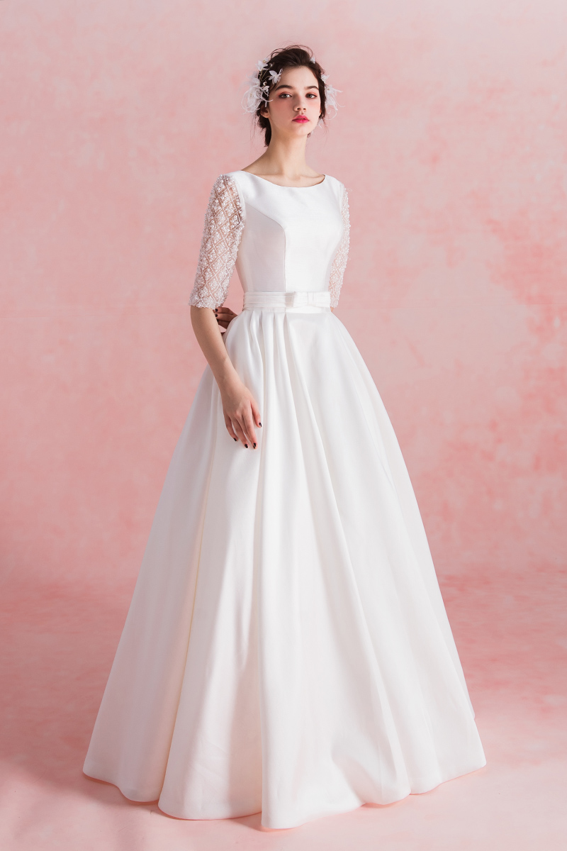 • Obride17年新款婚纱礼服中袖高档缎面简约齐地婚纱新娘结