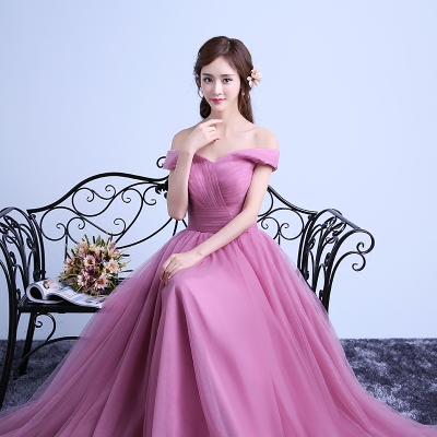 • 敬酒服2017夏季新款一字肩长款紫色新娘结婚婚礼修身宴会晚礼