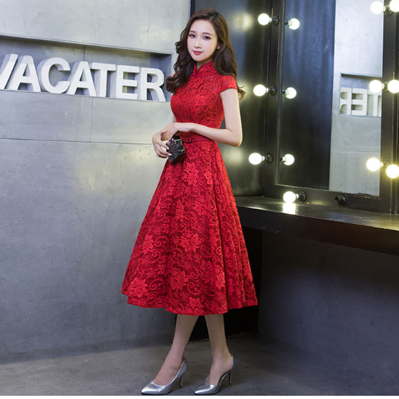 • 2017新款韩式蕾丝红色中长款新娘中式结婚敬酒服修身宴会晚礼