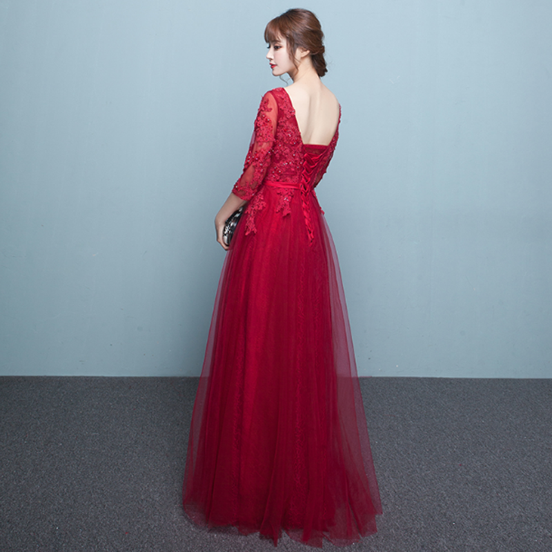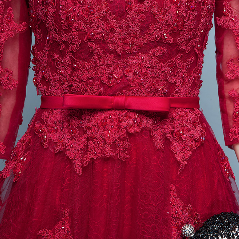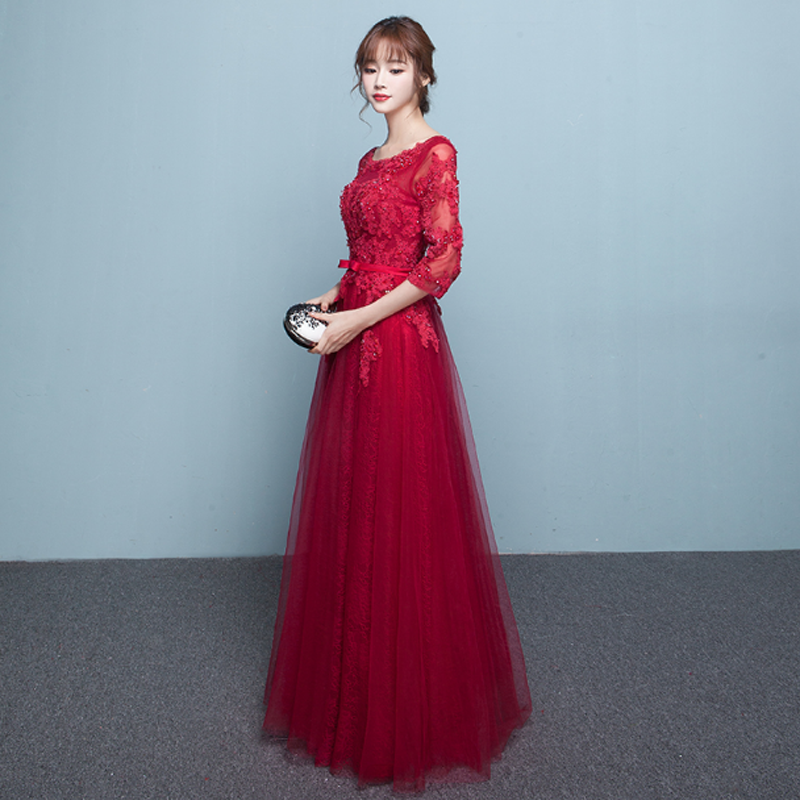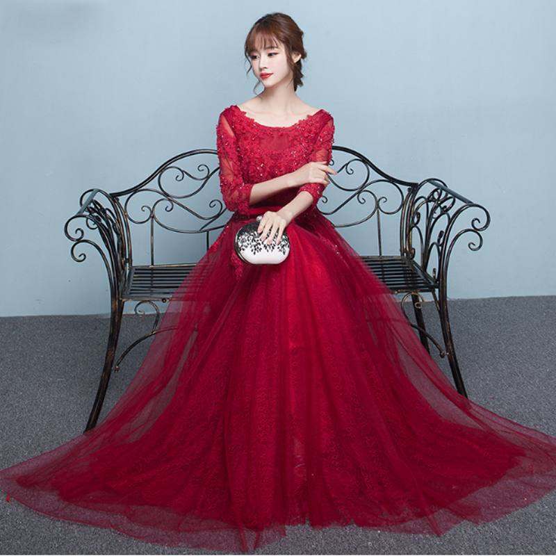• 新娘敬酒服2017春夏新款韩式红色结婚中袖礼服蕾丝长款宴会晚