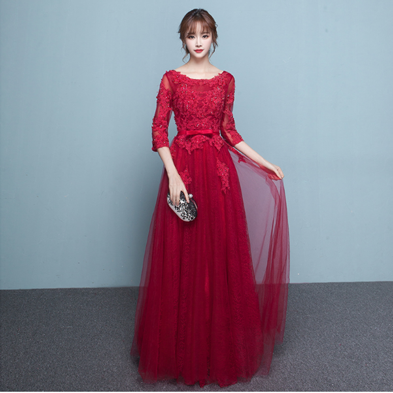 新娘敬酒服2017春夏新款韩式红色结婚中袖礼服蕾丝长款宴会晚