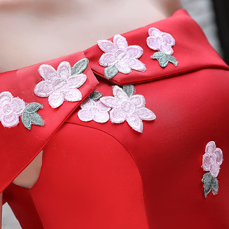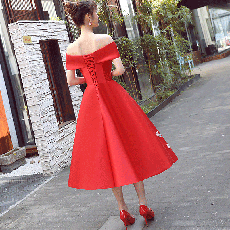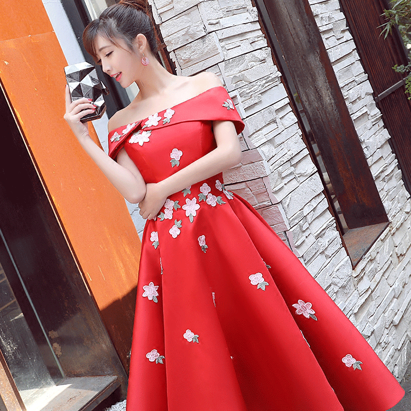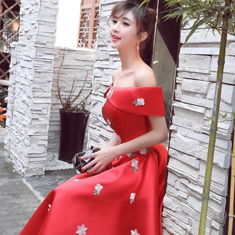 • 2017红色敬酒服新娘高腰孕妇婚礼一字肩订婚宴会小礼服女修身