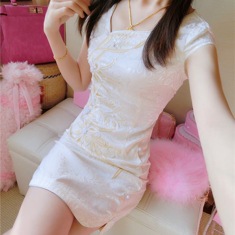 • 夏季新款性感斜V领刺绣钉珠改良旗袍短裙修身甜美粉色连衣裙