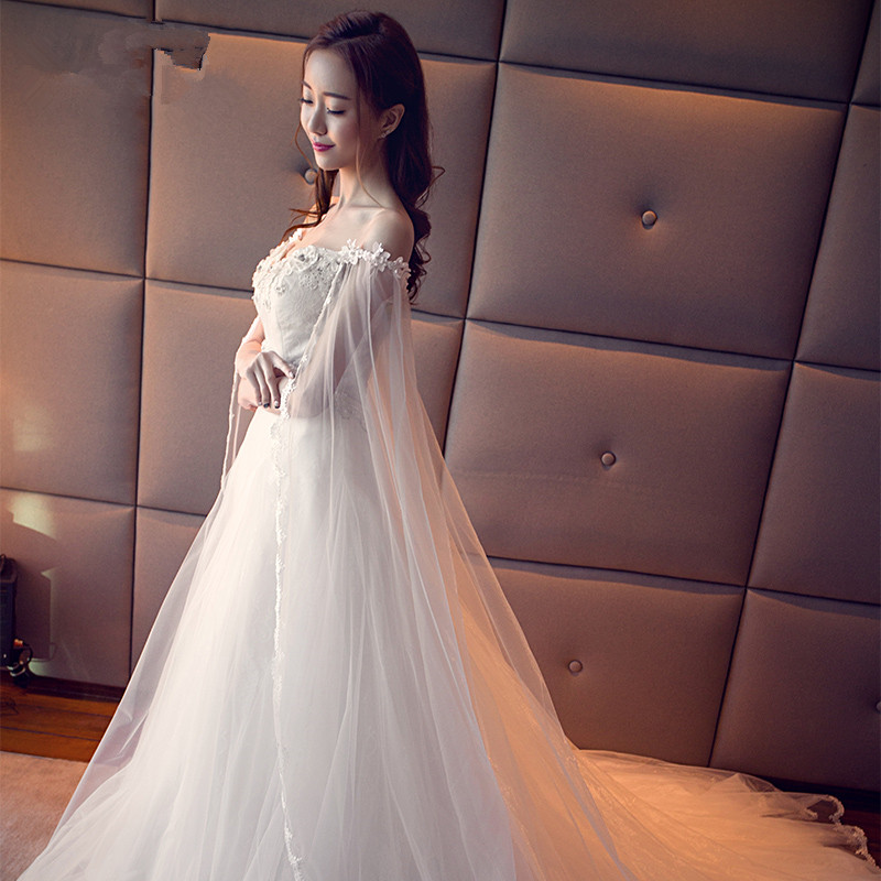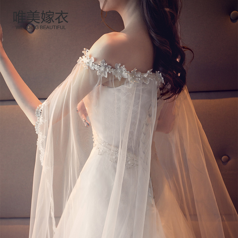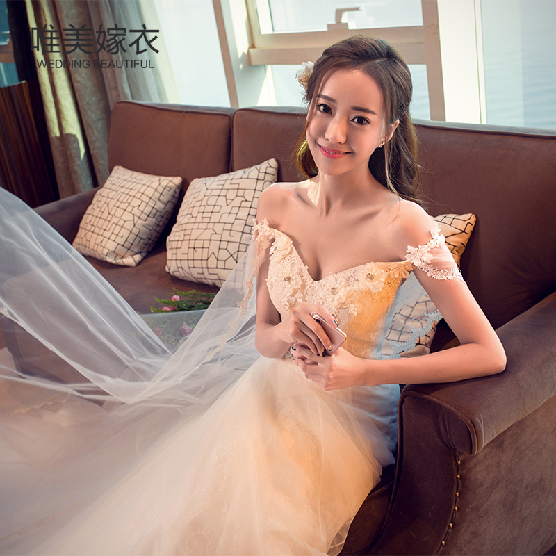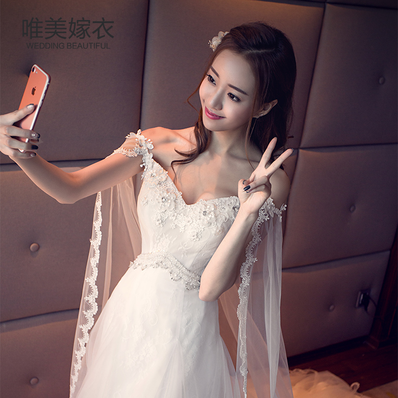 2017新款一字肩婚纱礼服新娘显瘦韩式孕妇V领韩版小拖尾婚纱