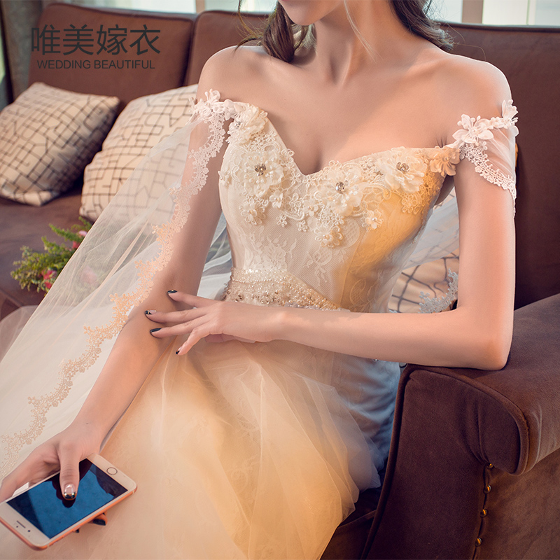 • 2017新款一字肩婚纱礼服新娘显瘦韩式孕妇V领韩版小拖尾婚纱