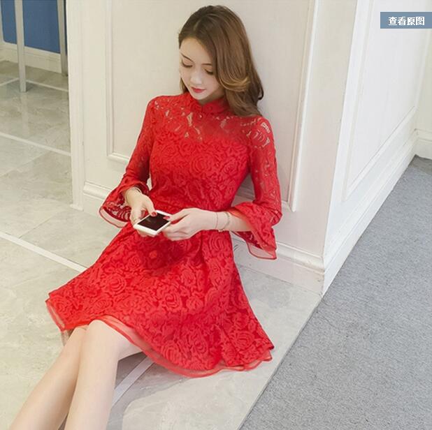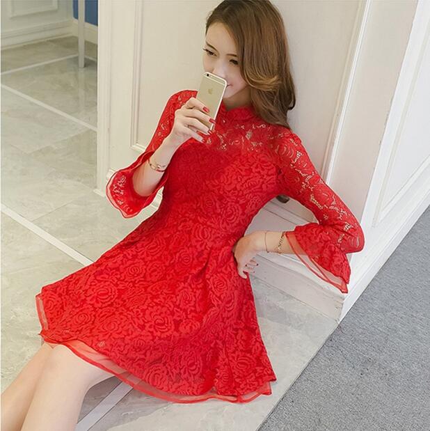 2017春新款新娘敬酒服中长款回门结婚礼服长袖高腰时尚蕾丝连