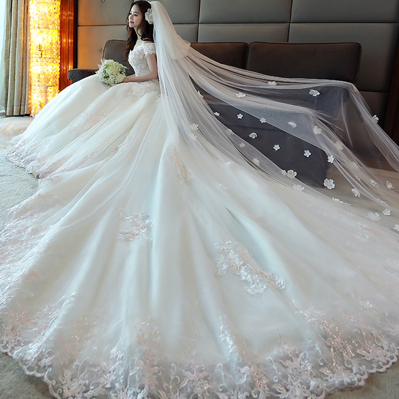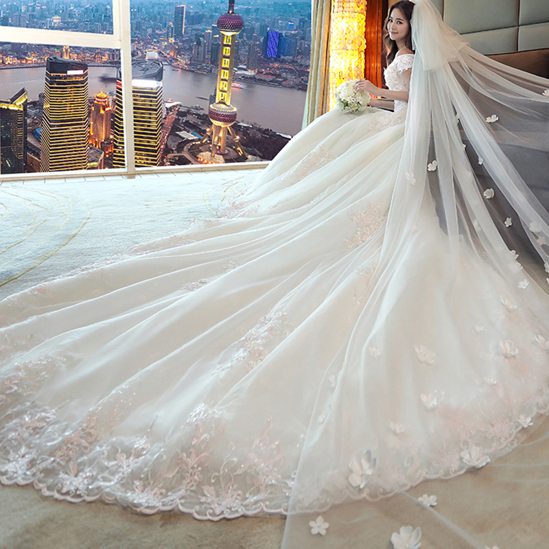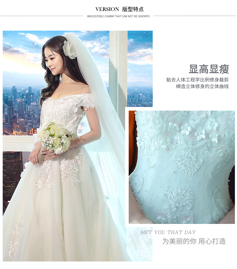 • 婚纱礼服新娘拖尾公主梦幻2017新款结婚一字肩奢华孕妇780