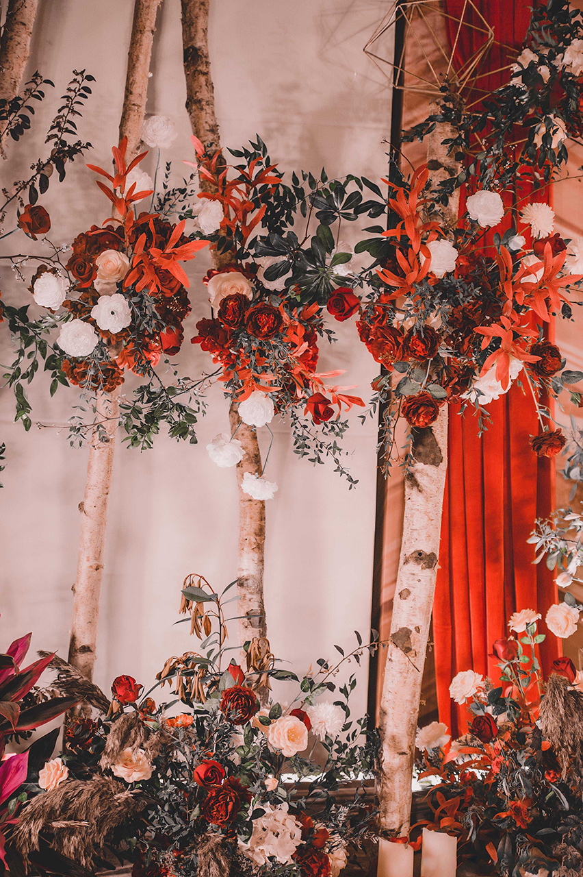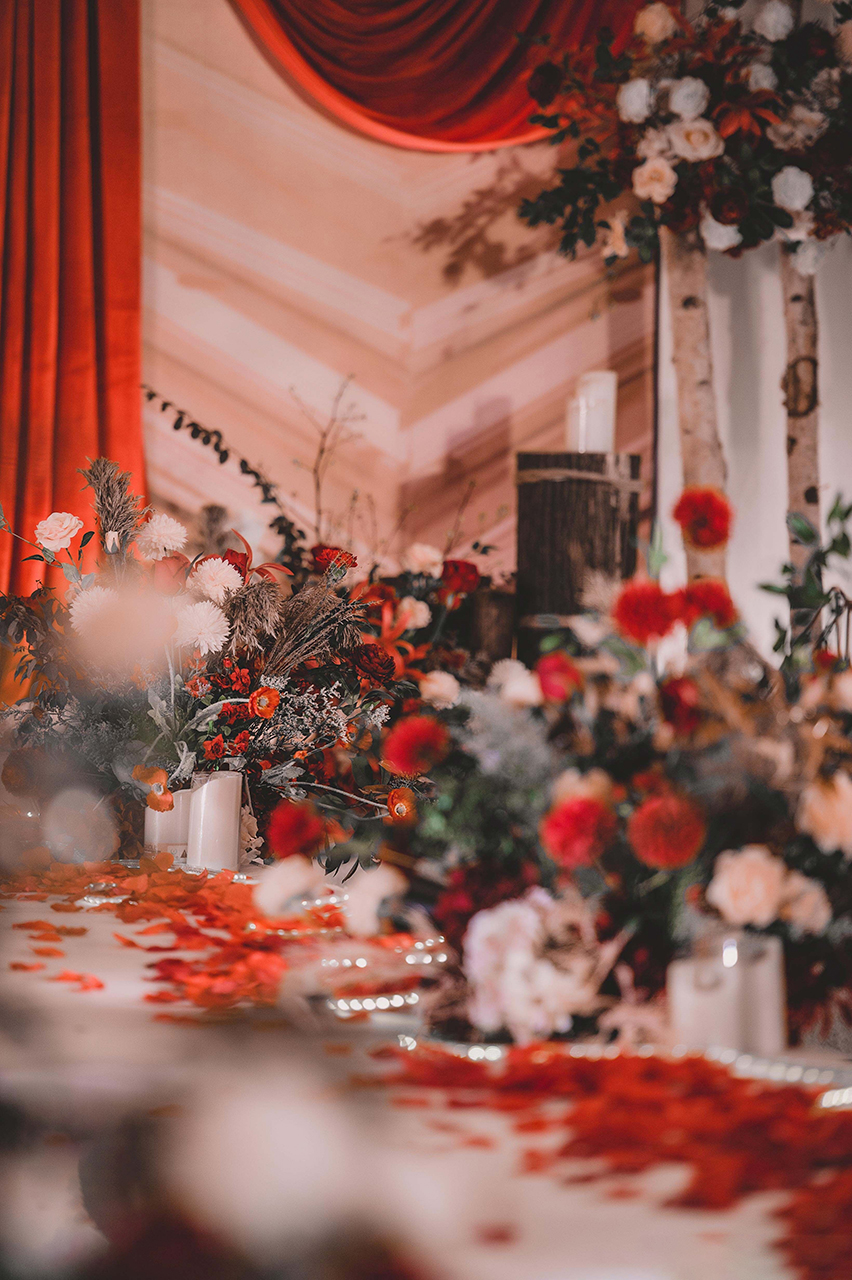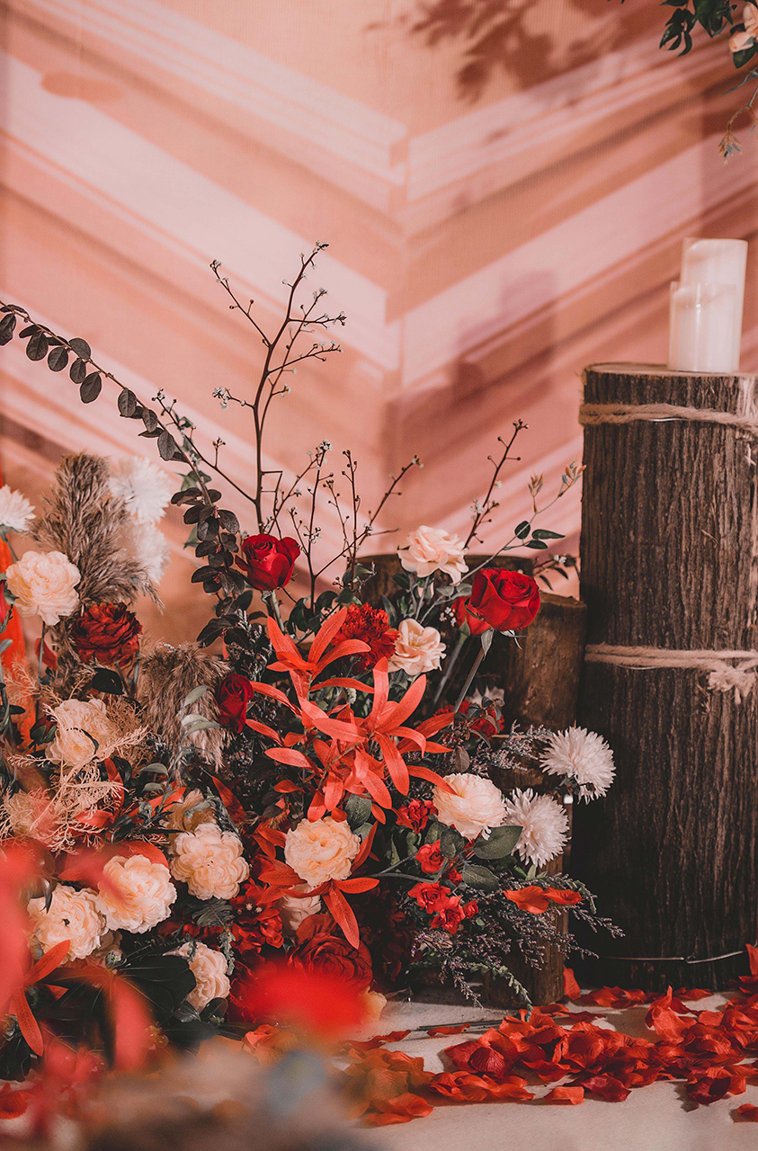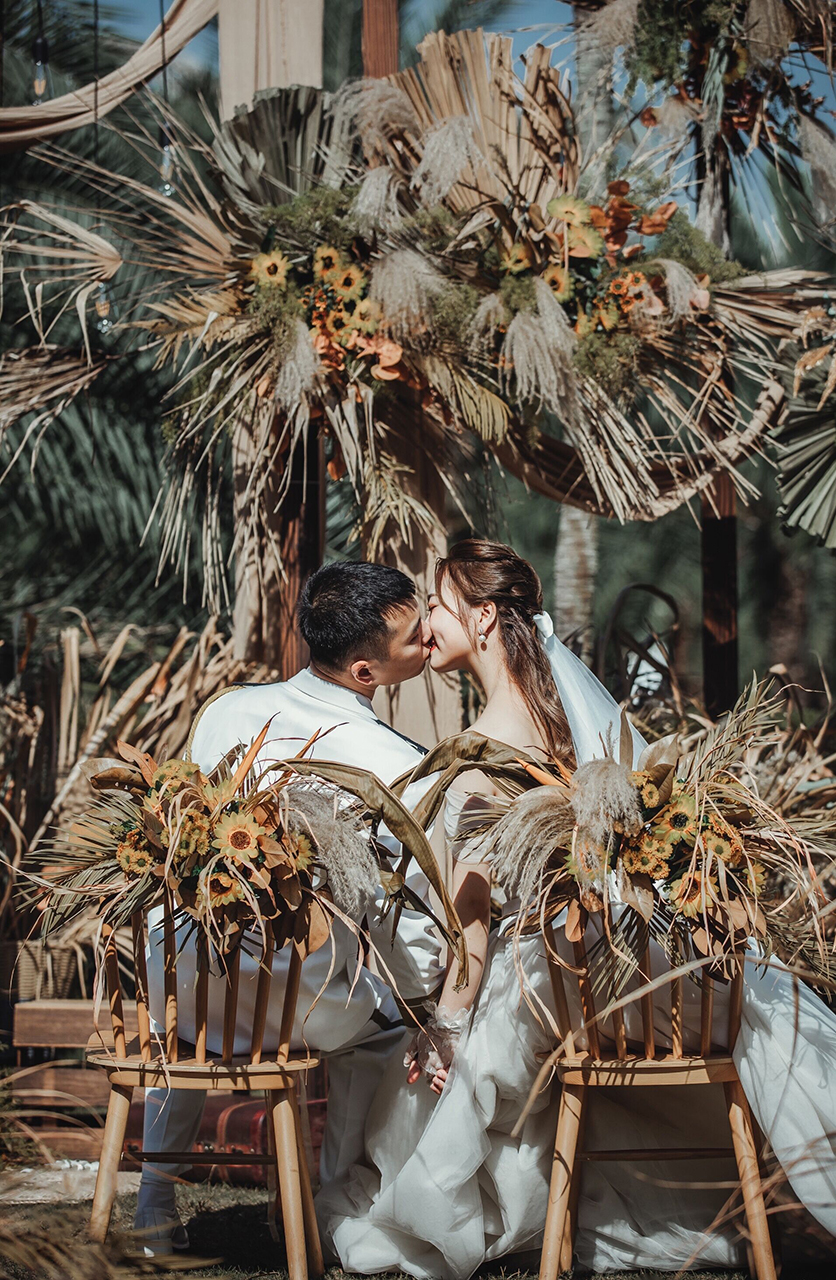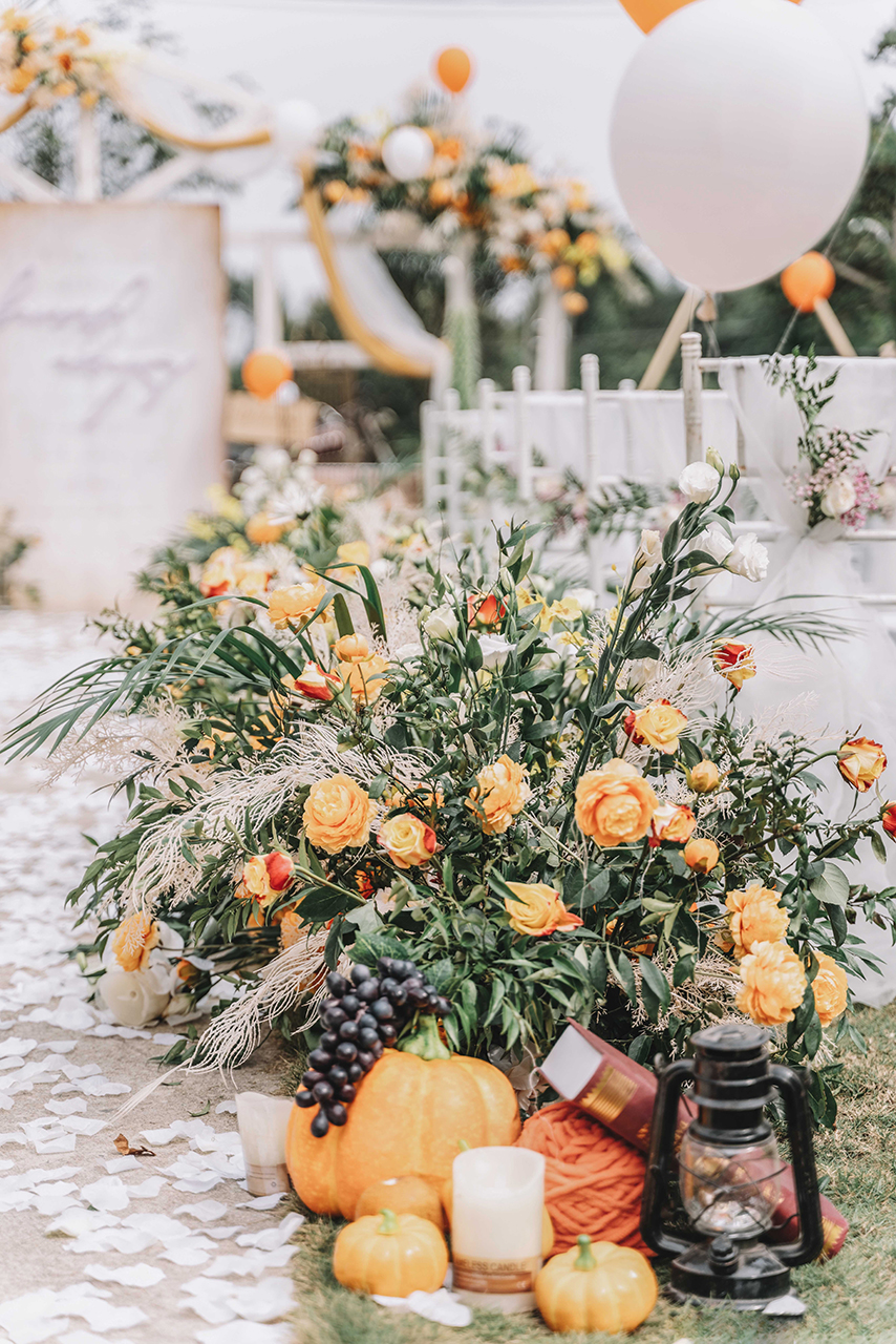 • 芦苇、鲜花与原木的搭配,就像随时赴一场和秋天的约会。聆听秋色花间的密语,感受诗意的曼妙与雅致,一场妙不可言的婚礼,让浪漫的情调尽情蔓延。