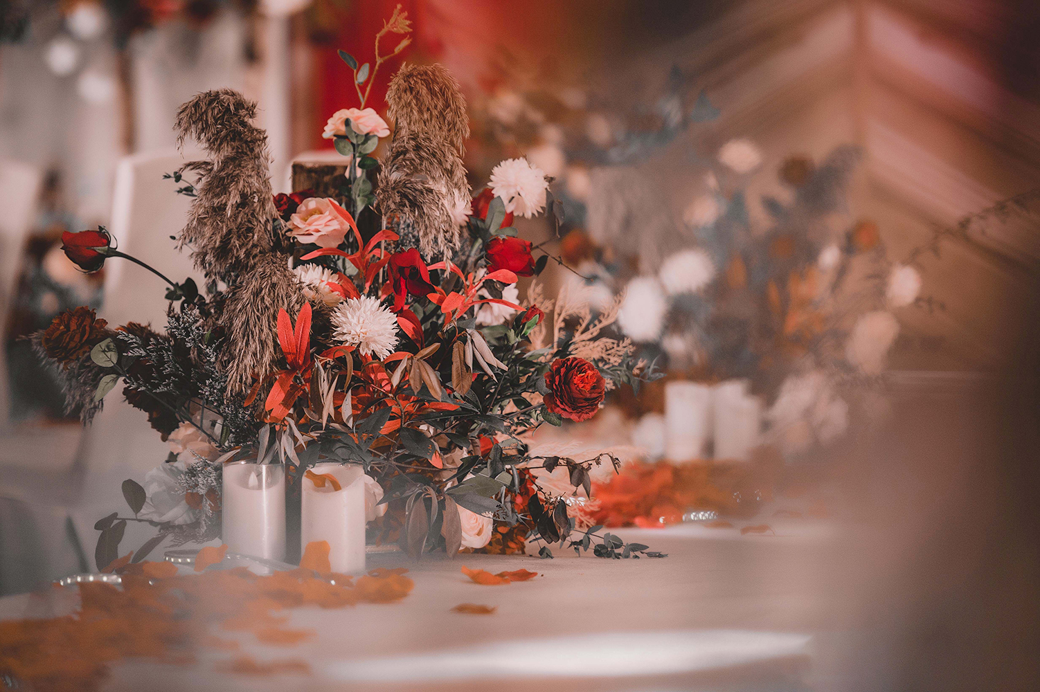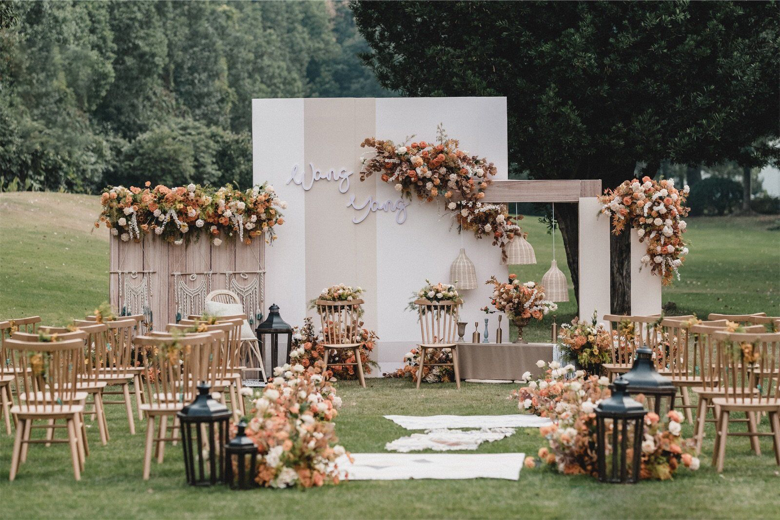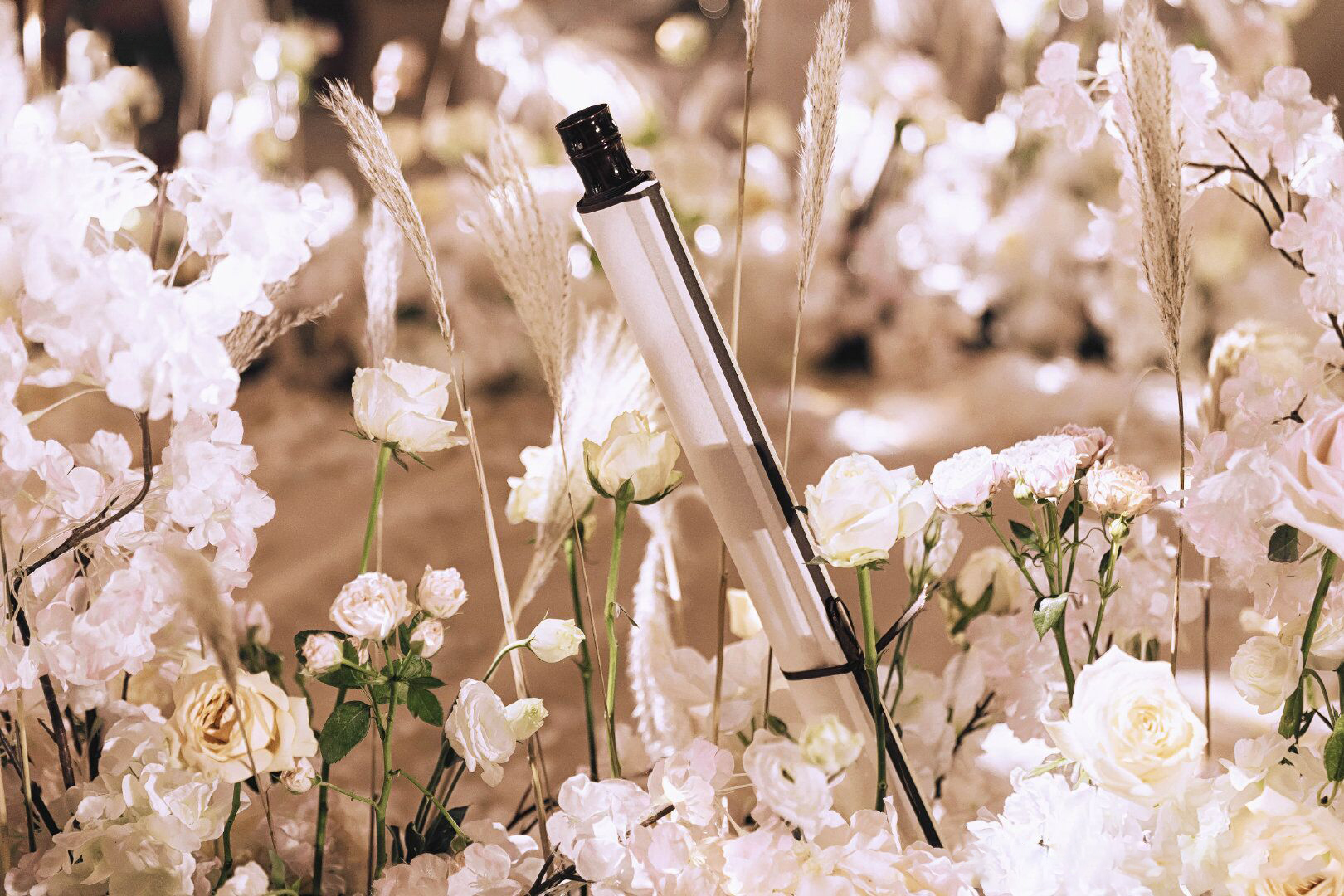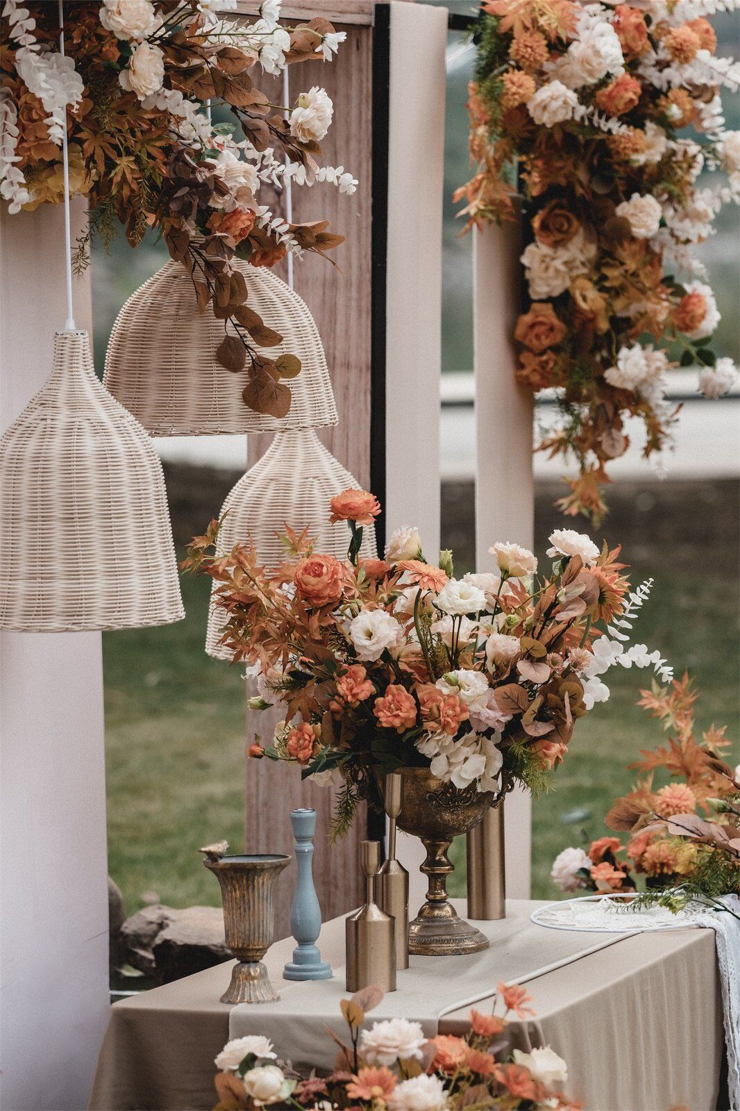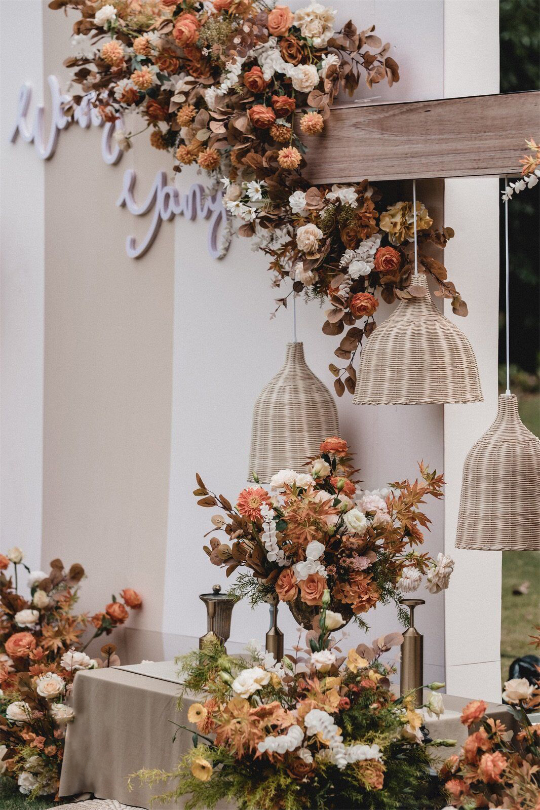 • 芦苇、鲜花与原木的搭配,就像随时赴一场和秋天的约会。聆听秋色花间的密语,感受诗意的曼妙与雅致,一场妙不可言的婚礼,让浪漫的情调尽情蔓延。