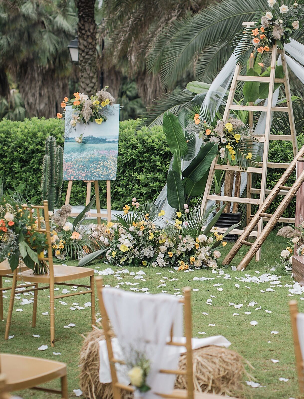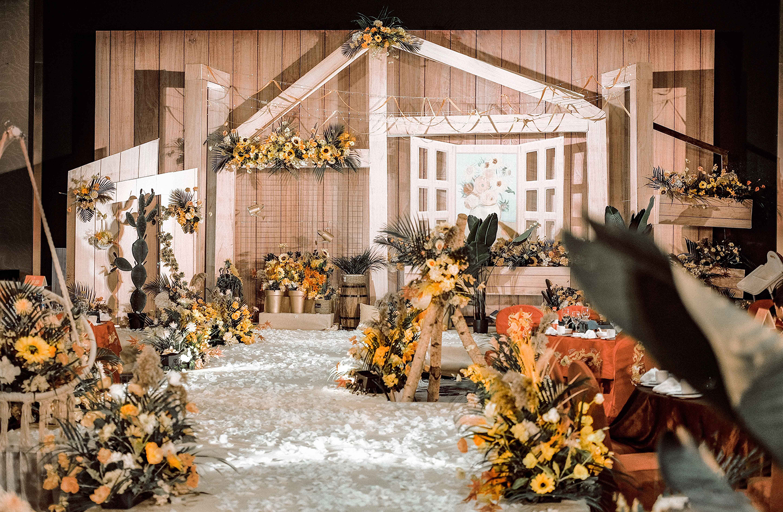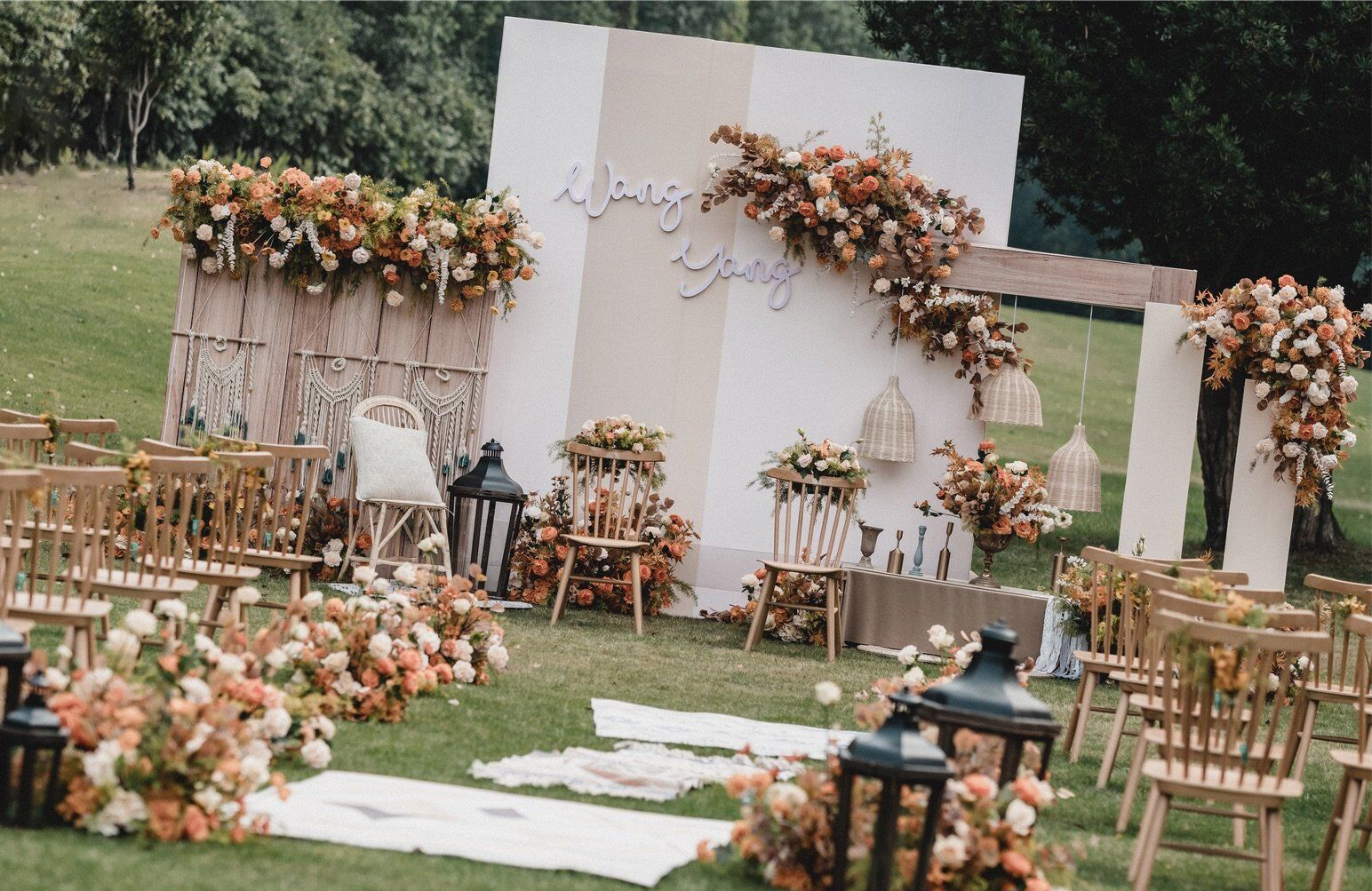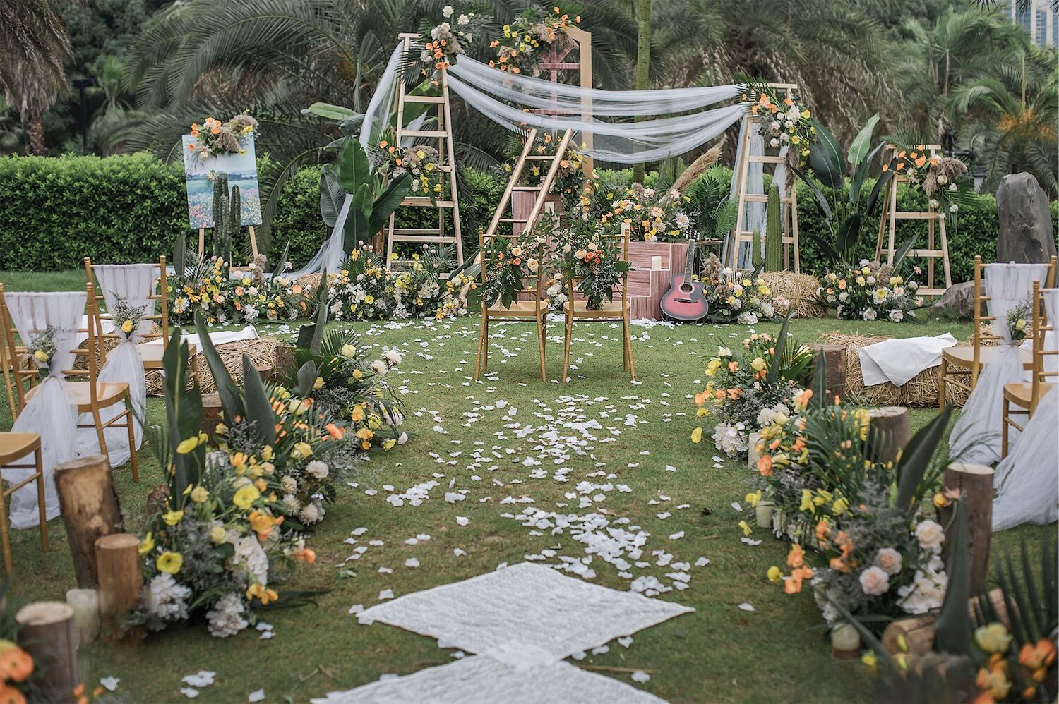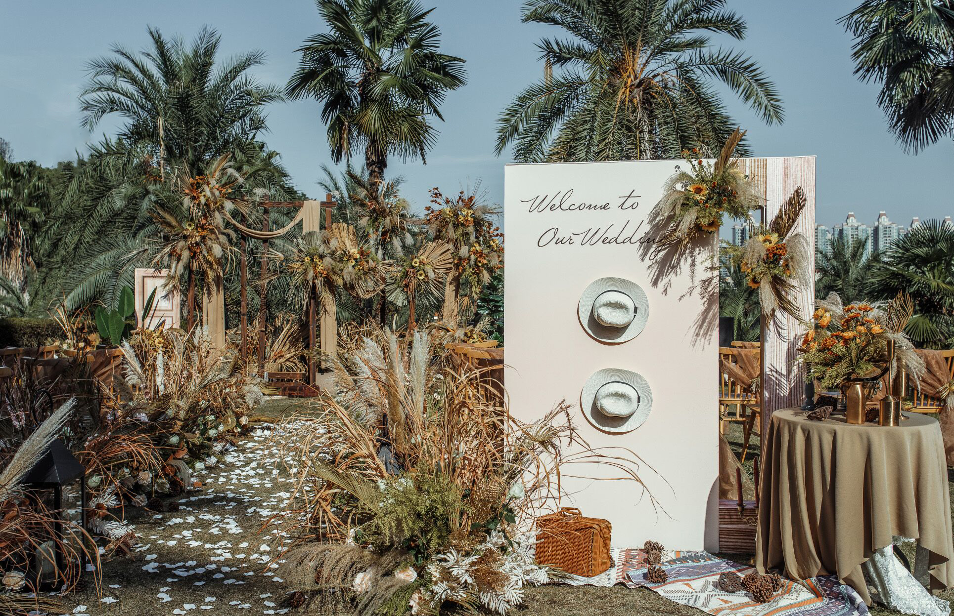 • 芦苇、鲜花与原木的搭配,就像随时赴一场和秋天的约会。聆听秋色花间的密语,感受诗意的曼妙与雅致,一场妙不可言的婚礼,让浪漫的情调尽情蔓延。