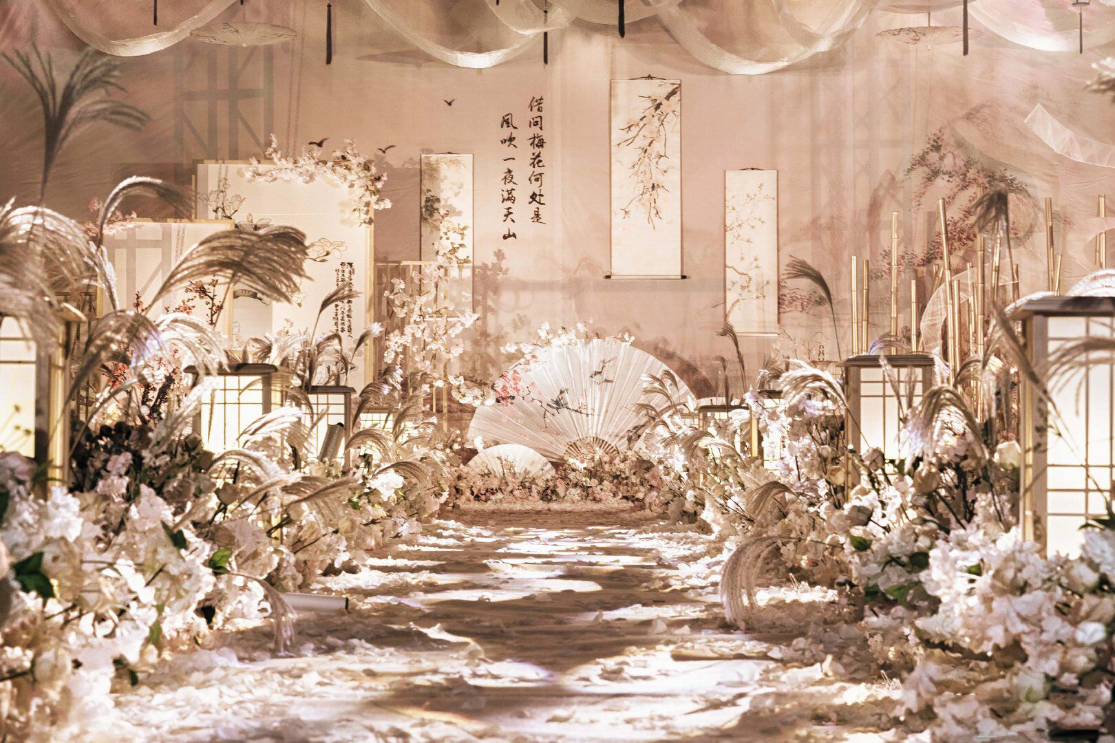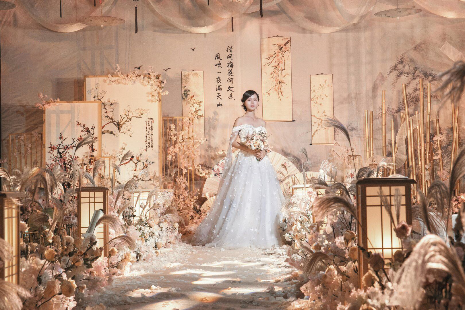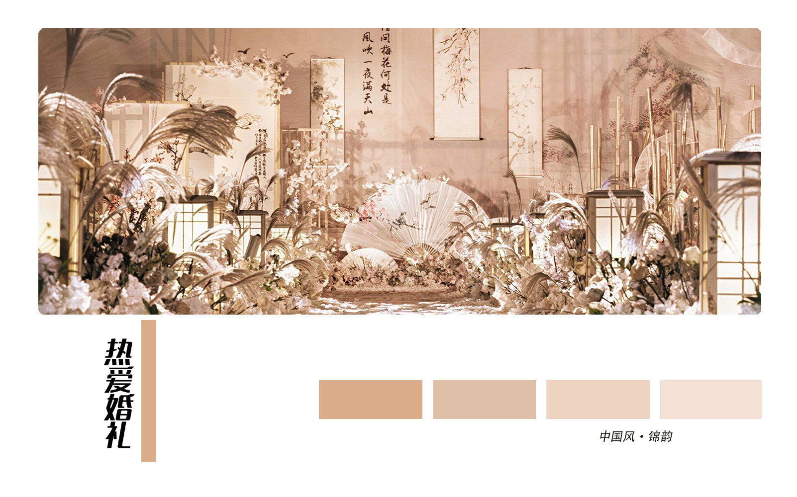 • 为君画眉桃花染衣袖,竹枝声声你我情如酒。 这场有别于传统中式婚礼的满目红色,设计师特选用了雅致的大地色结合温和的淡粉色,用芦苇、玉兰、画轴、金竹、书生扇等意象,营造了一种朦胧、优美、充满古风韵味的意境之美,打造一场雅致的中国风婚礼。 ​​​​