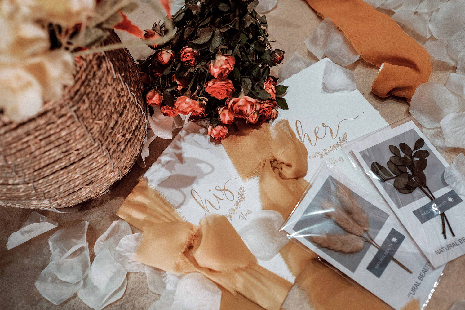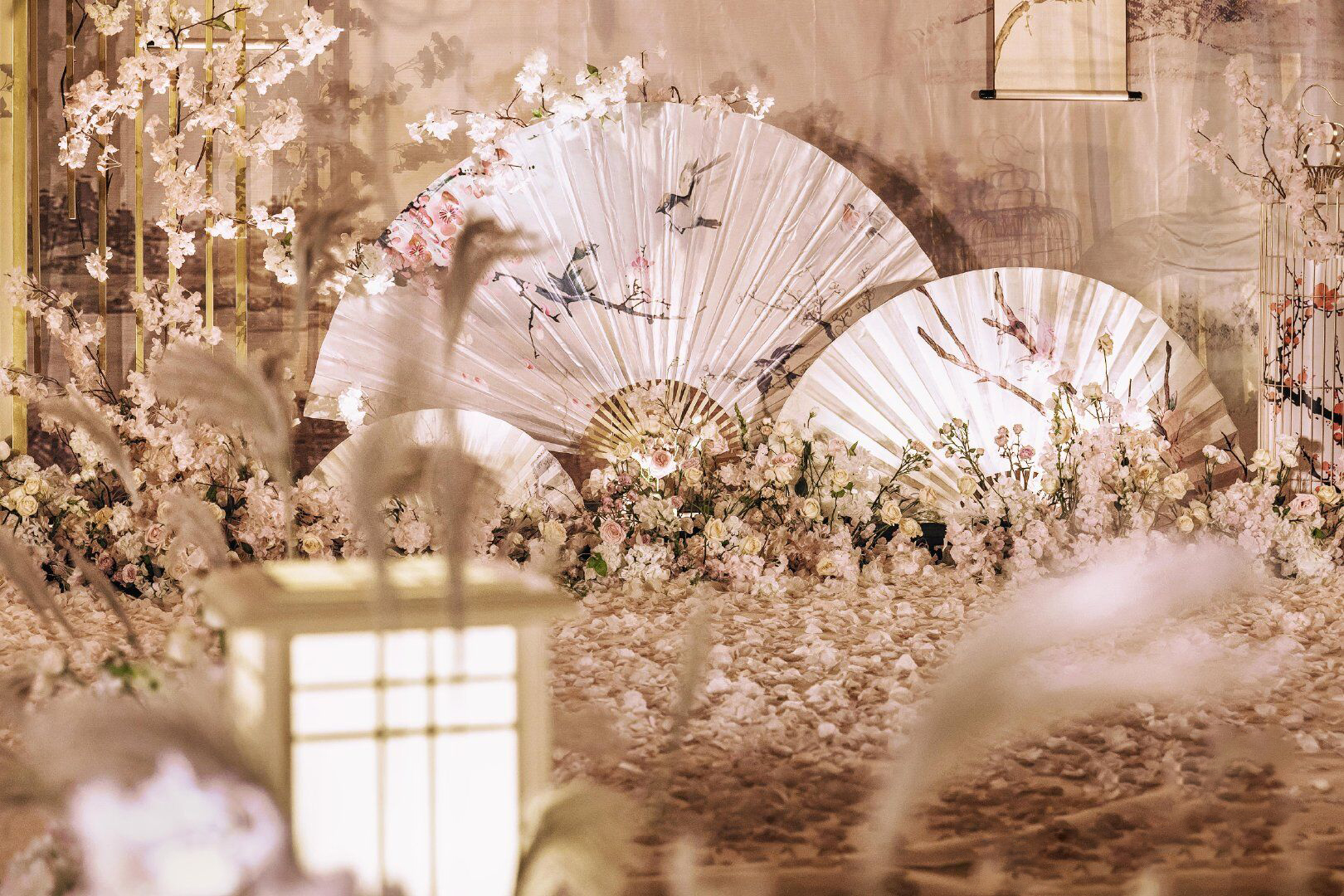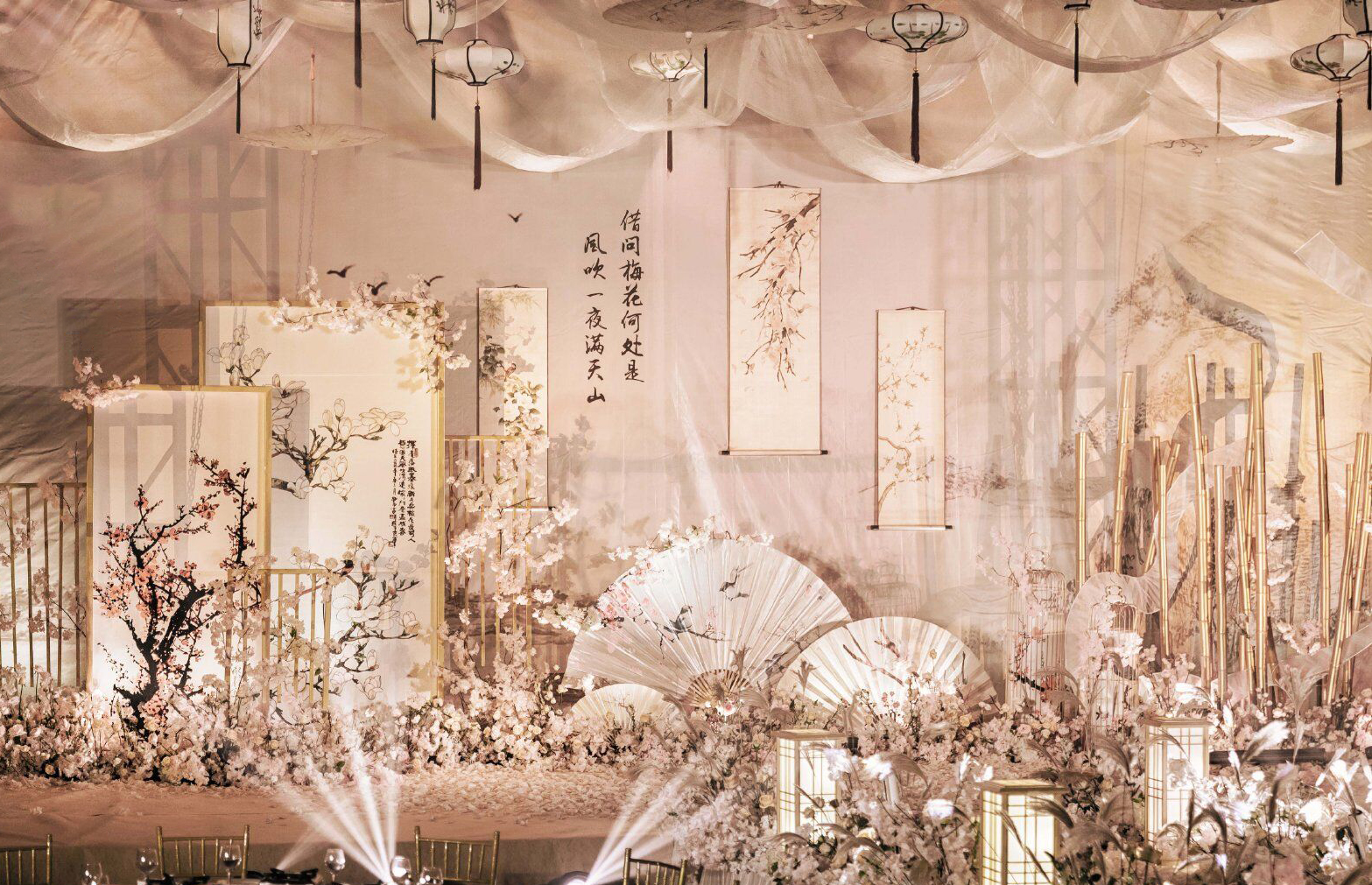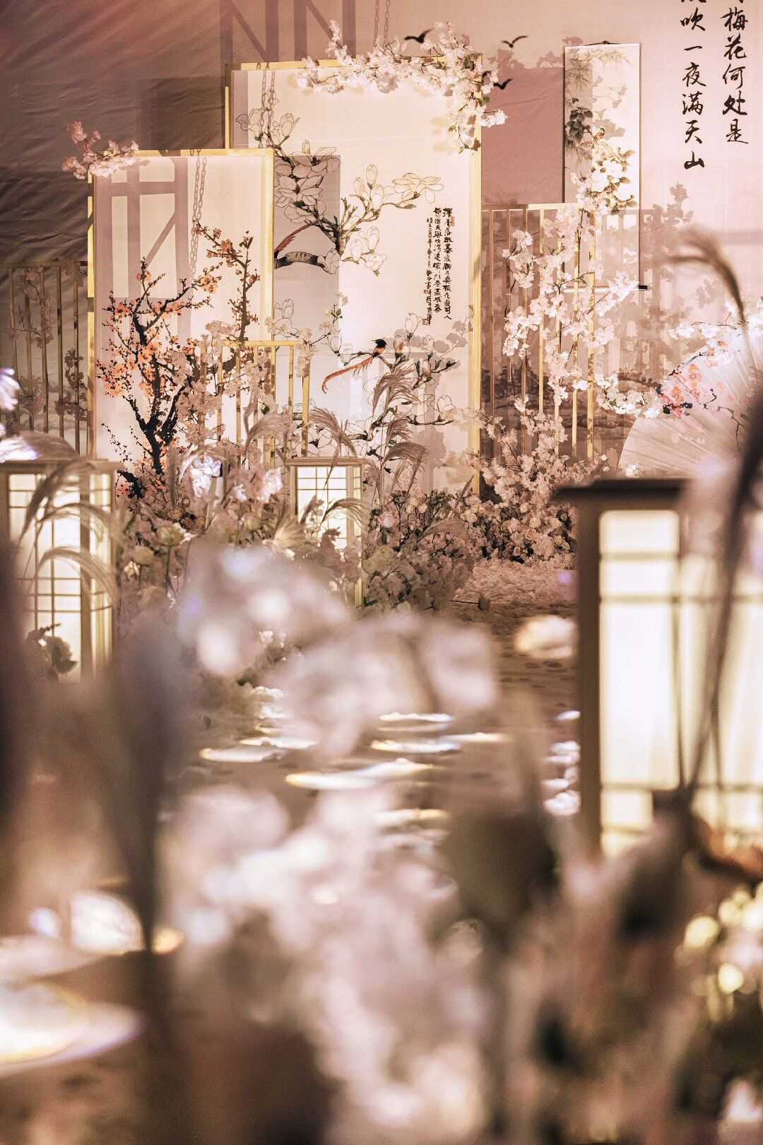 • 为君画眉桃花染衣袖,竹枝声声你我情如酒。 这场有别于传统中式婚礼的满目红色,设计师特选用了雅致的大地色结合温和的淡粉色,用芦苇、玉兰、画轴、金竹、书生扇等意象,营造了一种朦胧、优美、充满古风韵味的意境之美,打造一场雅致的中国风婚礼。 ​​​​