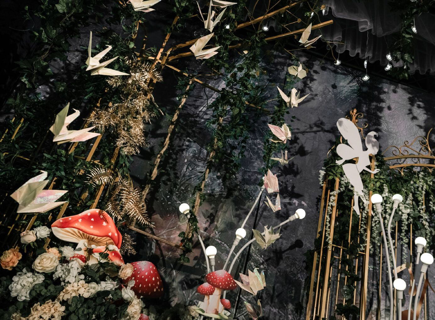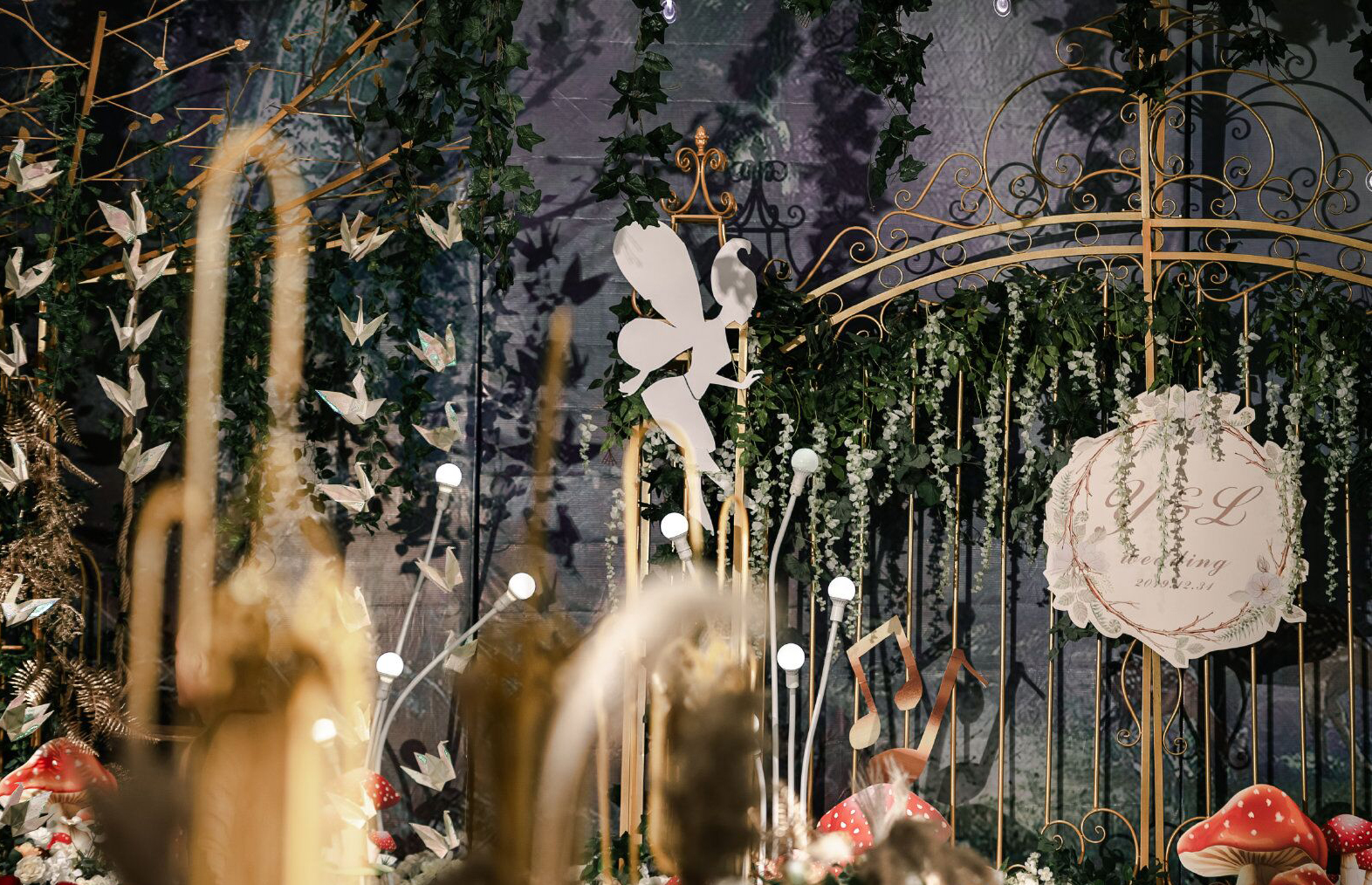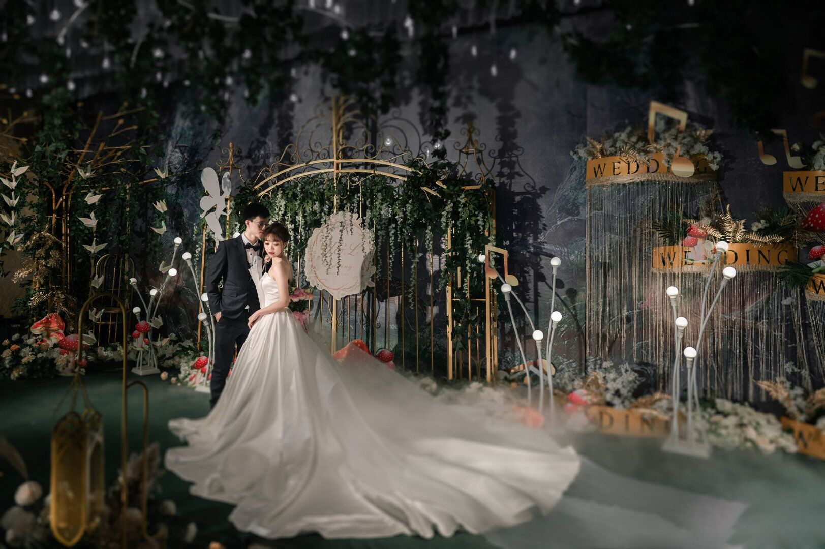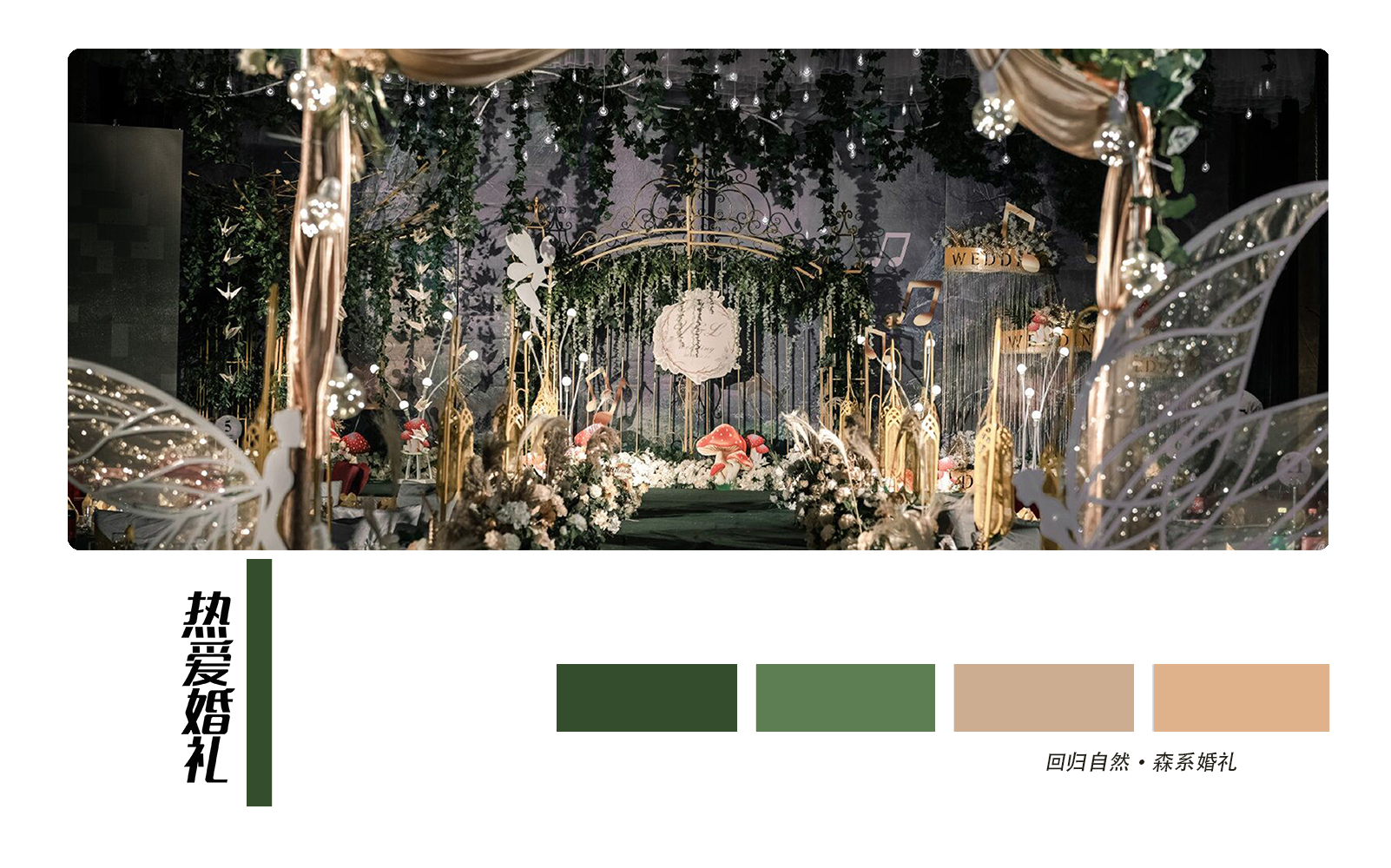 • 森系婚礼就是追求一种回归自然,清新放松的舒适感,墨绿色是整场的主调,搭配金色明暗交替更加生动有质感 整场花艺用到了大量的绿色让人宛如真正置身森林之中 树下的千纸鹤随着音乐一同舞动,每只千纸鹤也都承载对新人的一点祝愿