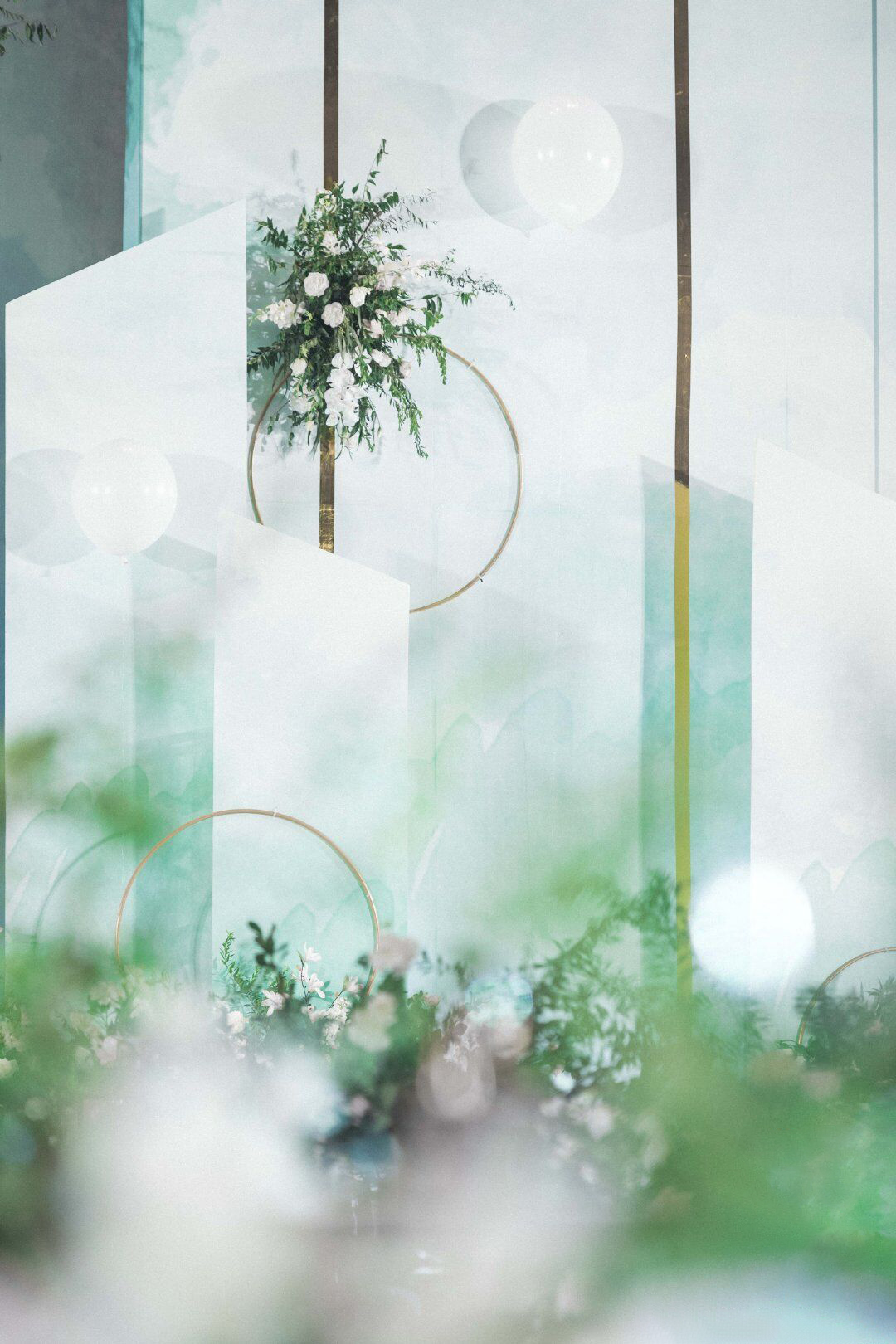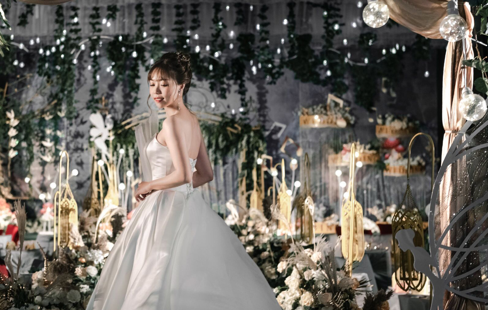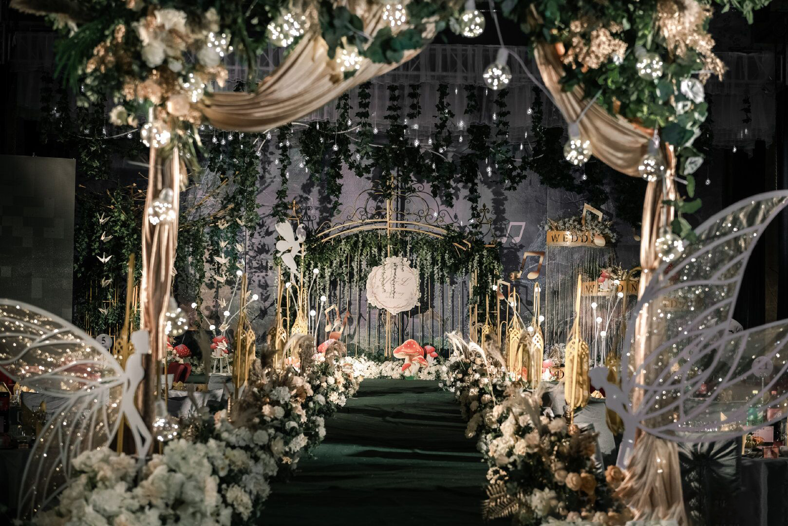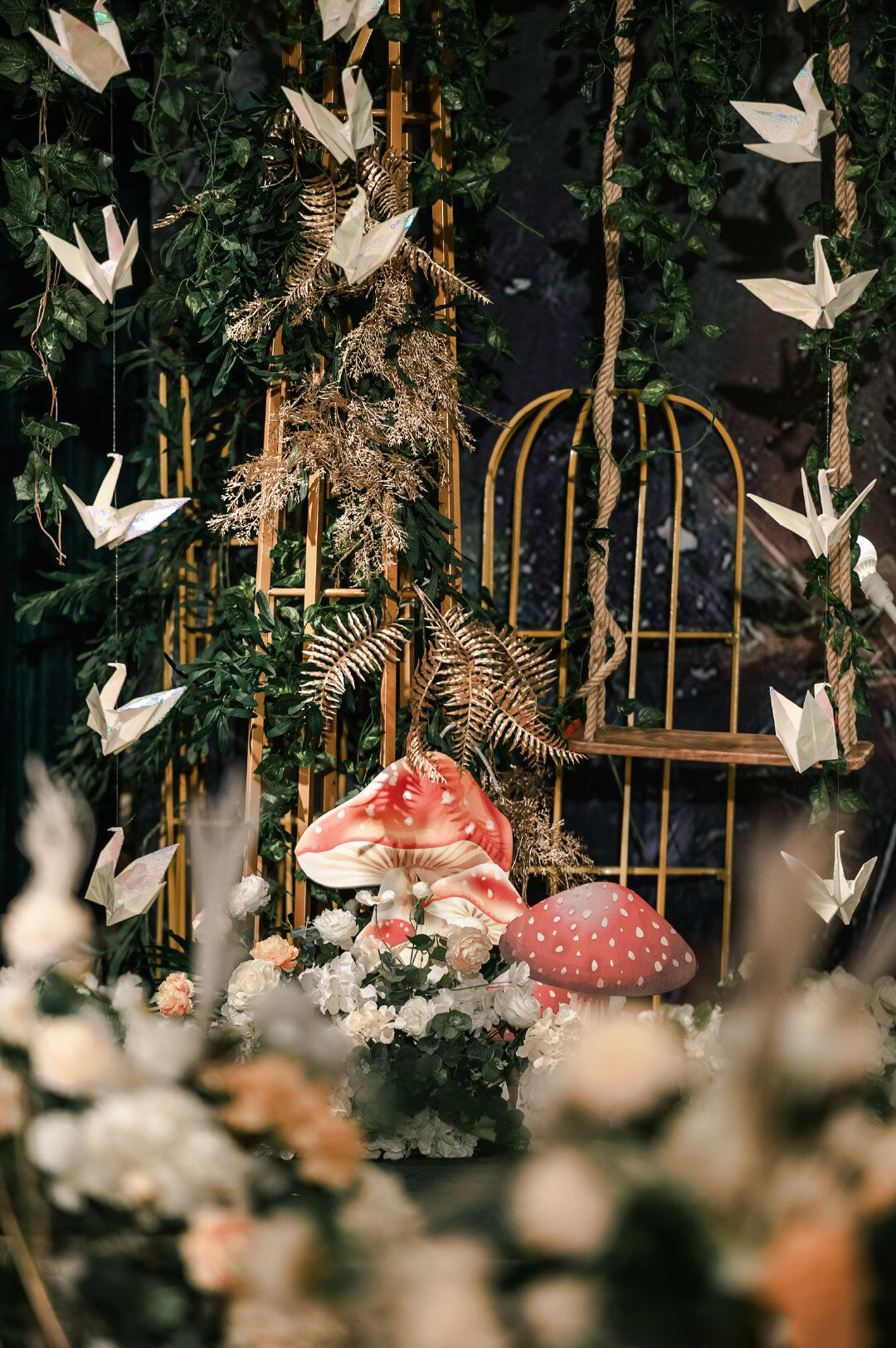 • 森系婚礼就是追求一种回归自然,清新放松的舒适感,墨绿色是整场的主调,搭配金色明暗交替更加生动有质感 整场花艺用到了大量的绿色让人宛如真正置身森林之中 树下的千纸鹤随着音乐一同舞动,每只千纸鹤也都承载对新人的一点祝愿