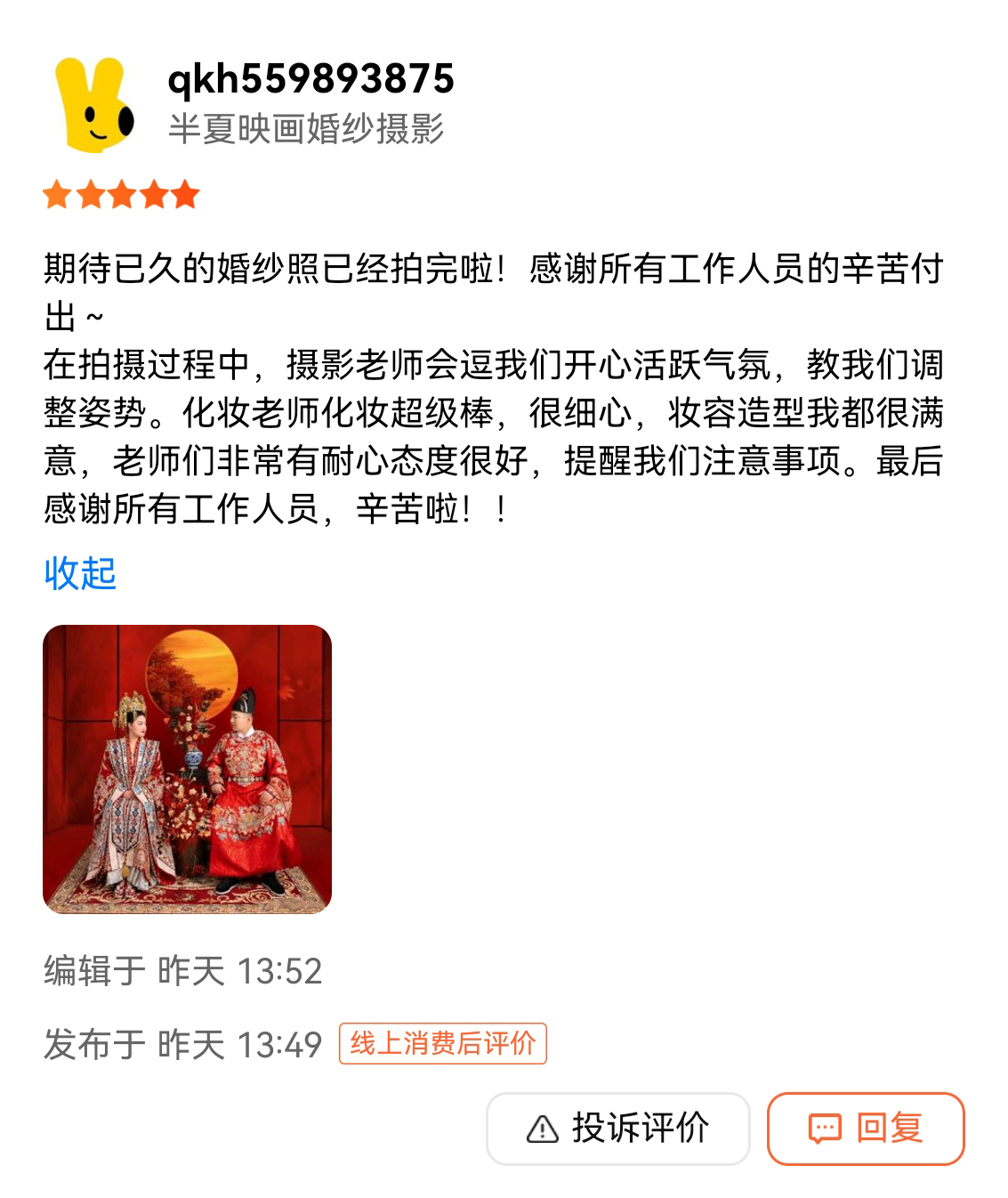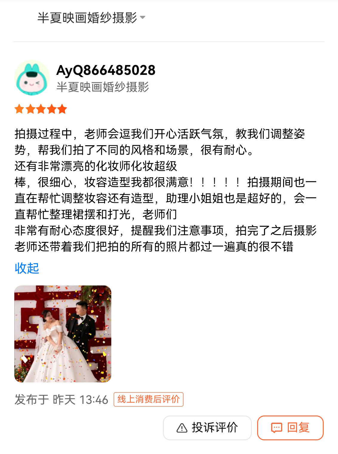 网上看了很多家 有点看花眼了,朋友推荐的半映画,就过来看了下,拍摄风格和服装都挺满意的就定了。化妆和拍摄过程也很顺利,照片超出期望值,非常满意的一次拍摄体验。