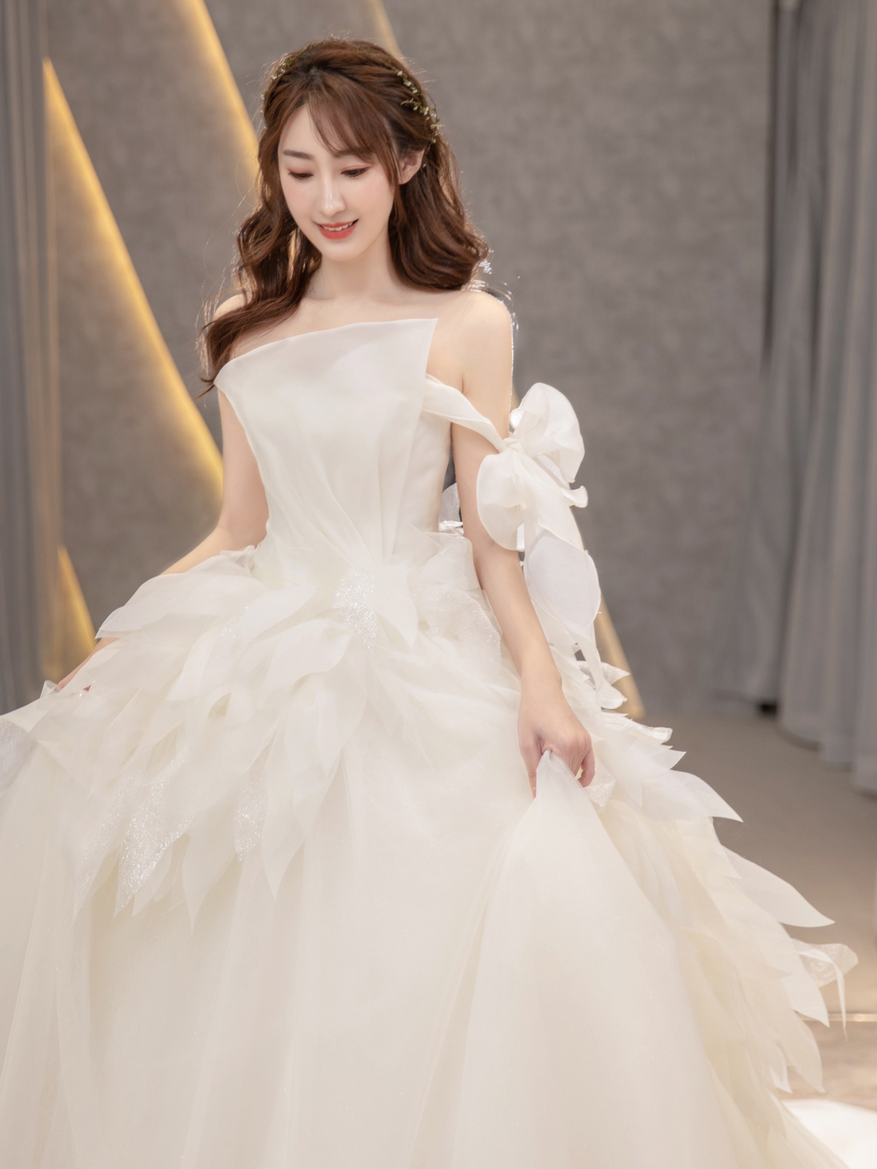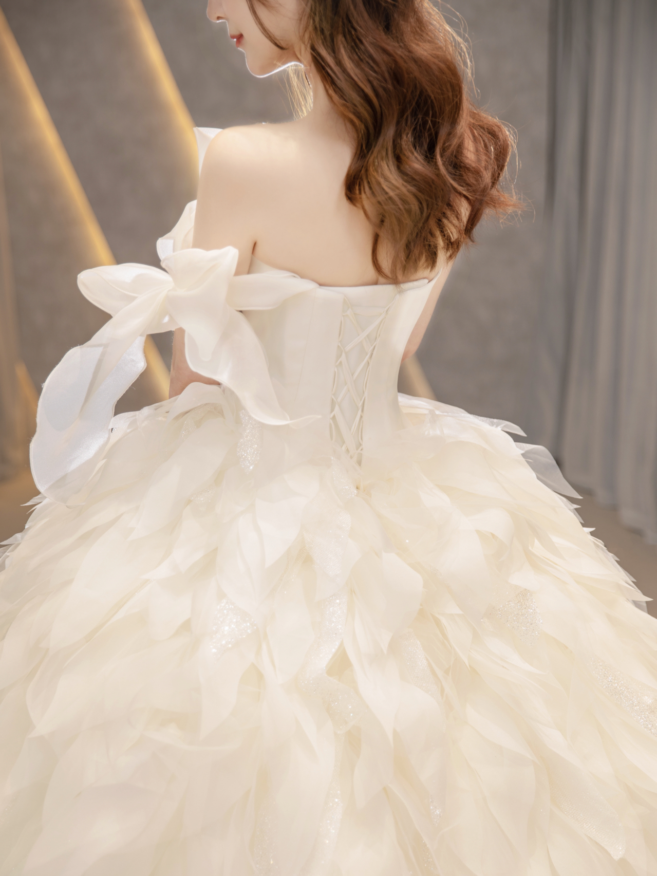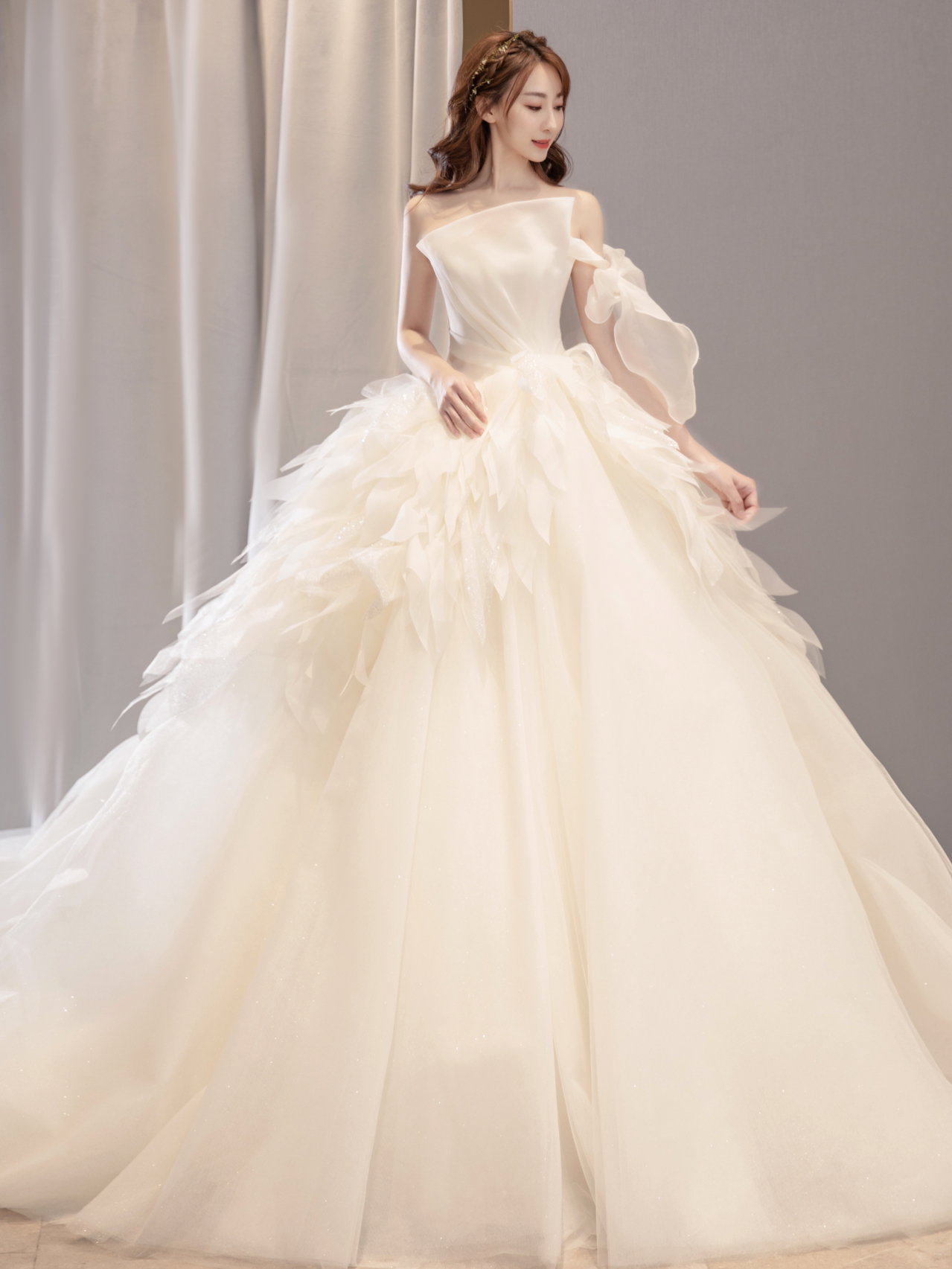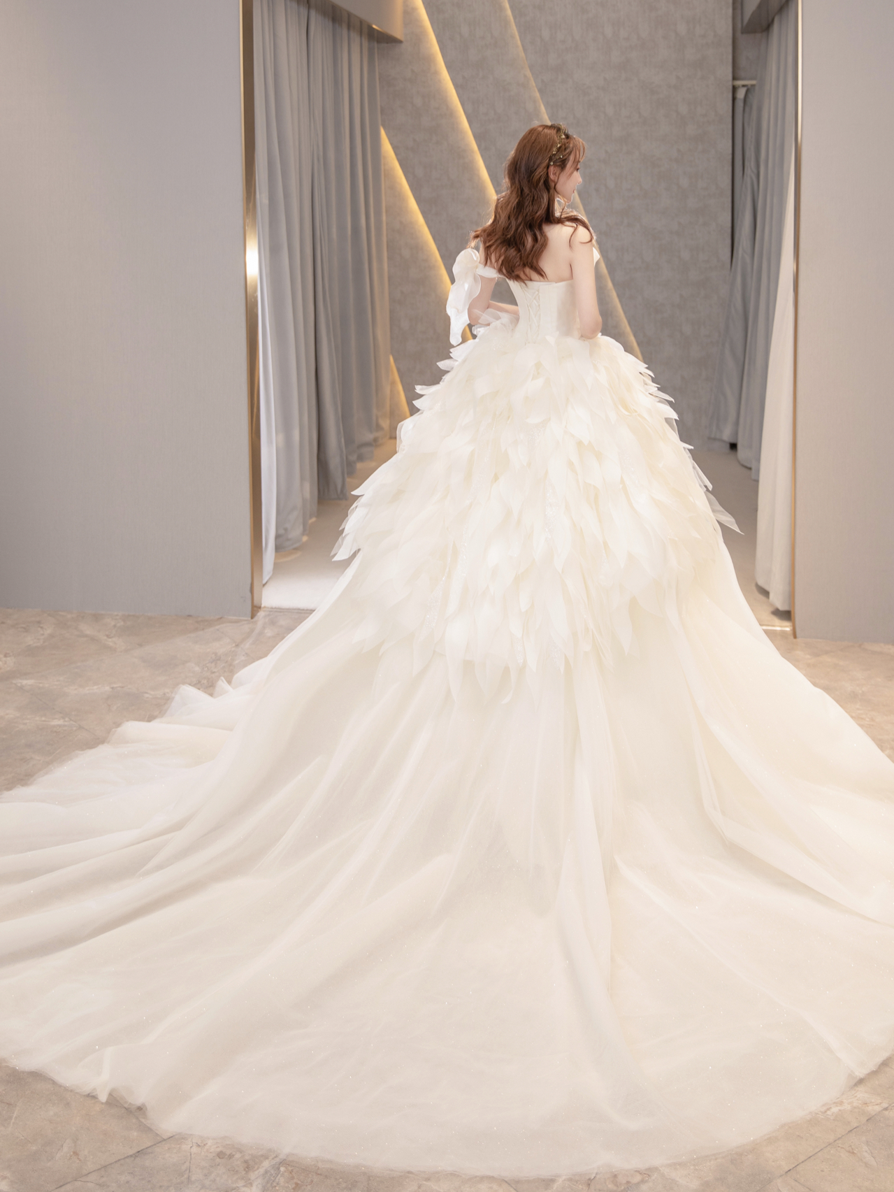 • 缎面光泽透着柔美静雅的气质,别出心裁的一字肩设计人胸前对丝抓褶造型雕刻花苞绽放般的优美形态 蓬蓬公主裙搭配立体印花,在缎面的高级中融入了少女的甜蜜浪漫片气质公主感扑面而来 转过身后,腰部的法式排扣蔓延至拖尾处 不经意间 散发出迷人的法式浪漫 # 新娘出场方式