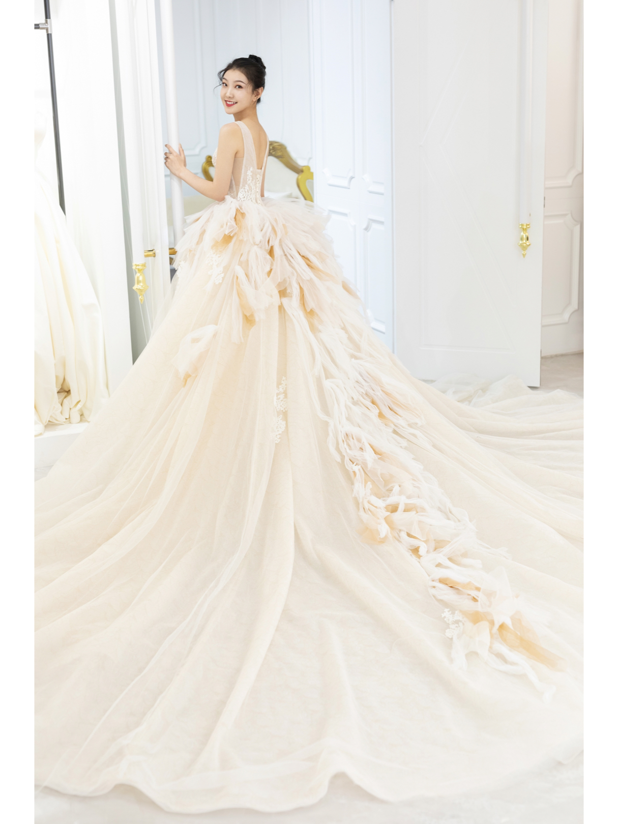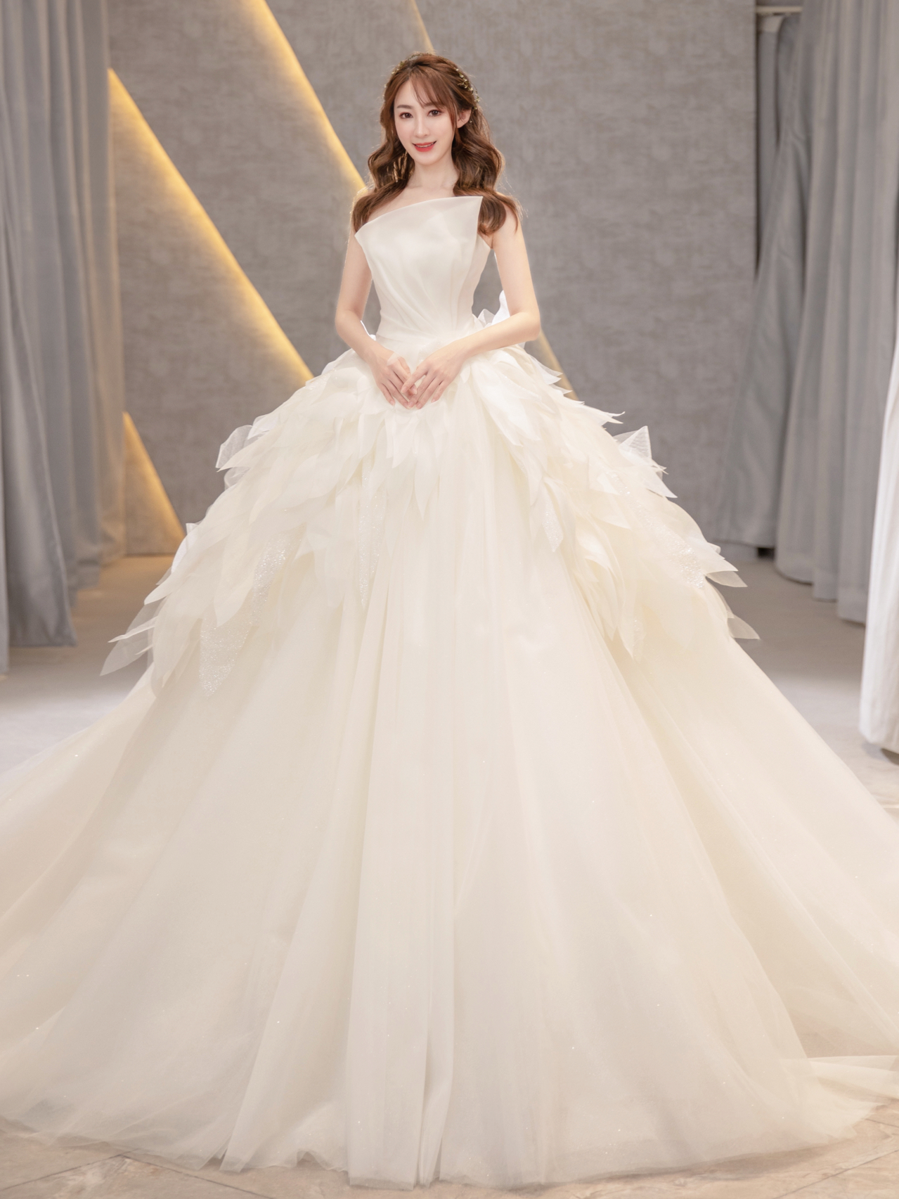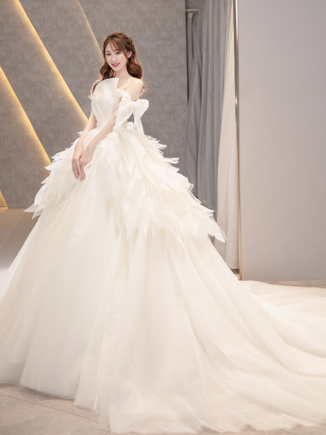 • 缎面光泽透着柔美静雅的气质,别出心裁的一字肩设计人胸前对丝抓褶造型雕刻花苞绽放般的优美形态 蓬蓬公主裙搭配立体印花,在缎面的高级中融入了少女的甜蜜浪漫片气质公主感扑面而来 转过身后,腰部的法式排扣蔓延至拖尾处 不经意间 散发出迷人的法式浪漫 # 新娘出场方式
