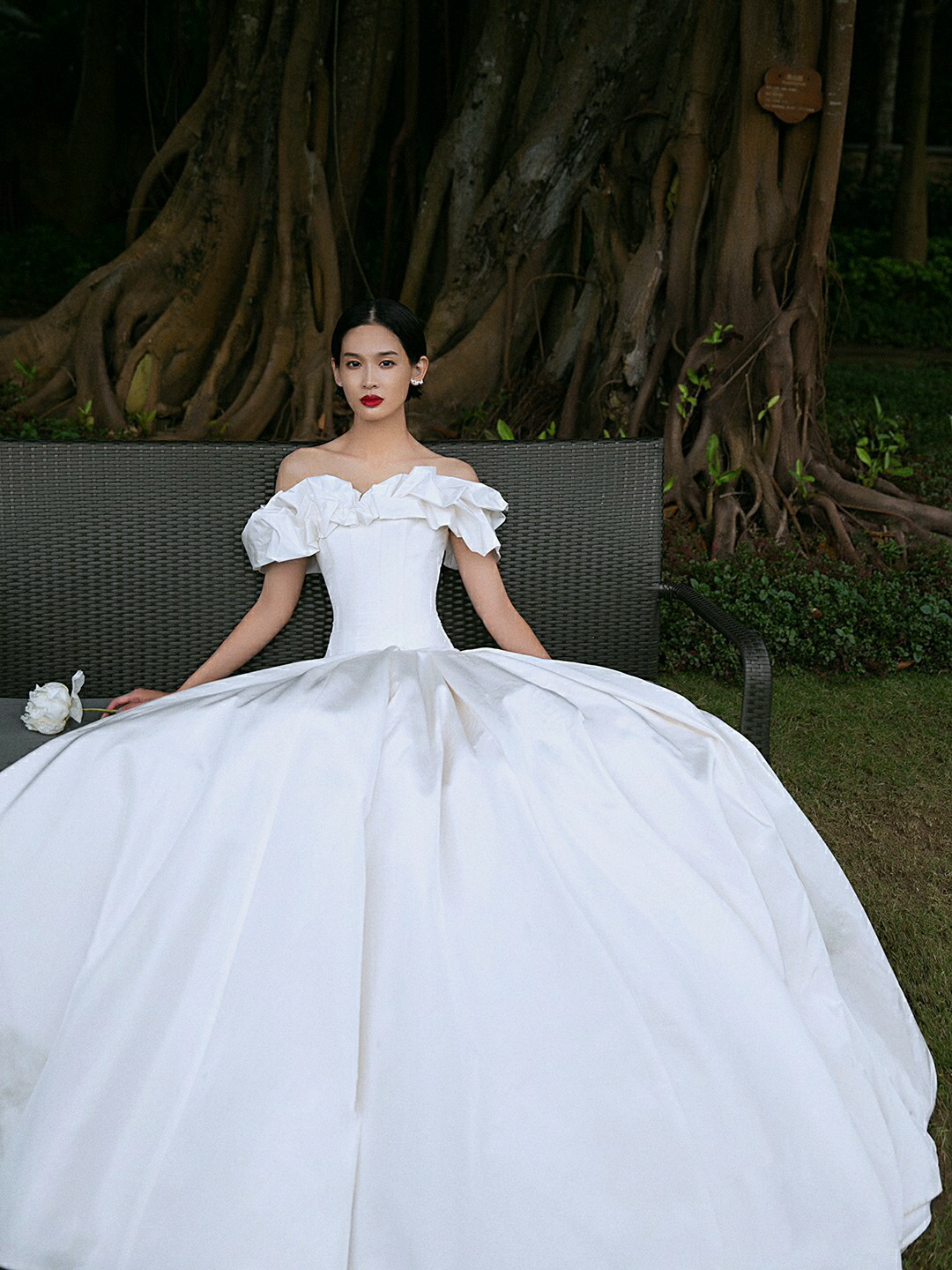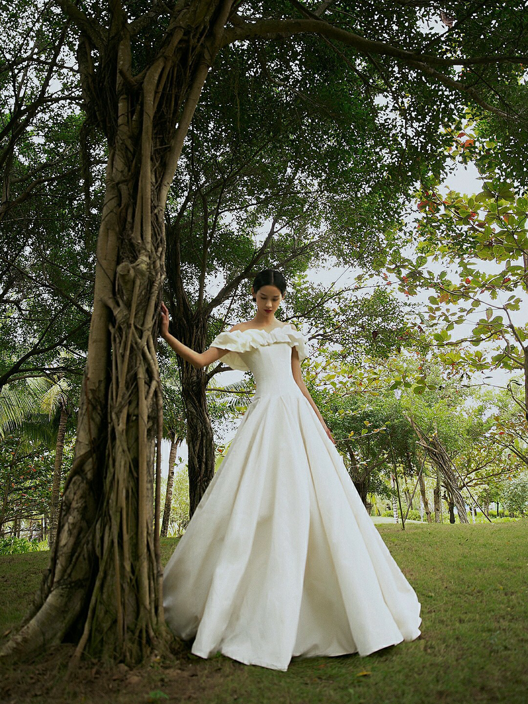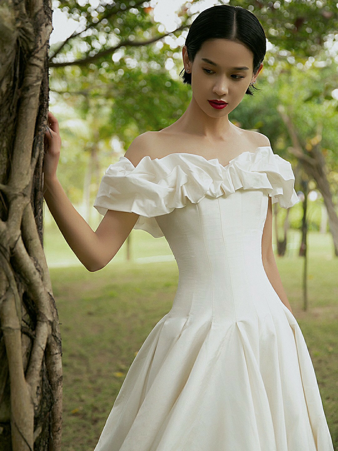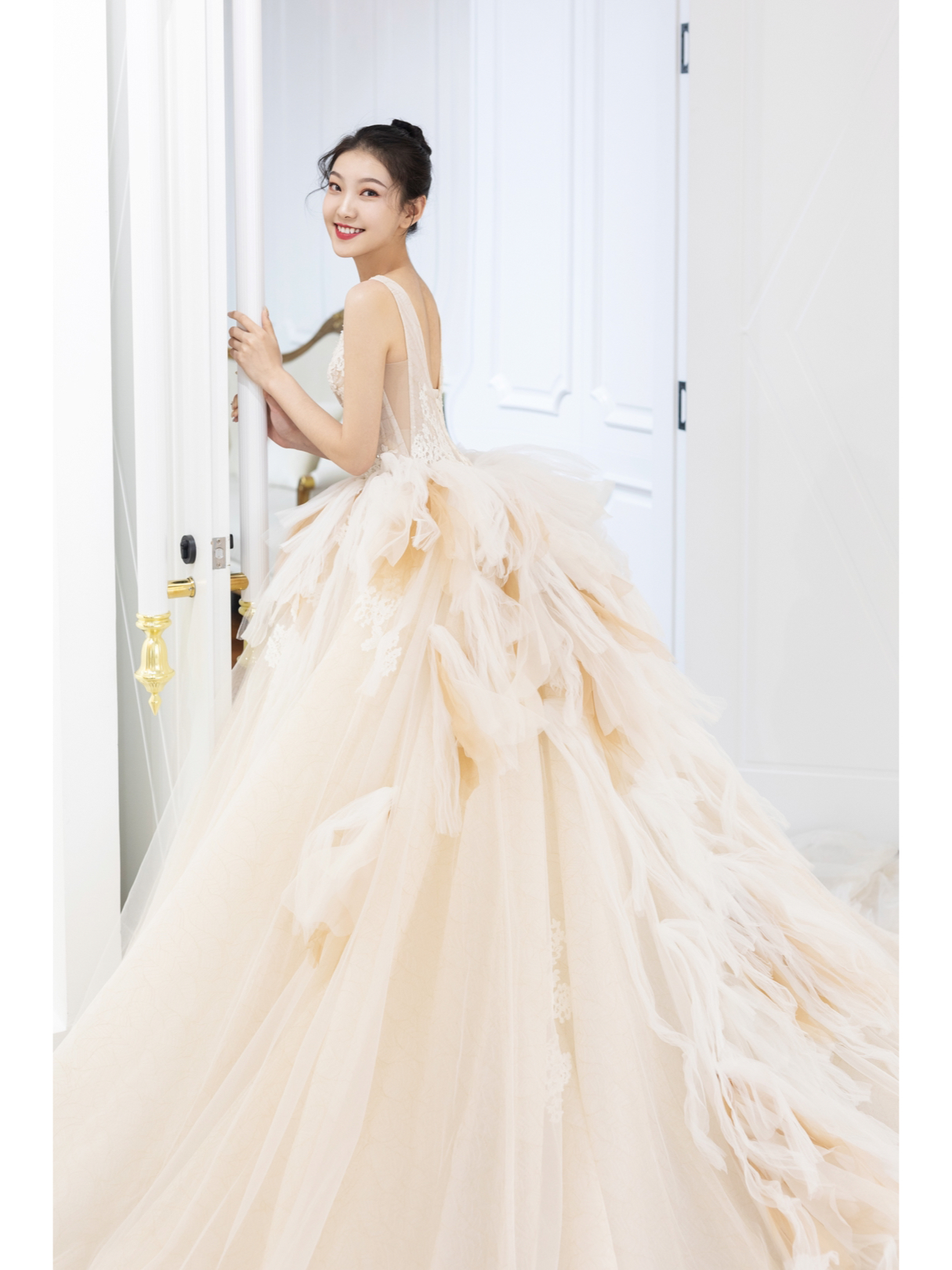 • 缎面光泽透着柔美静雅的气质,别出心裁的一字肩设计人胸前对丝抓褶造型雕刻花苞绽放般的优美形态 蓬蓬公主裙搭配立体印花,在缎面的高级中融入了少女的甜蜜浪漫片气质公主感扑面而来 转过身后,腰部的法式排扣蔓延至拖尾处 不经意间 散发出迷人的法式浪漫 # 新娘出场方式