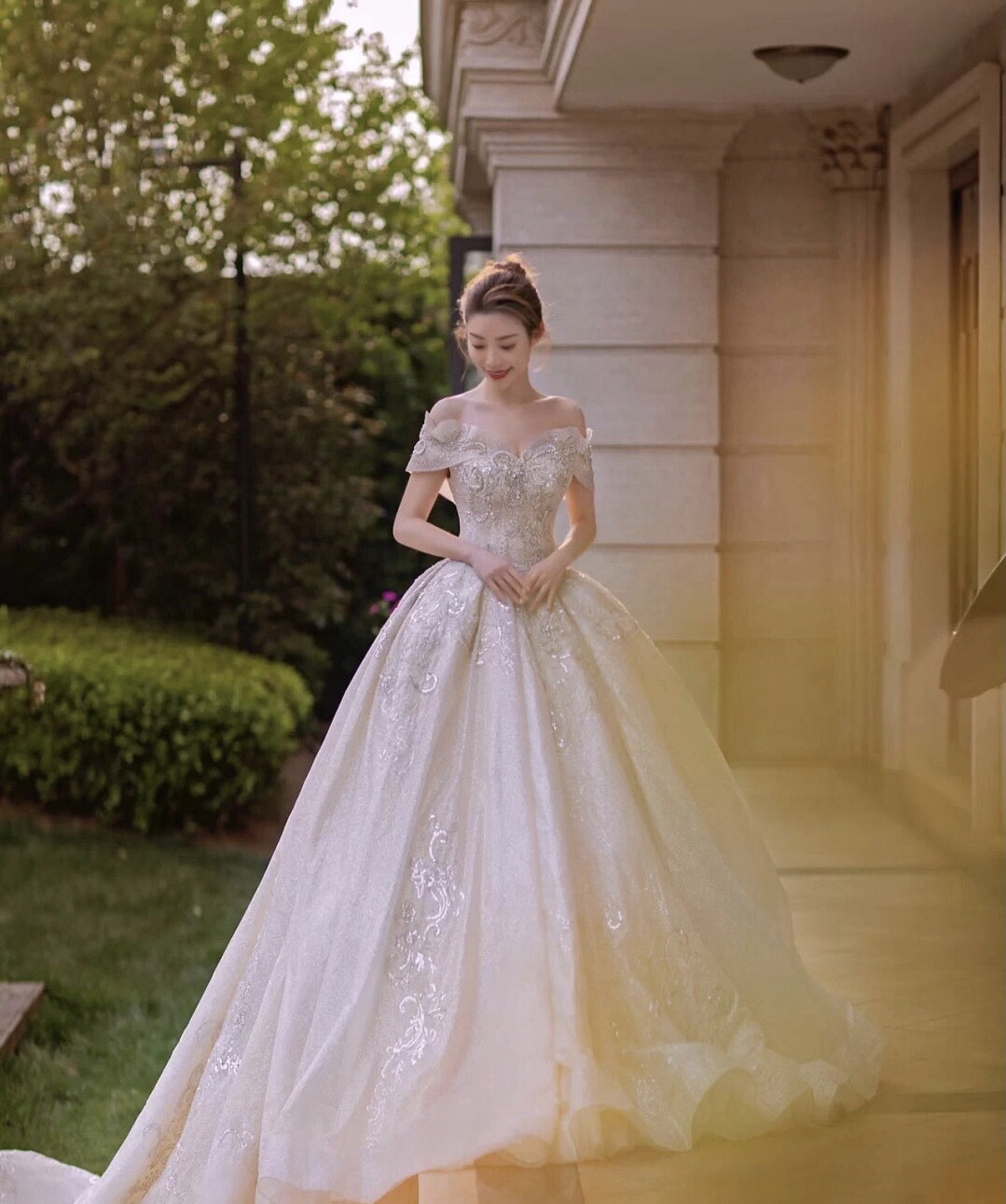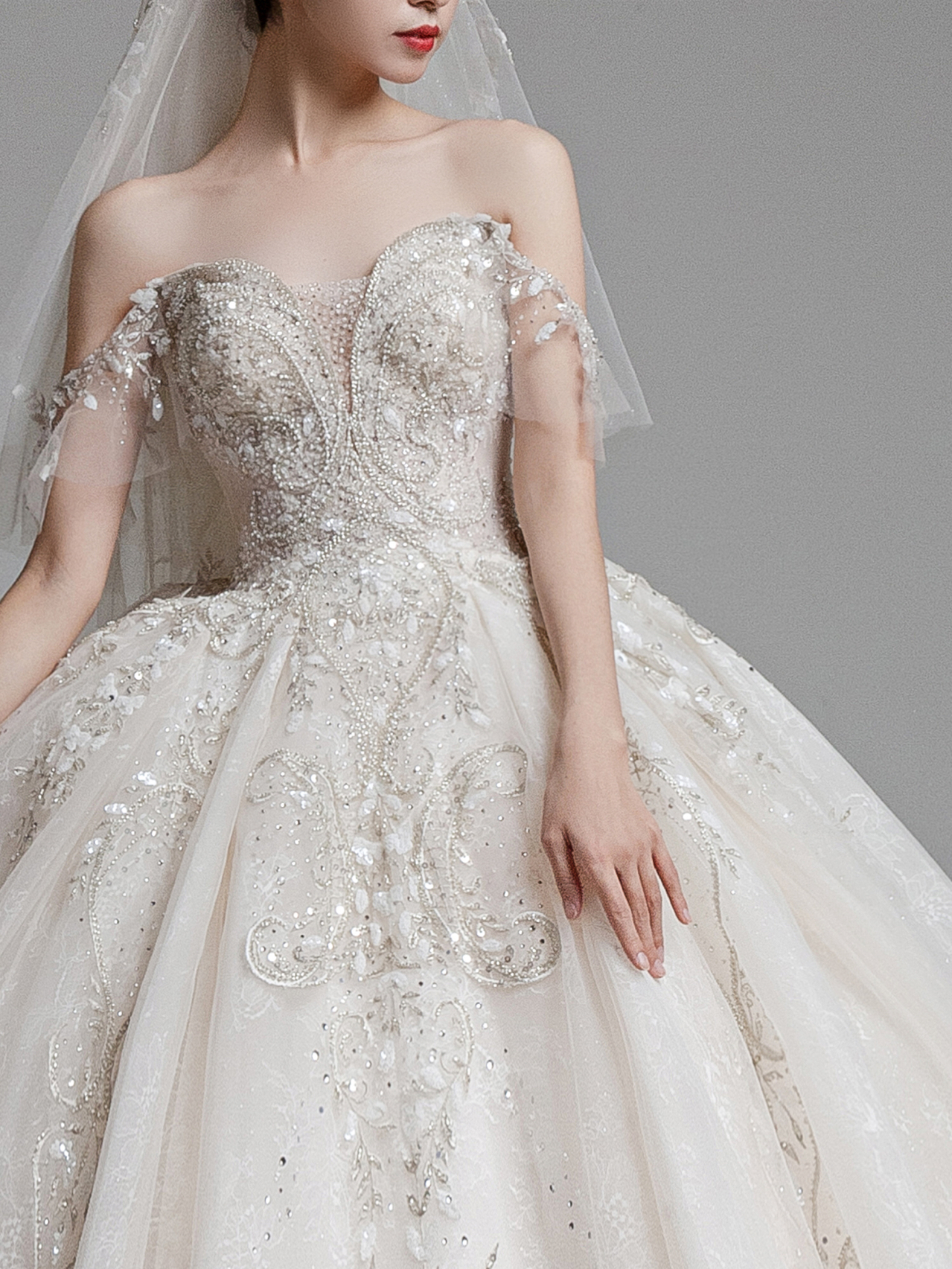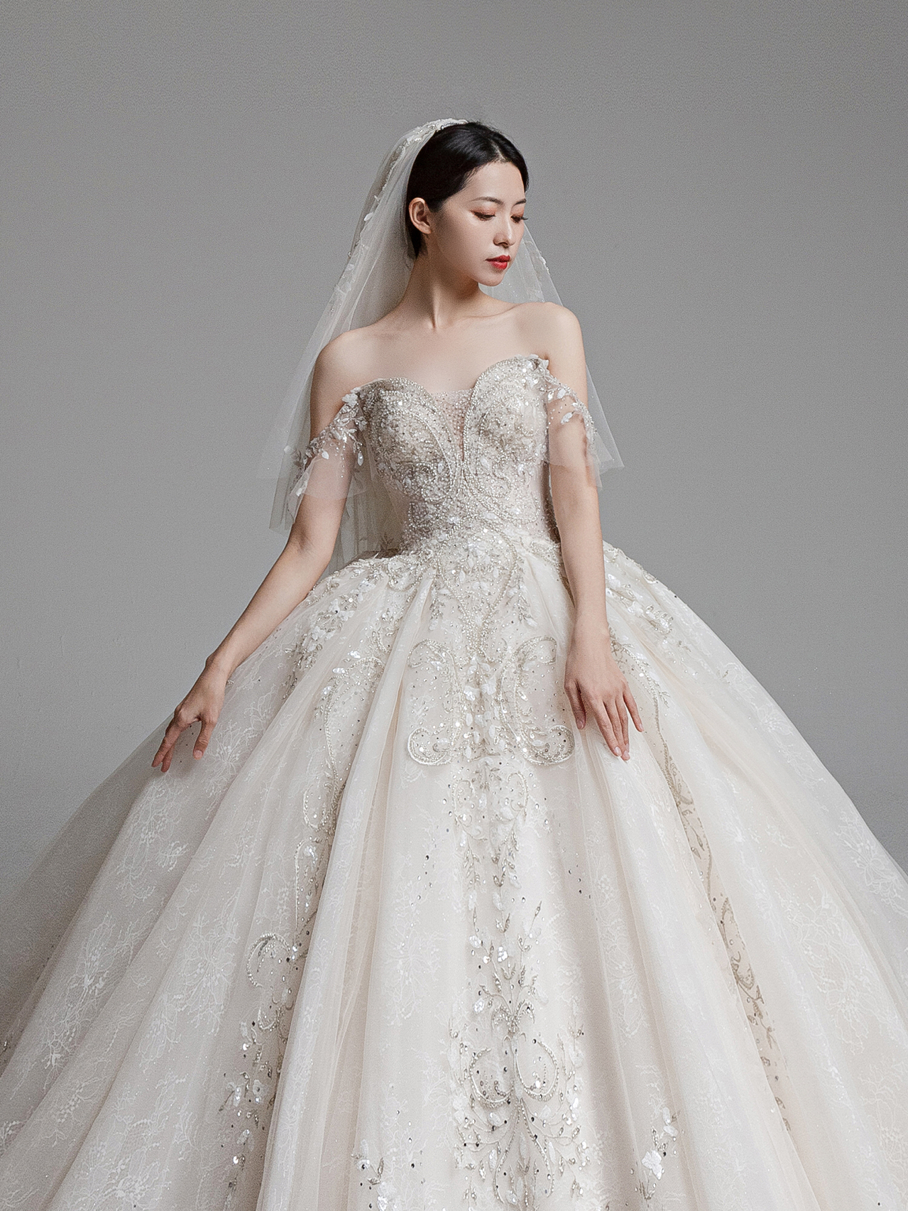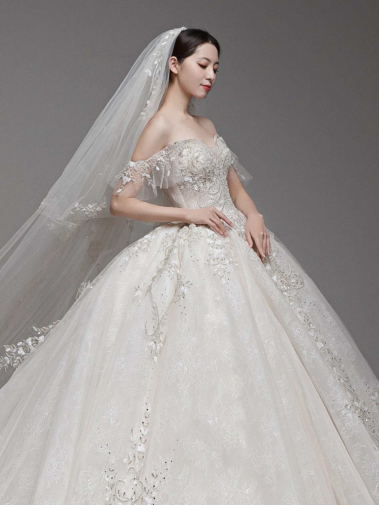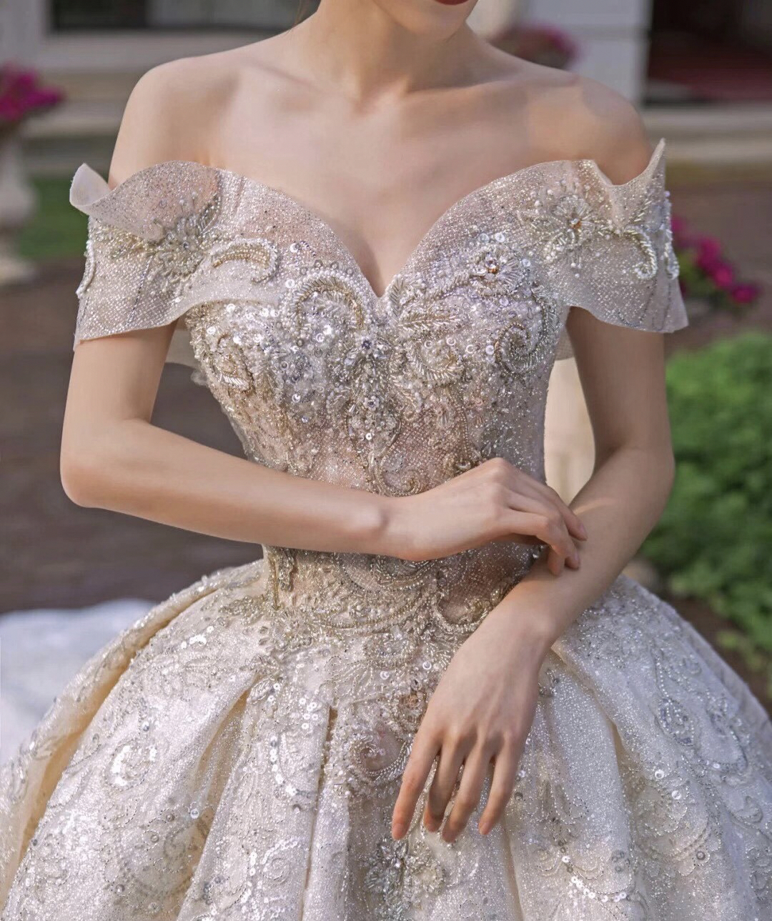 • 雲裳嫁衣馆# 钉珠与蕾丝交织下的婚纱唯妙俏丽轻纱装饰的一字肩设计巧妙绝伦下半身的宫廷感蓬蓬裙隆重而高贵