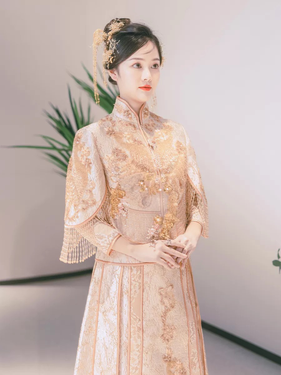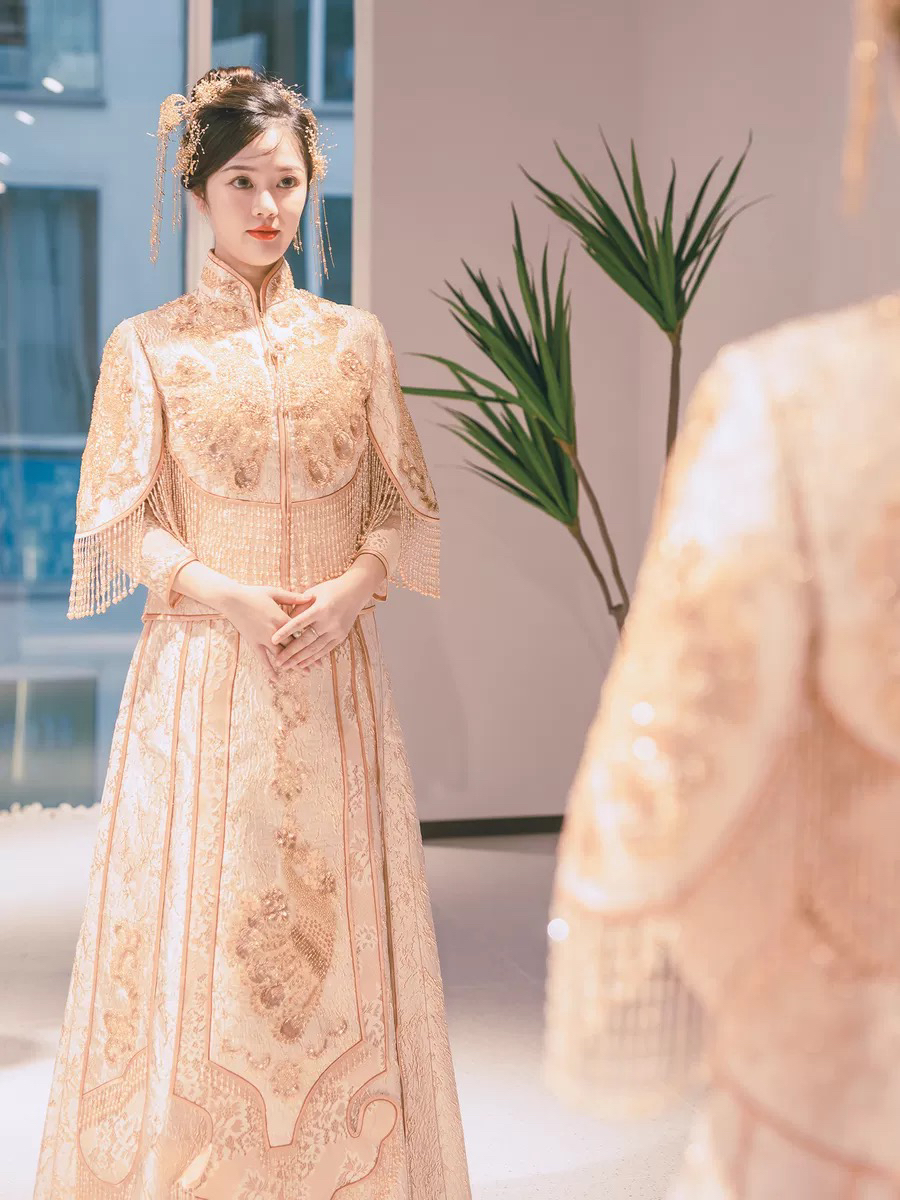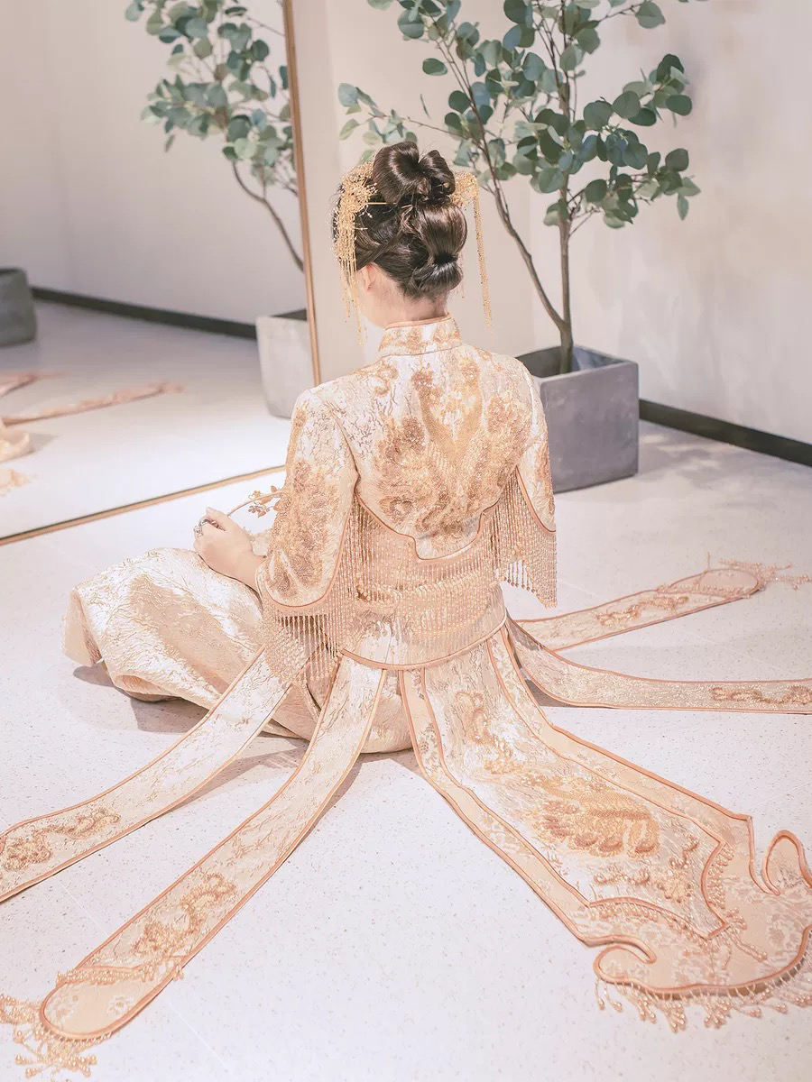 • 这款淡雅香槟金色秀禾服真的美到爆了适合场地:中式婚礼敬茶敬酒出门纱风格:清新甜美亮片与蕾丝刺绣工艺精湛凤凰图案栩栩如生最亮眼的是流苏珠子装饰散摆裙铺散开来美到不可言喻