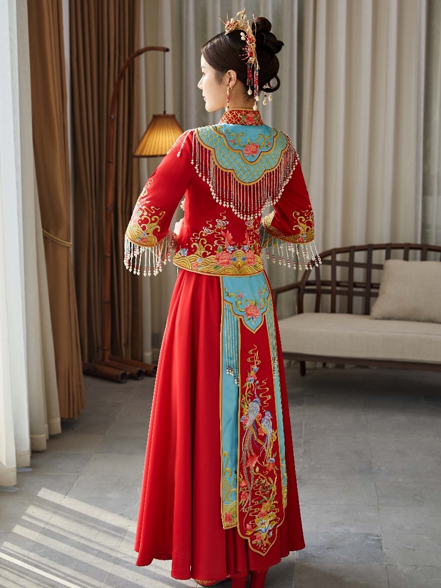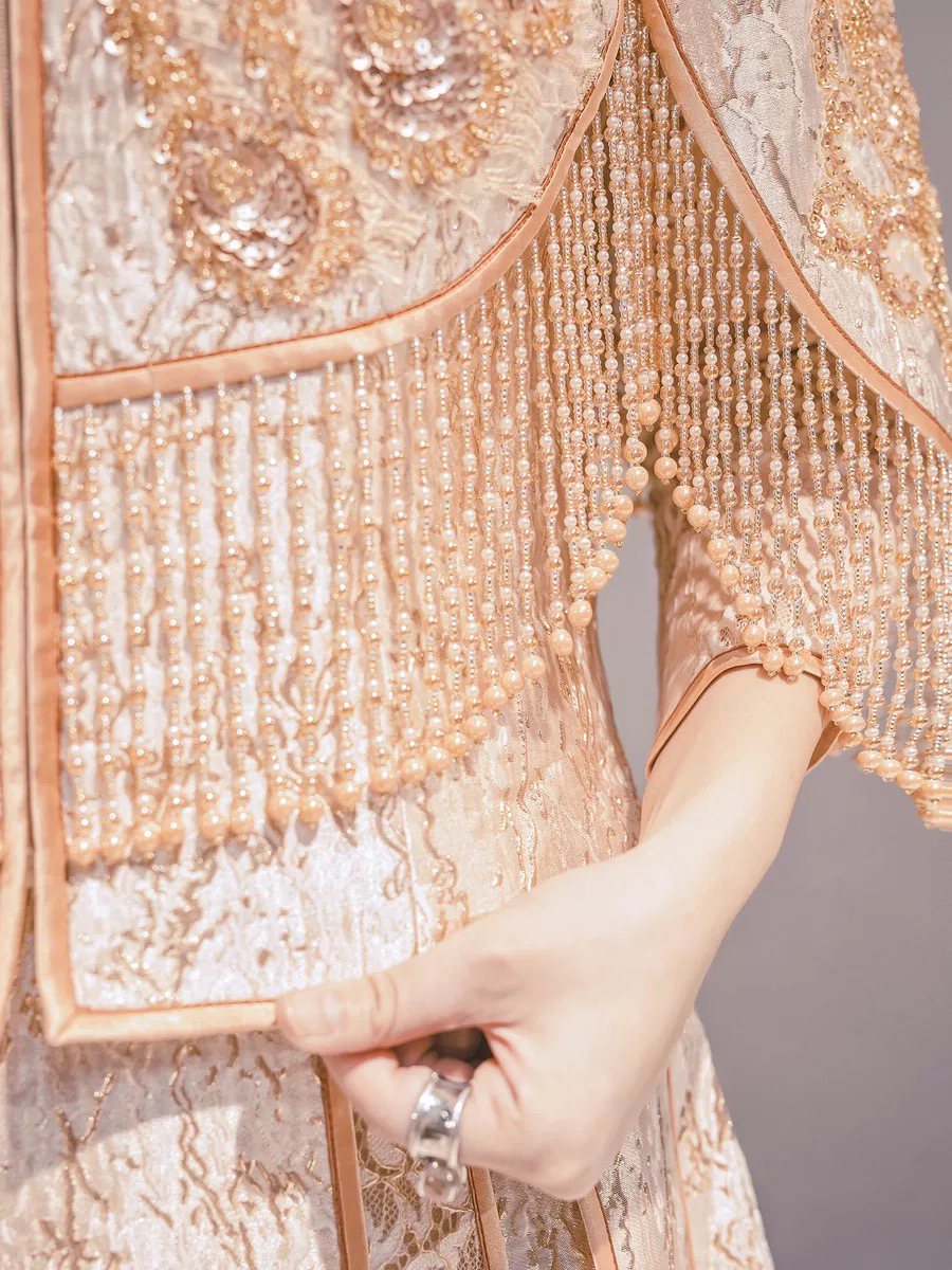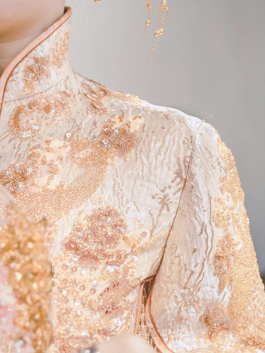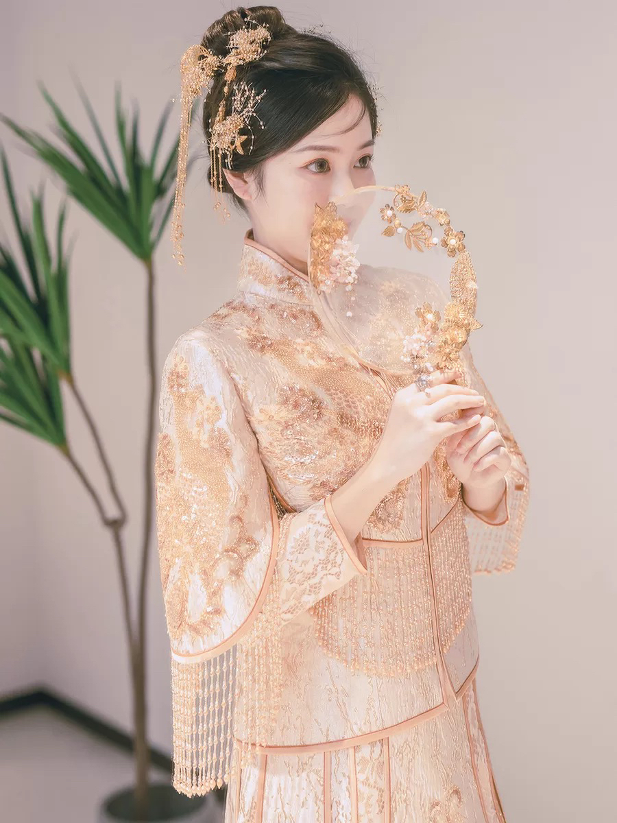 • 这款淡雅香槟金色秀禾服真的美到爆了适合场地:中式婚礼敬茶敬酒出门纱风格:清新甜美亮片与蕾丝刺绣工艺精湛凤凰图案栩栩如生最亮眼的是流苏珠子装饰散摆裙铺散开来美到不可言喻