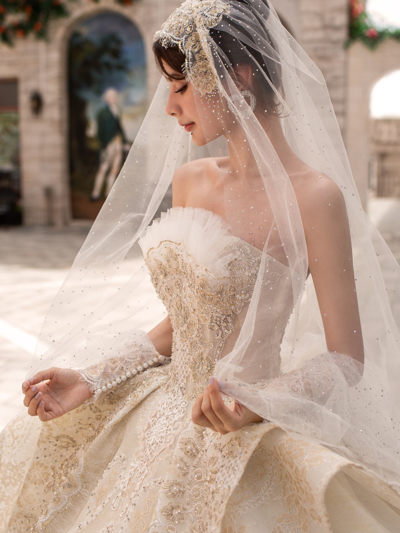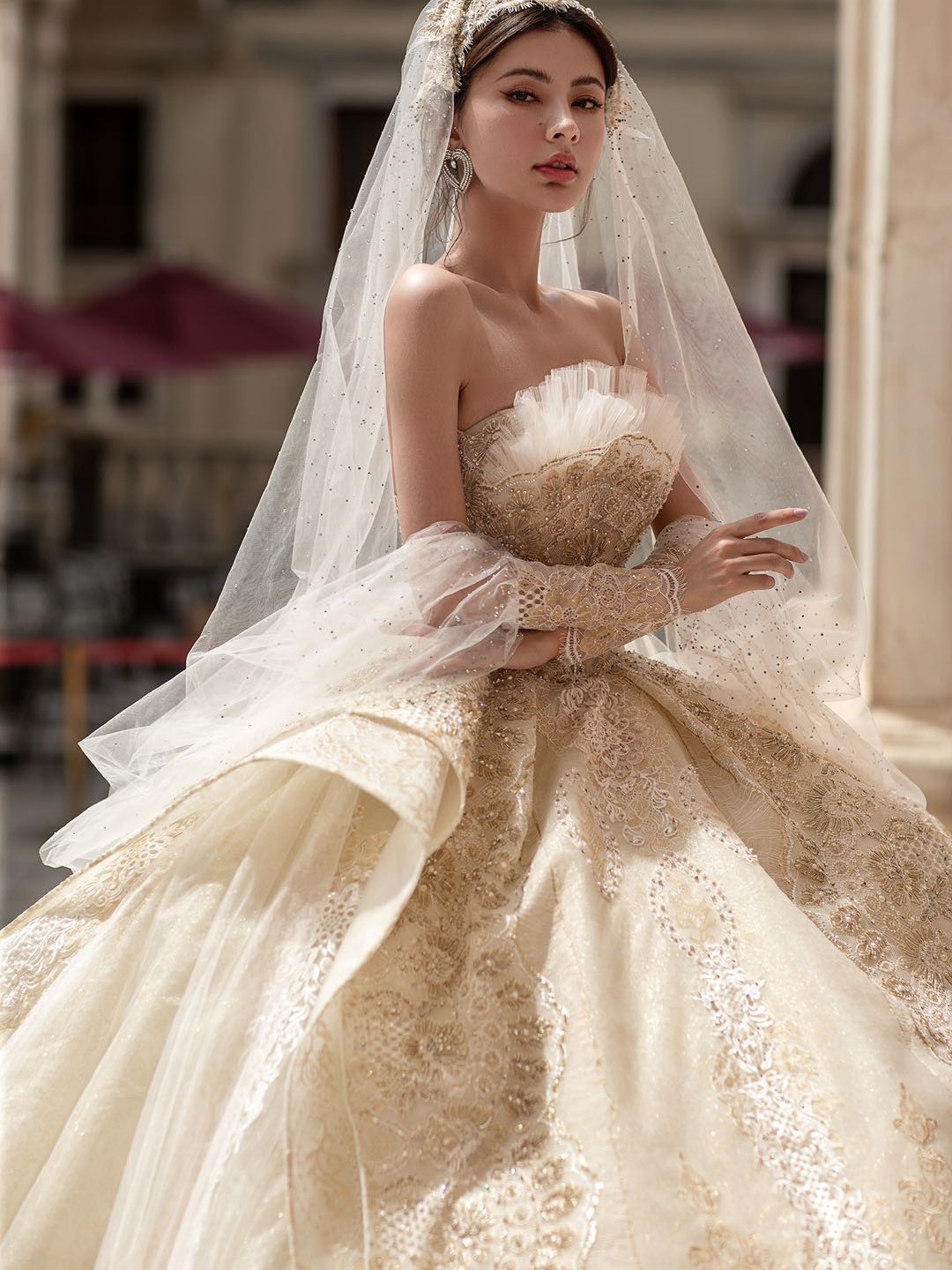 • 这是一款看到第一眼就俘获你的奢华主纱♥️✨复古鎏金刺绣搭配霸气长拖尾,一出场便是惊艳✨ 奢华手工钉珠一字肩修饰了手臂,看起来很纤细✨超强立体大裙摆与纤细腰身形成鲜明对比,窈窕身型完美呈现✨ 高级典雅的香槟色调,将复古宫廷风展现得淋漓尽致这件王炸主纱打造满满仪式感#