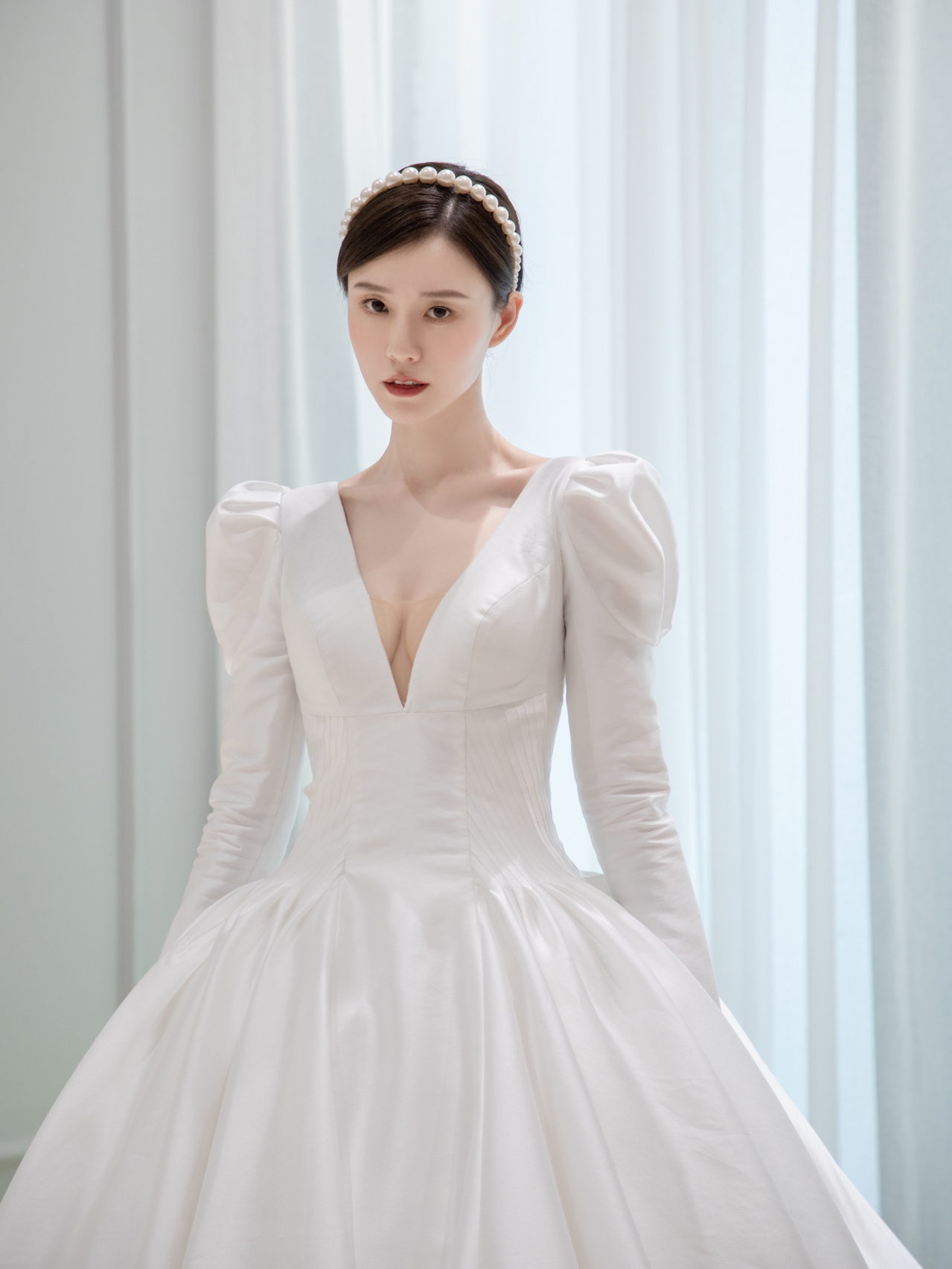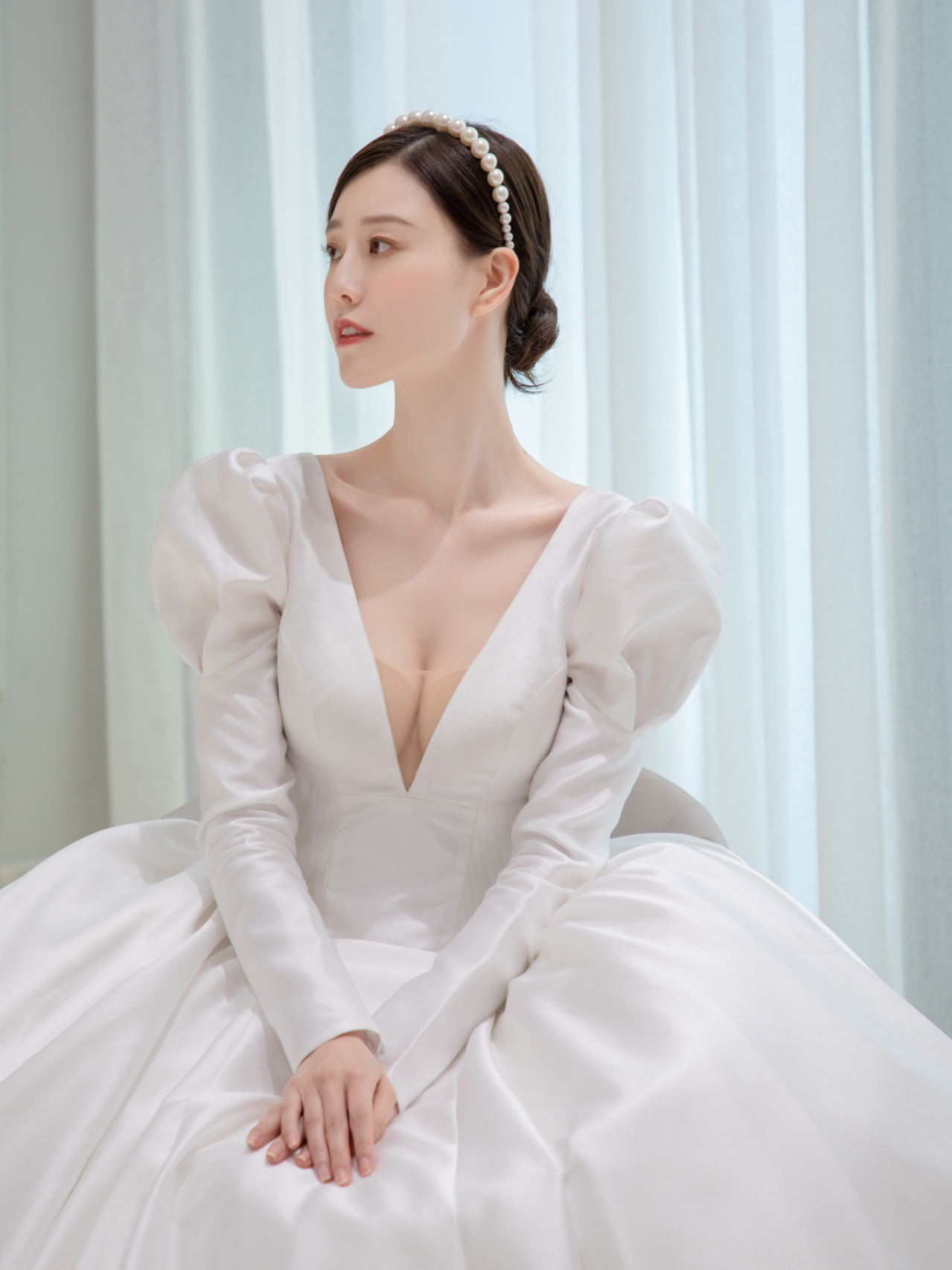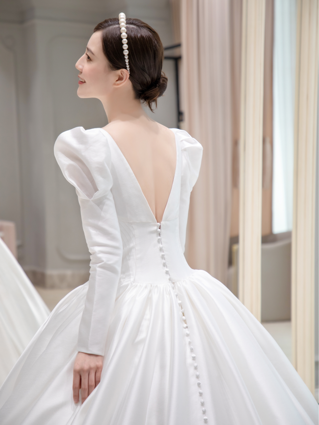 • 雲裳嫁衣馆#前后深V剪裁简洁而流畅多一些变幻多一些性感...珍珠发饰与缎面贝壳般的散发不染纤尘的纯净美..·当矜贵缎面遇上复古羊腿袖把经典演绎到极致皇室王妃非你莫属。