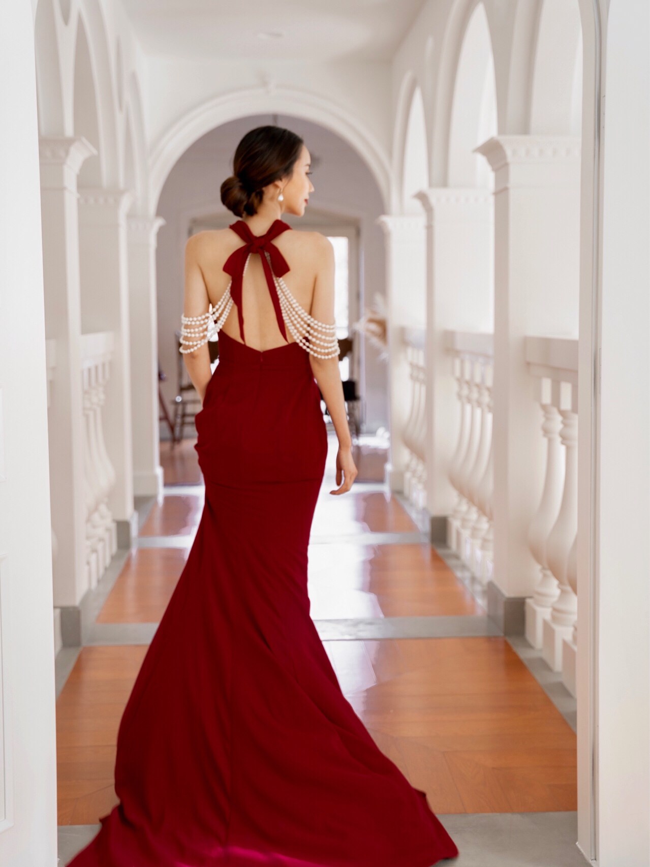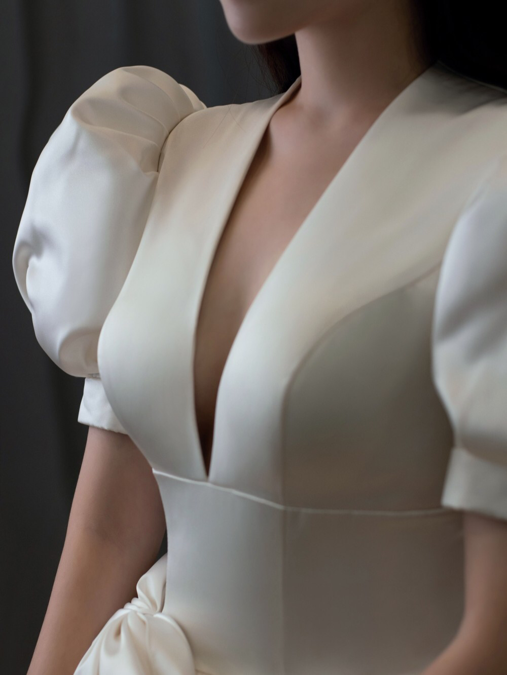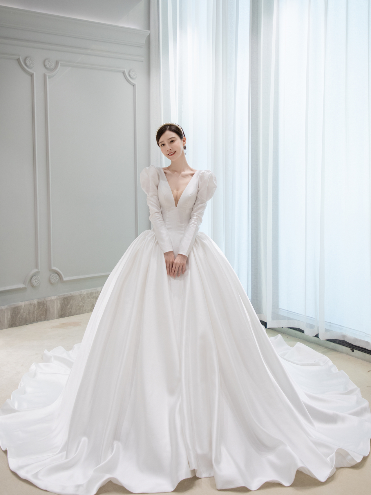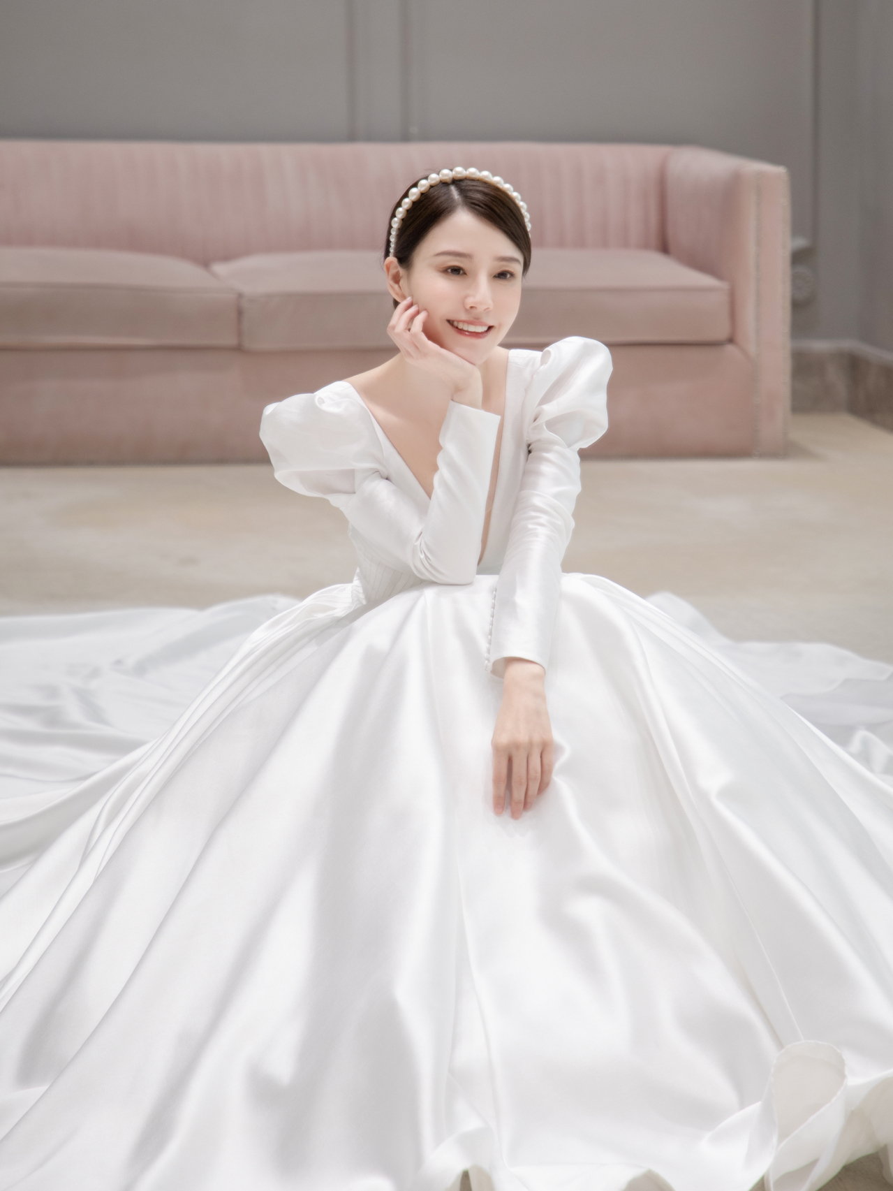 • 雲裳嫁衣馆#前后深V剪裁简洁而流畅多一些变幻多一些性感...珍珠发饰与缎面贝壳般的散发不染纤尘的纯净美..·当矜贵缎面遇上复古羊腿袖把经典演绎到极致皇室王妃非你莫属。