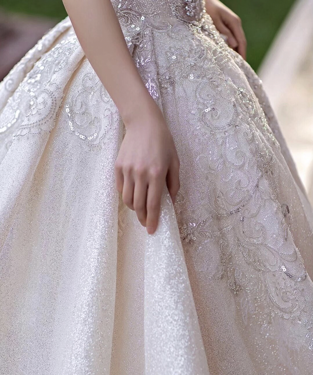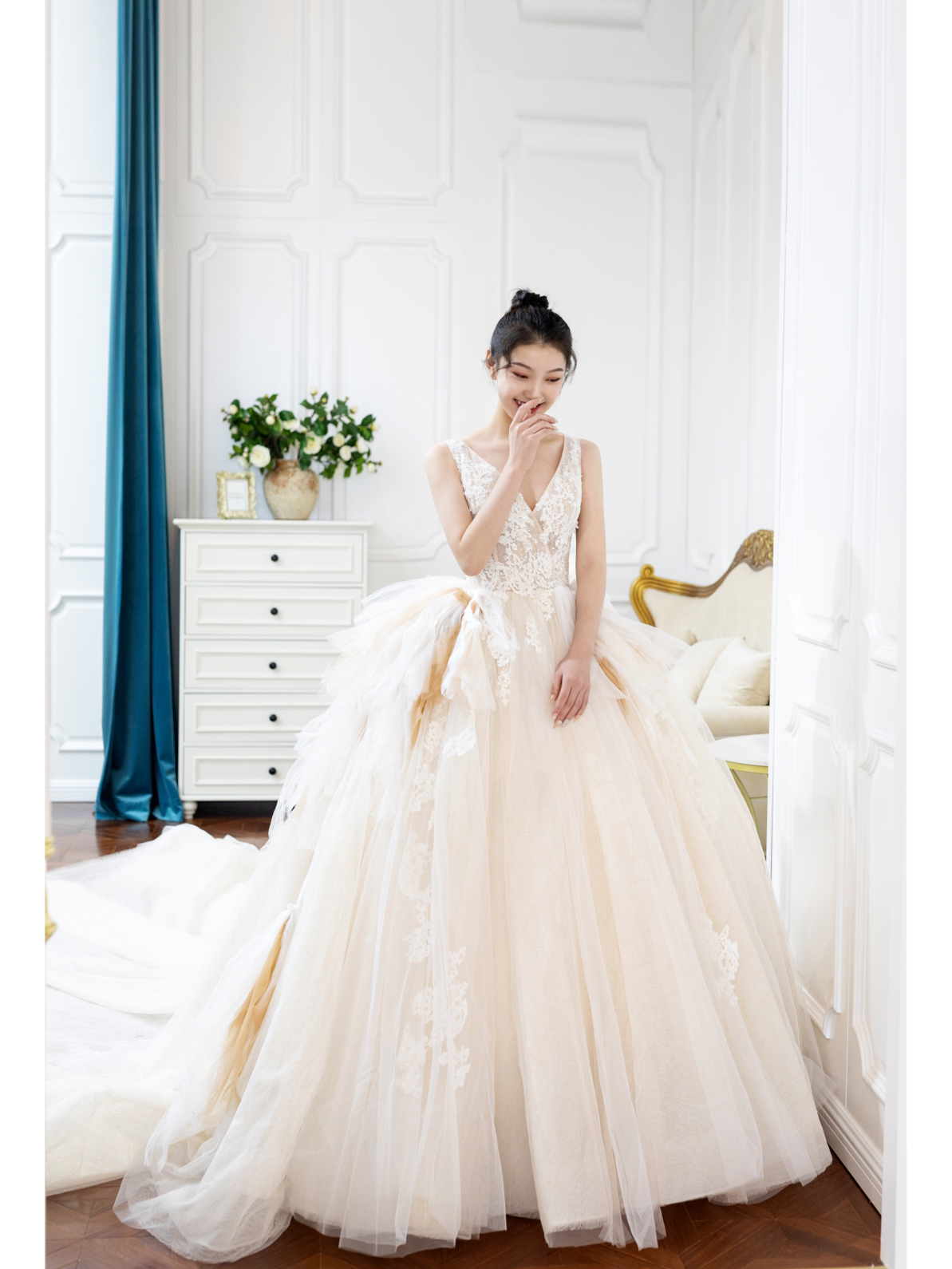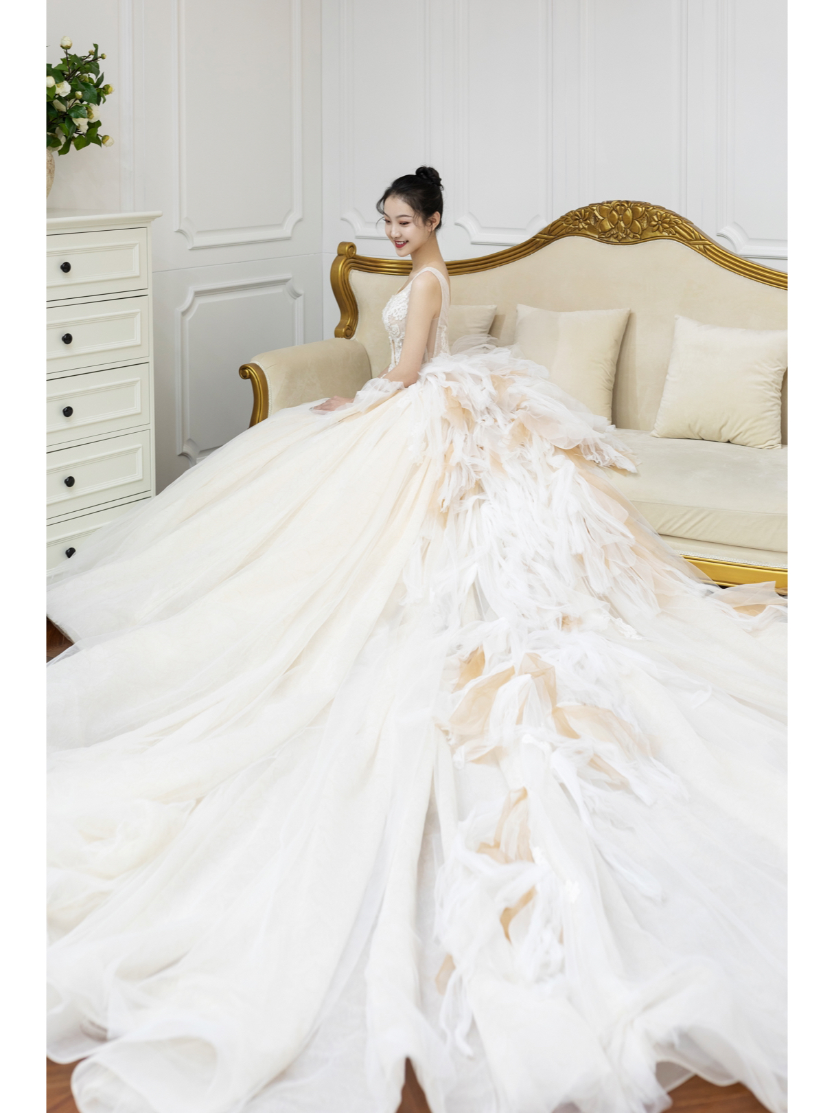 • 复古鎏金刺绣搭配霸气长拖尾,一出场便是惊艳奢华手工钉珠一字肩修饰了手臂看起来很纤细超强立体大裙摆与纤细腰身形成鲜明的对比窈窕身形完美呈现高级典雅的香槟色调,讲复古宫廷风展现的淋漓尽致这件王炸主纱打造满满的仪式感