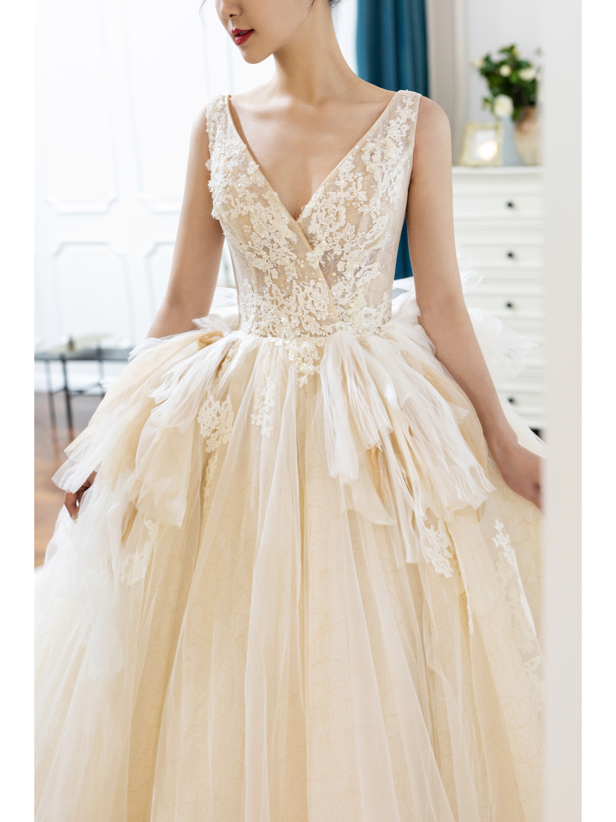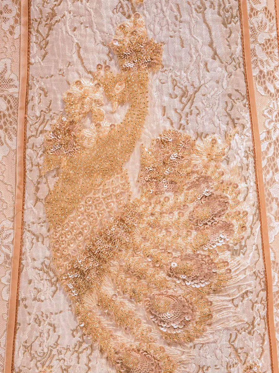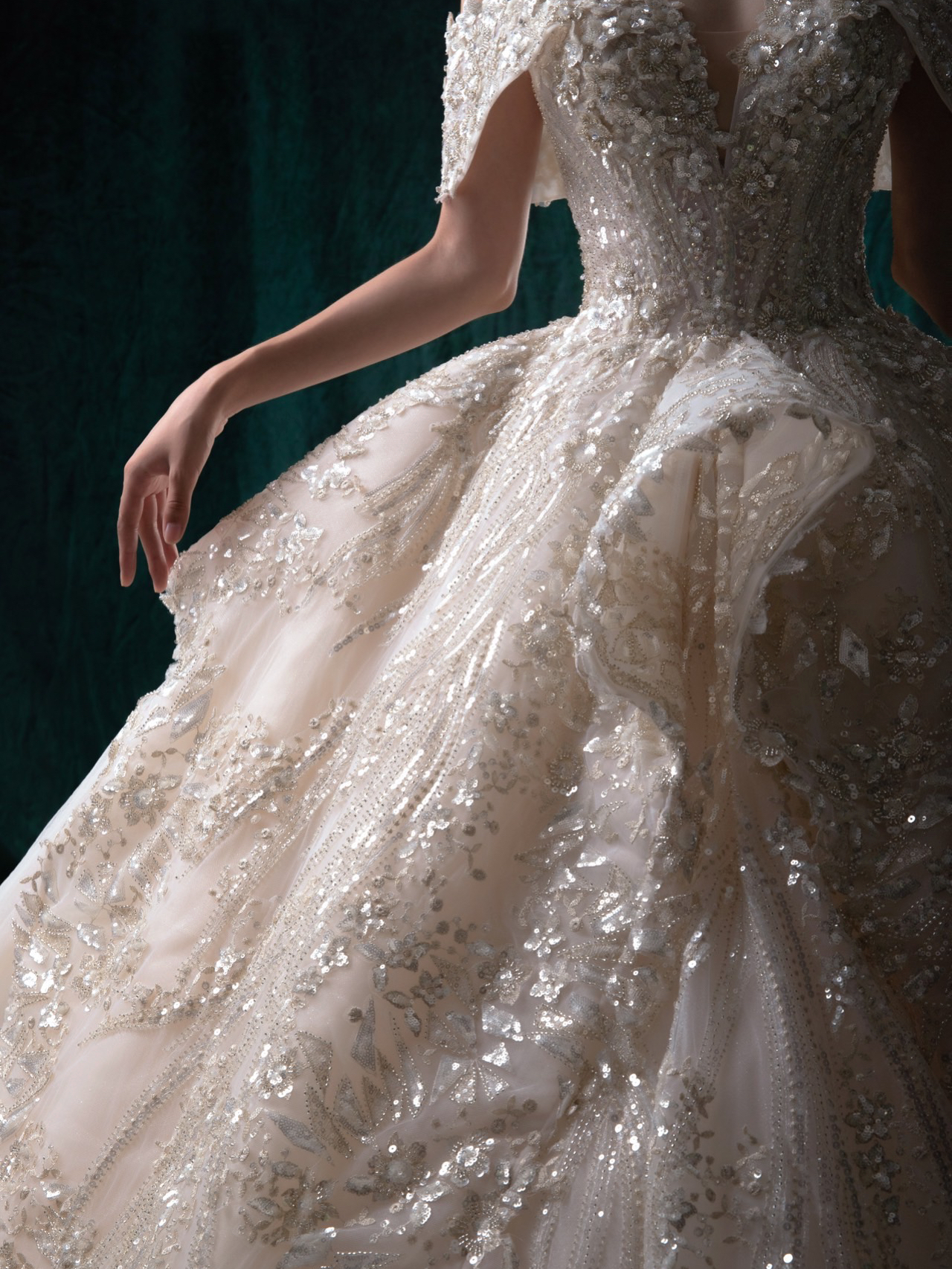 • 复古鎏金刺绣搭配霸气长拖尾,一出场便是惊艳奢华手工钉珠一字肩修饰了手臂看起来很纤细超强立体大裙摆与纤细腰身形成鲜明的对比窈窕身形完美呈现高级典雅的香槟色调,讲复古宫廷风展现的淋漓尽致这件王炸主纱打造满满的仪式感