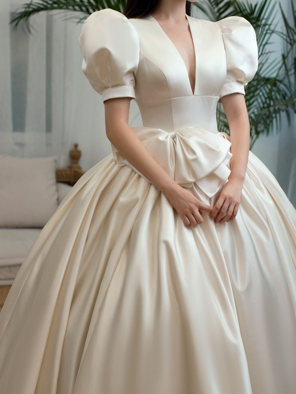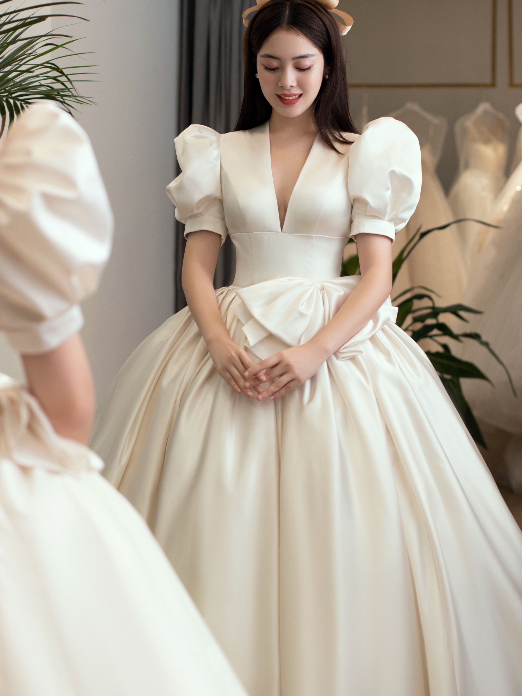 • 菏泽雲裳嫁衣馆|🔥惊艳的缎面婚纱|🔥缎面材质➕泡泡袖设计➕蝴蝶结元素🔥 🌹这不就童年梦想中“白雪公主”的样子吗❓ 🌹拥有它一次,会打开你新世界的大门🏰因为你从未觉得婚纱还会这么梦幻💯 ✨✨✨✨ 💄进口珍珠缎面,视觉丝滑柔润,材质本身略带珠光,仿佛油画般的高级质感[赞R] 🌈百年皇室血统,沉淀的精湛工艺,出场自带高贵典雅光环😇 💄显瘦V领➕高腰设计,完美拉长身材比例,性感又端庄。极具特点的泡泡袖,配上超级蓬松的大裙摆,简直是公主婚纱必备的元素[哇R] 💄腰部蝴蝶结🎀锦上添花,唤醒童年的公主梦,可爱精致,又能与婚纱完美融为一体[色色R] 💄到底是哪位公主遗失的嫁衣❓还在等什么,快来@雲裳嫁衣馆 带走它❗️ ✨✨✨✨
