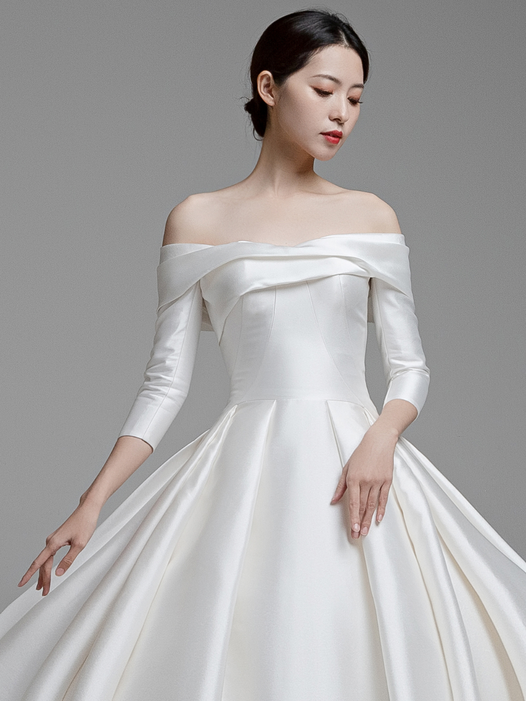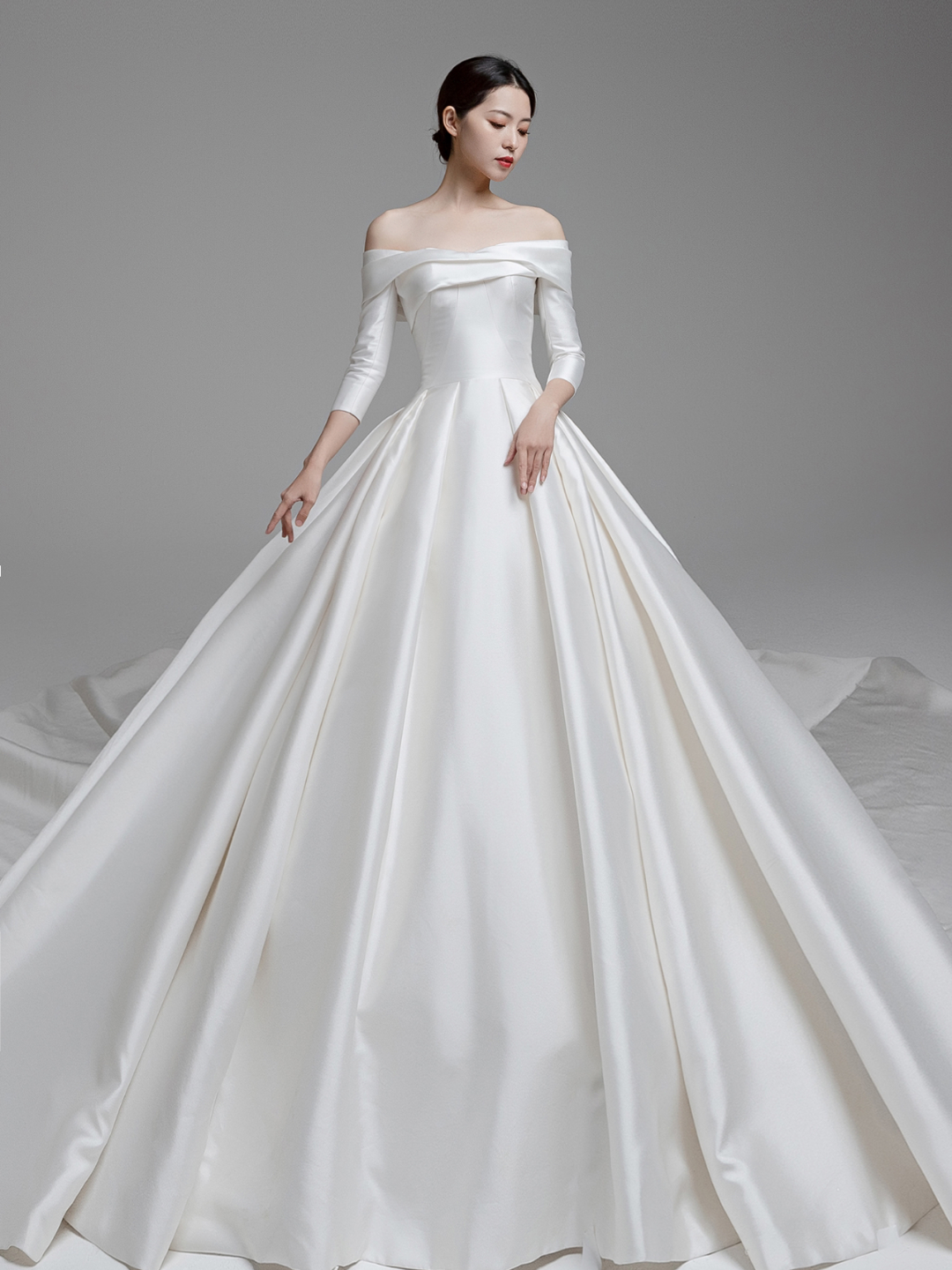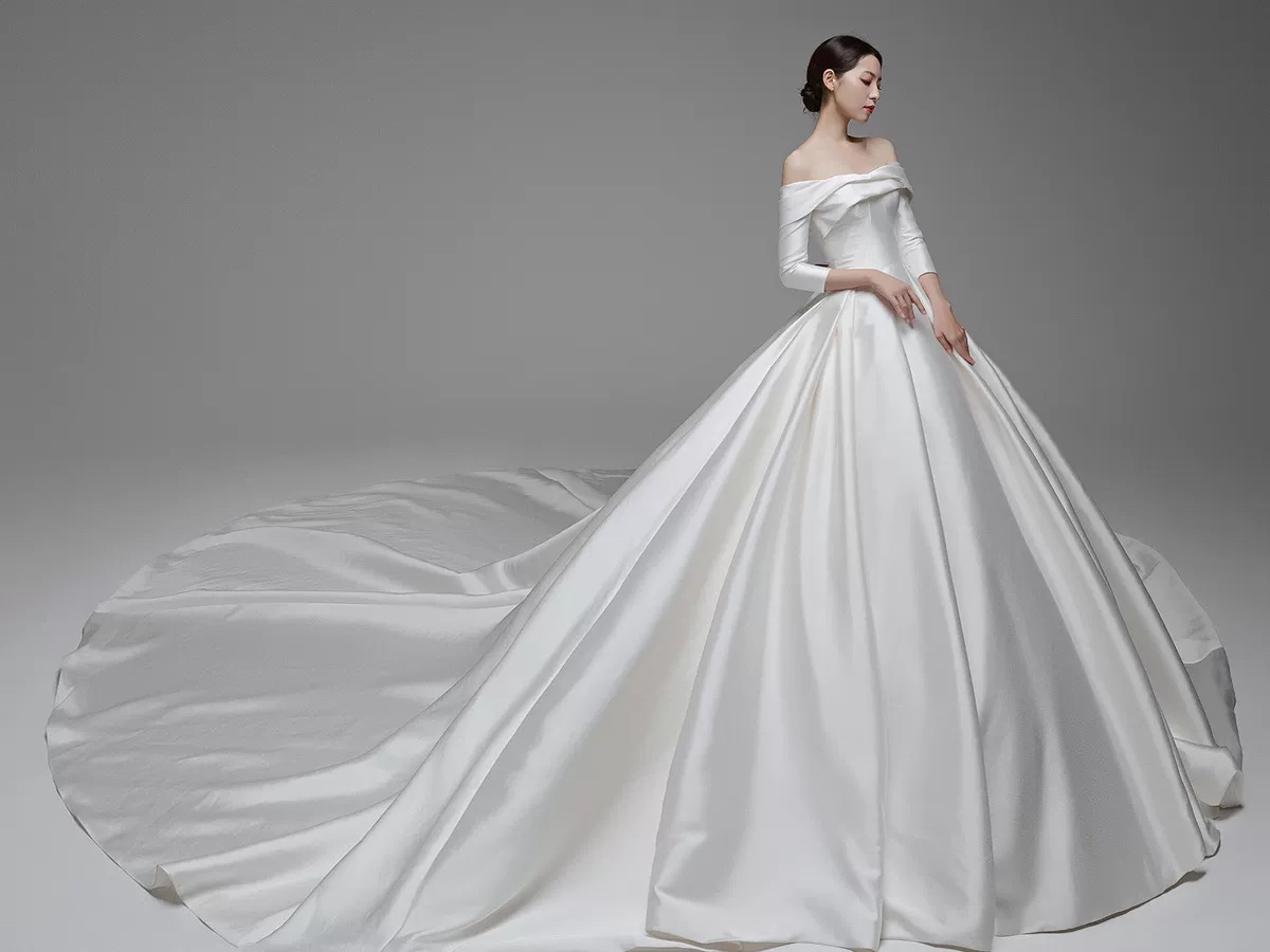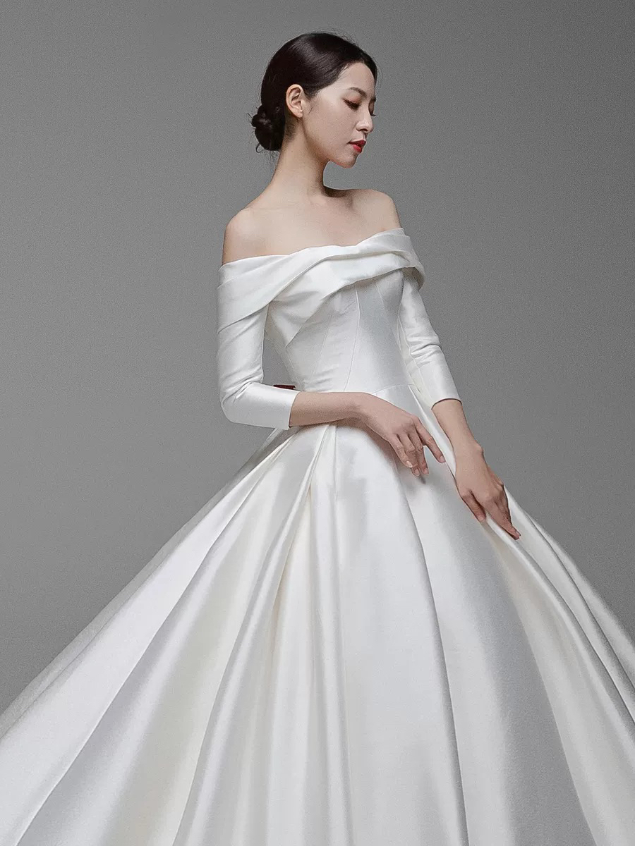 • #纯缎面的设计元素带给婚礼慢慢高级感~颜值与气质爆表的这款缎面婚纱层叠一字肩设计生动而有亮点七分袖设计及时在秋冬季节也可很好的驾驭整体的珠光质感高贵而大气极了
