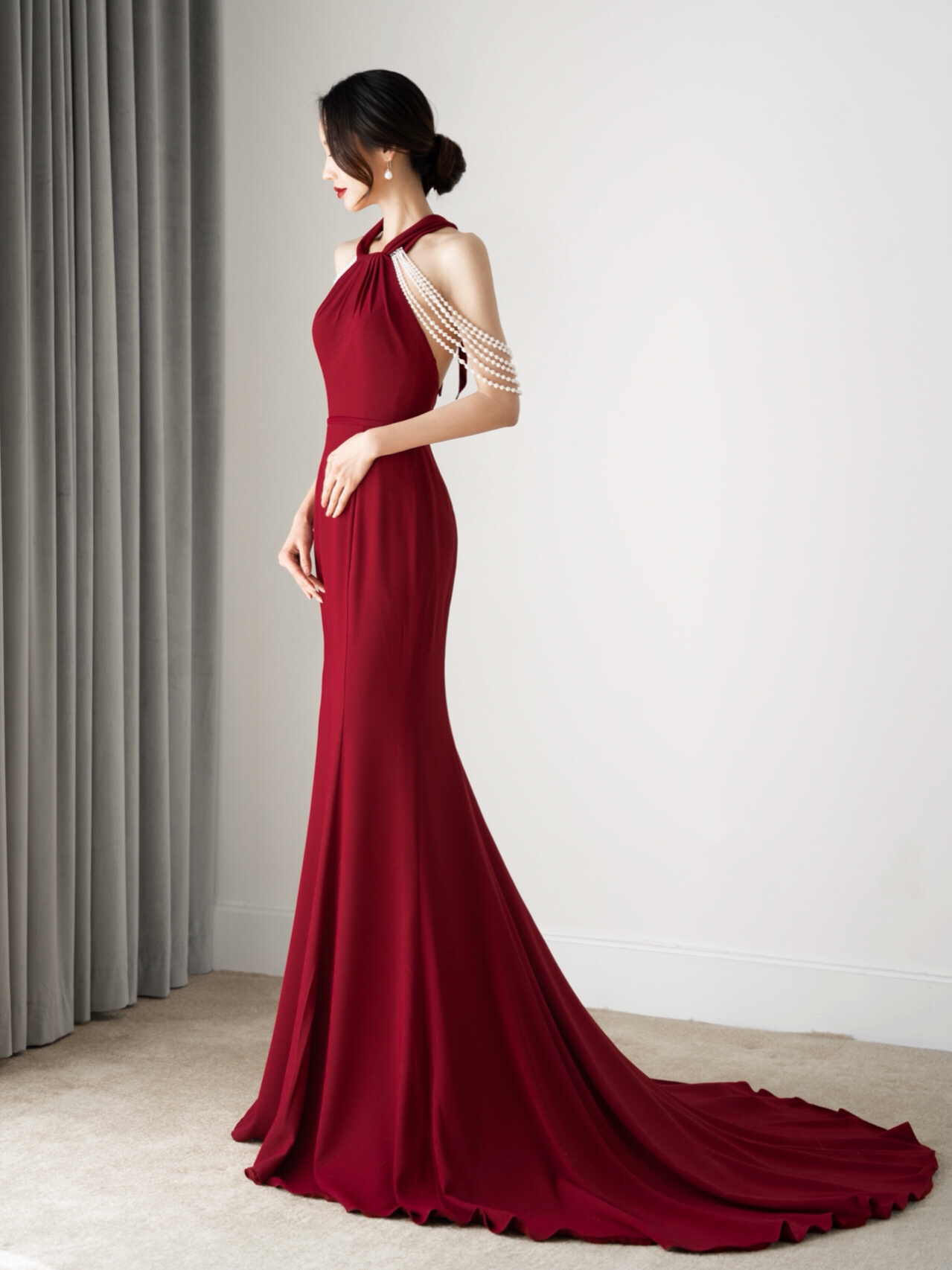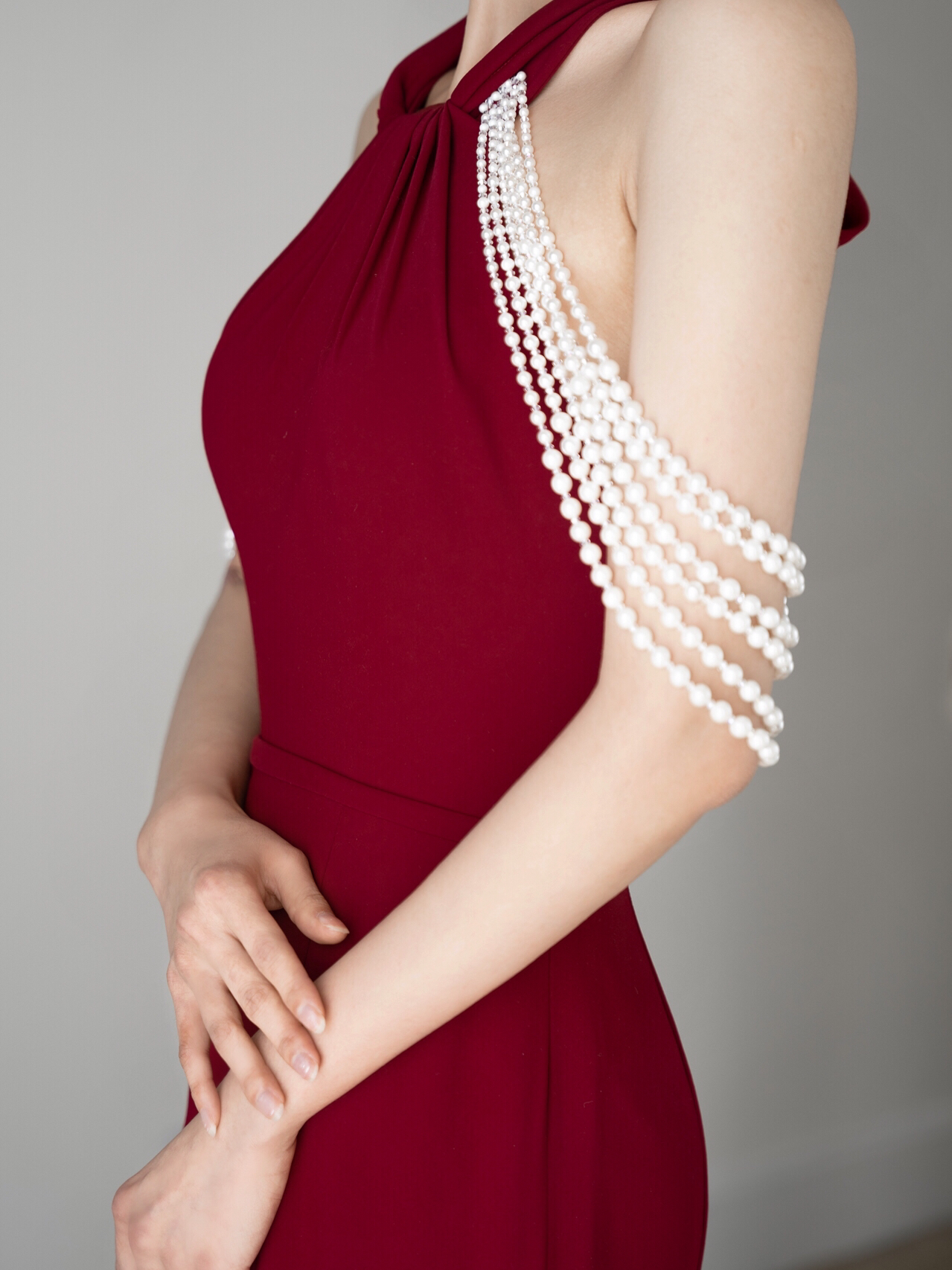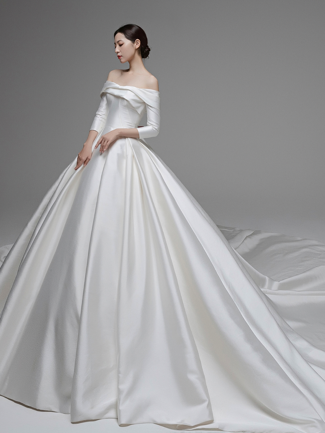 • #纯缎面的设计元素带给婚礼慢慢高级感~颜值与气质爆表的这款缎面婚纱层叠一字肩设计生动而有亮点七分袖设计及时在秋冬季节也可很好的驾驭整体的珠光质感高贵而大气极了