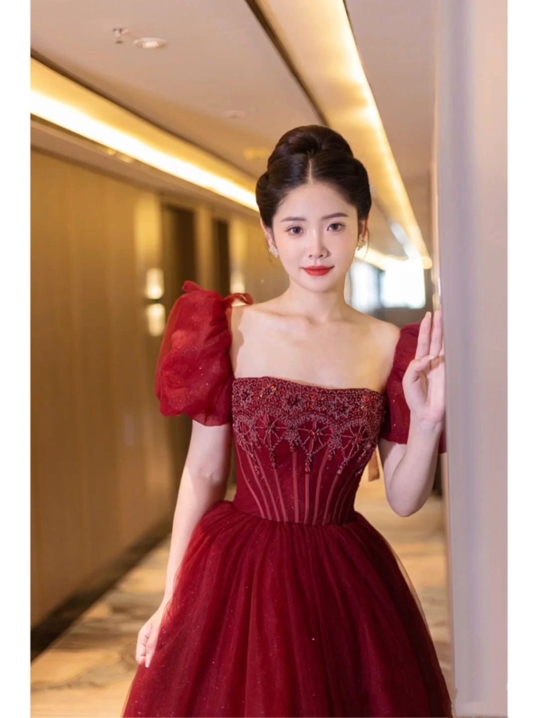 伊嫁婚纱新款一字领红色敬酒服