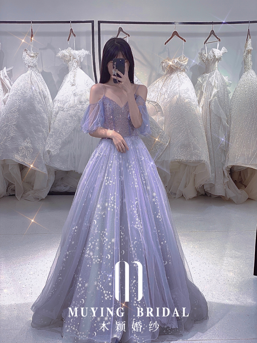 银河系蓝色星空一字肩礼服