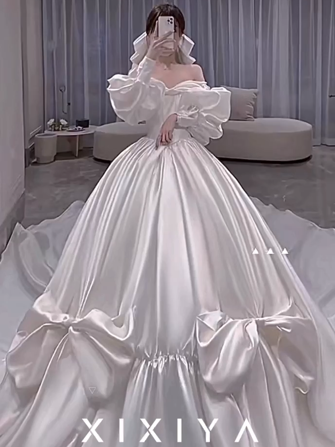 芭比娃娃大蝴蝶结长袖缎面婚纱