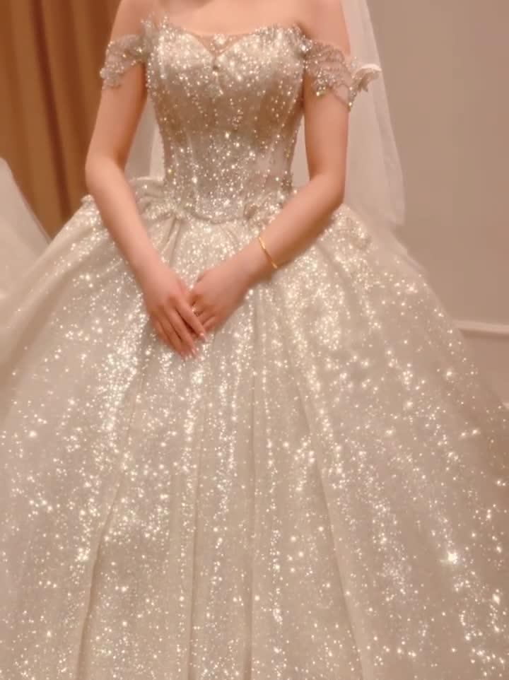 一字肩与哦为闪闪婚纱