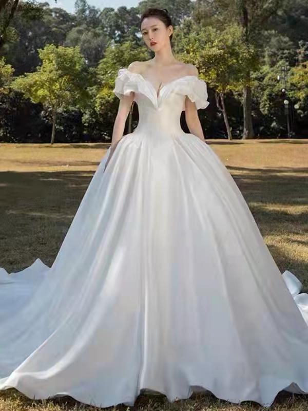 一字肩缎面白纱