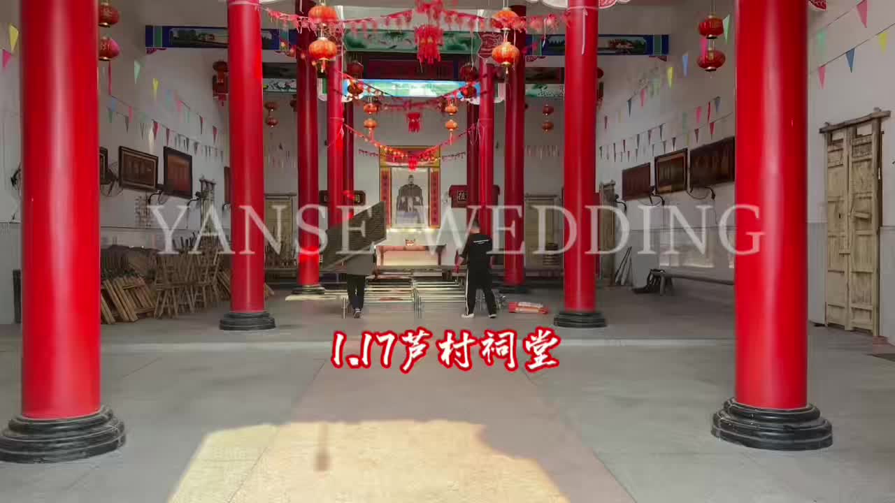 朱红布幔映衬宗祠