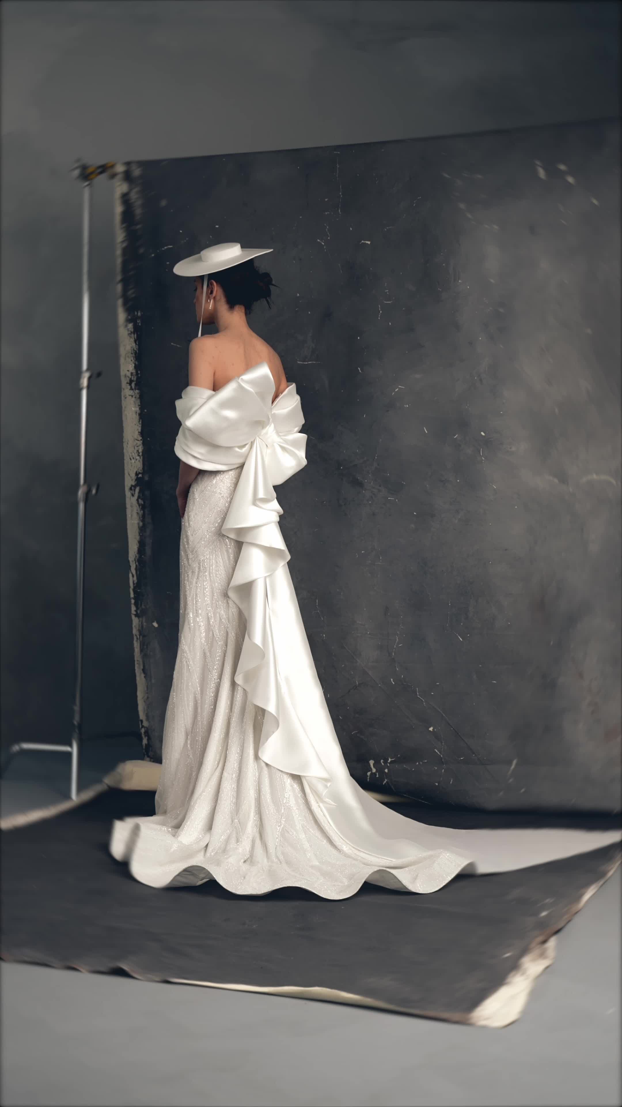 缎面吊带一字肩鱼尾主纱